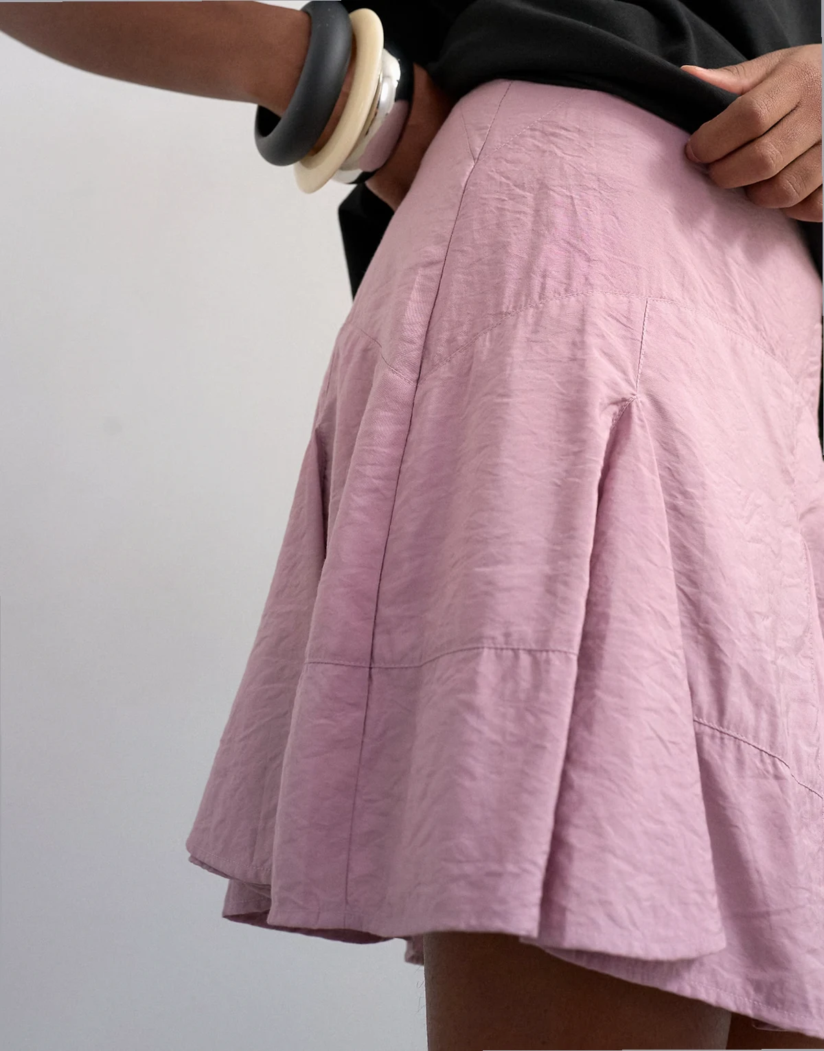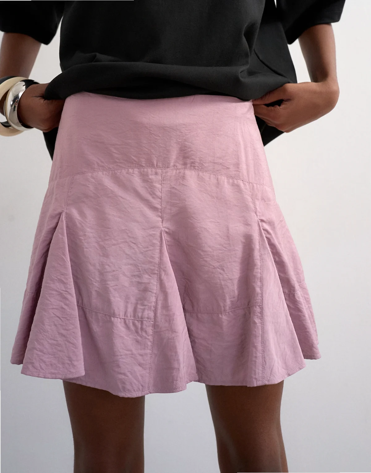Dieser Rock ist aus gewebtem Stoff in Flieder gefertigt. Das Modell hat einen hohen Bund, einen Godet-Saum, einen seitlichen Reißverschluss und eine reguläre Passform.