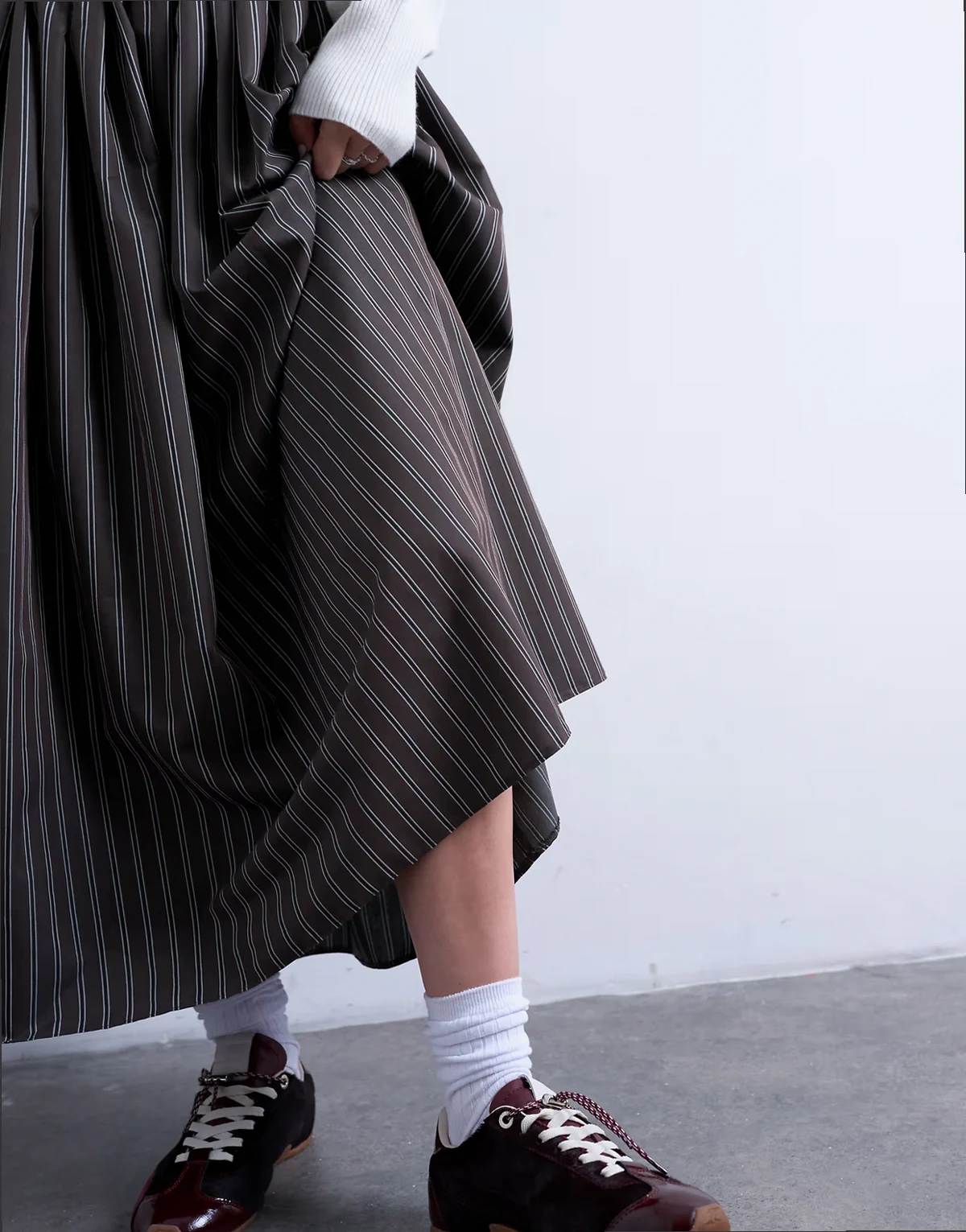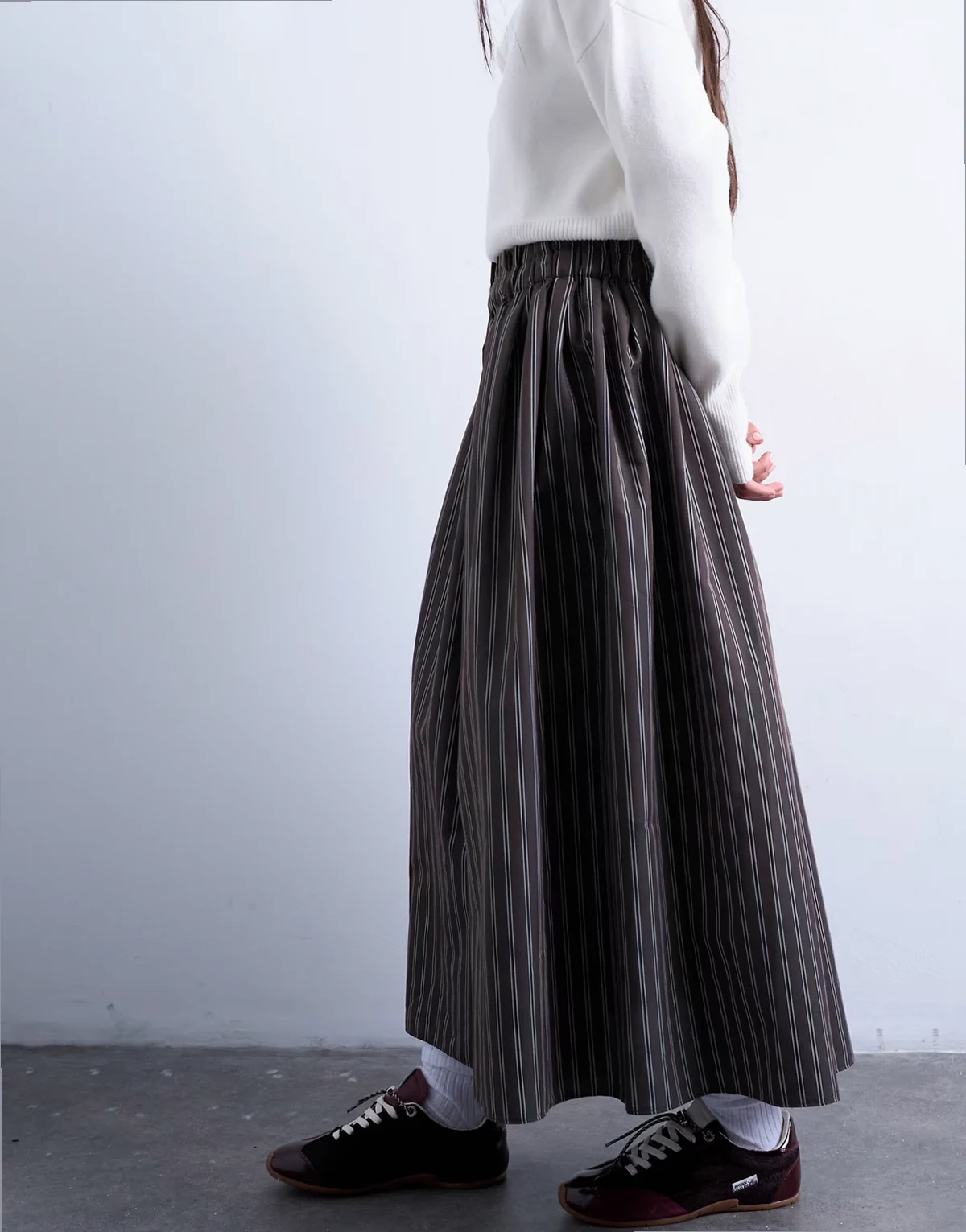 Dieser Rock ist aus einem leichten Webstoff mit All-over-Streifenmuster in Kontrastfarben gefertigt. Er verfügt über einen hohen, elastischen Taillenbund und ein Tellerdesign. Das Modell hat eine reguläre Passform und Maxilänge.
