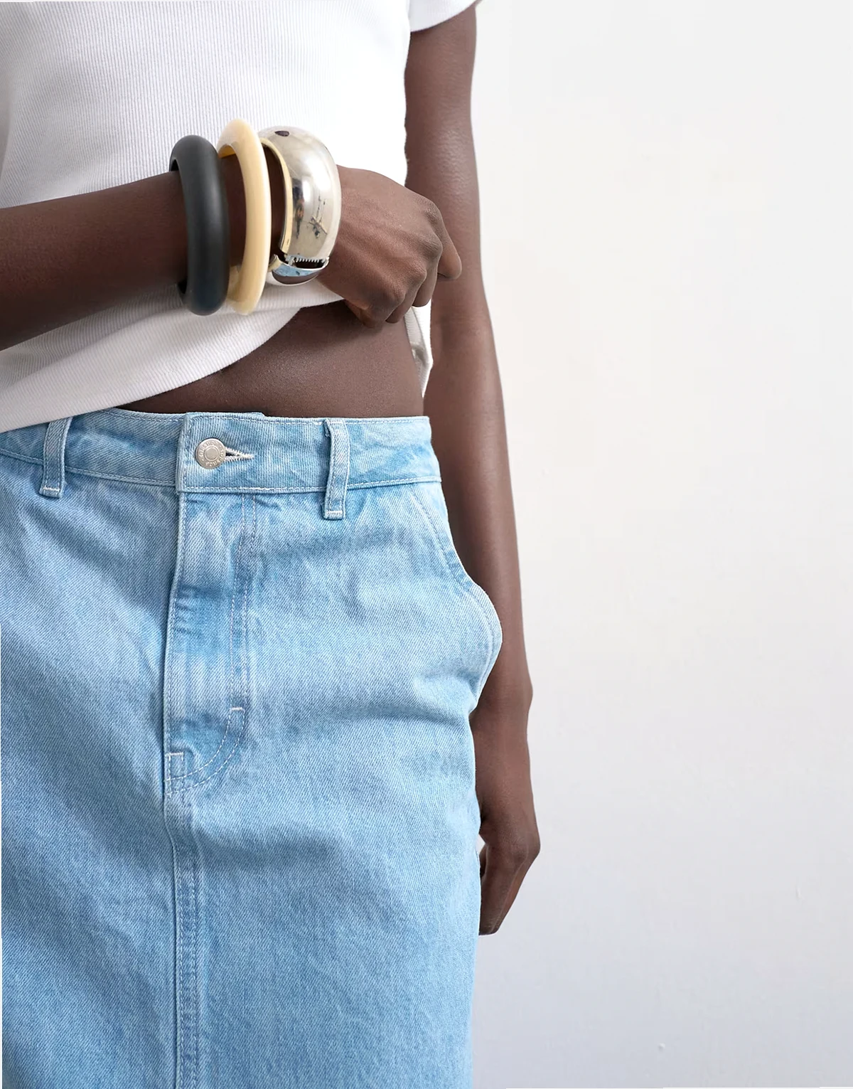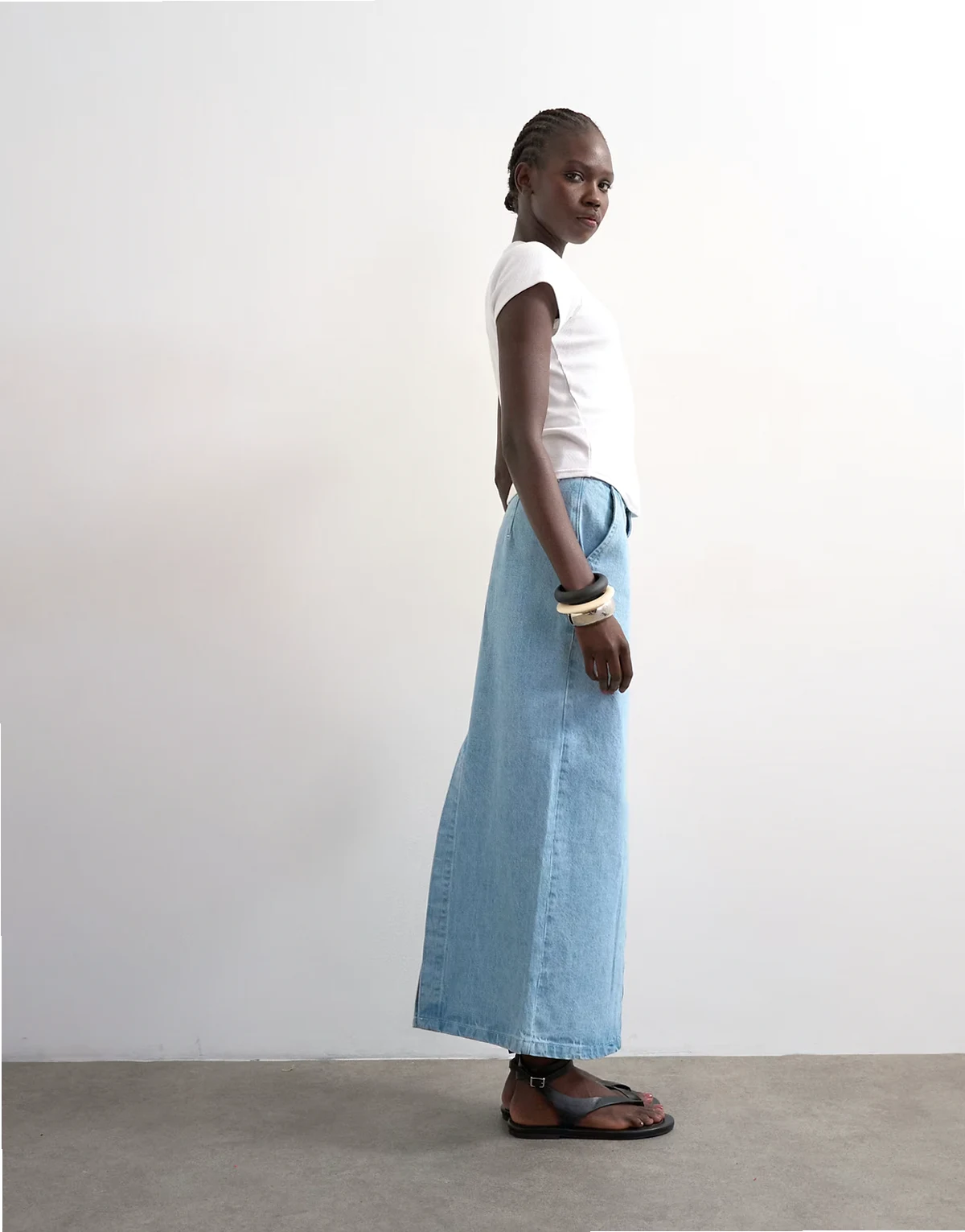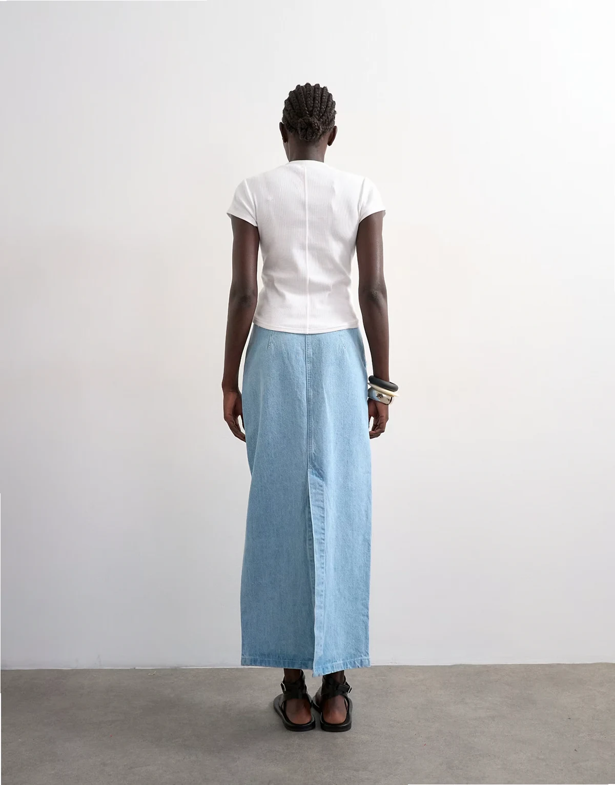 Dieser Rock ist aus Denim ohne Stretchanteil in einer gebleichten blauen Waschung gefertigt. Er verfügt über einen hohen Bund, Gürtelschlaufen, einen verdeckten Hosenschlitz und funktionale Taschen. Das Modell ist in Maxilänge geschnitten und hat eine reguläre Passform.