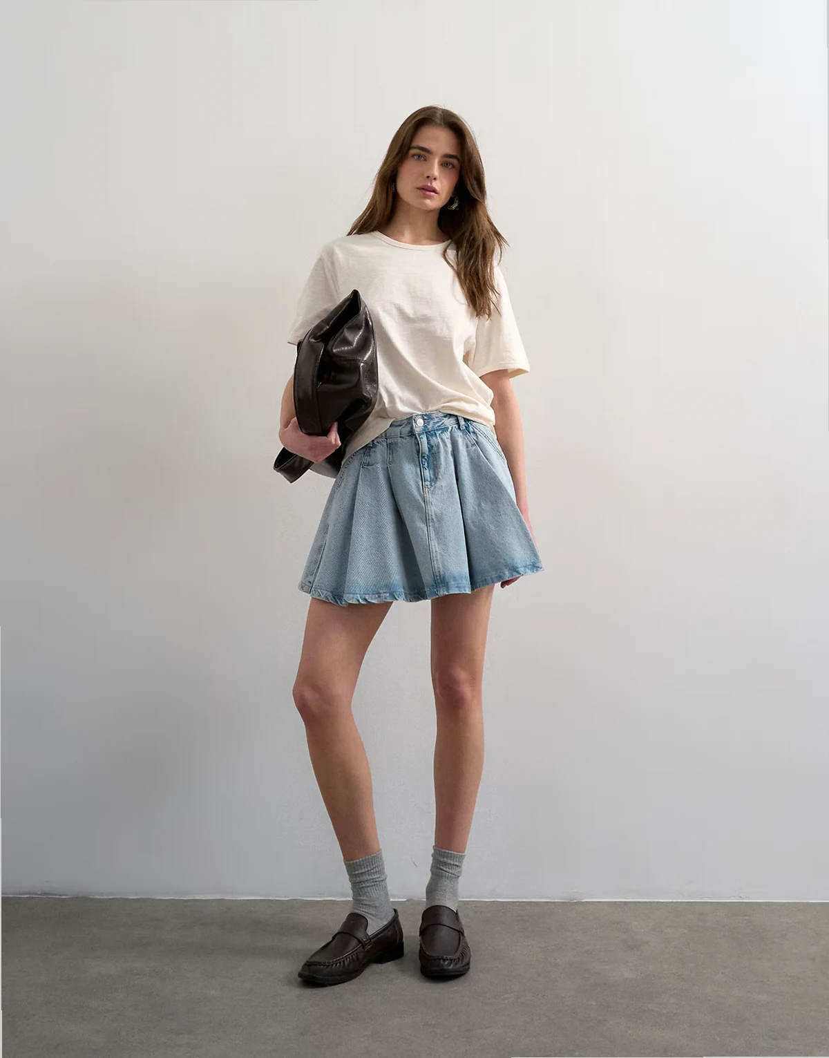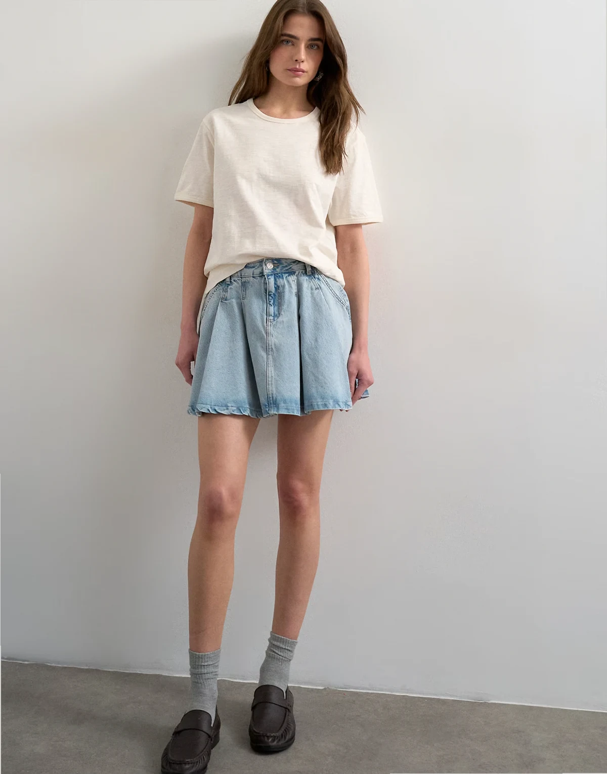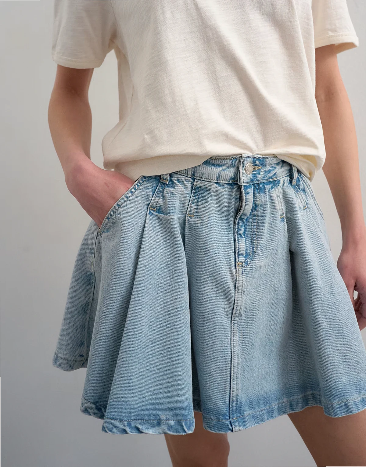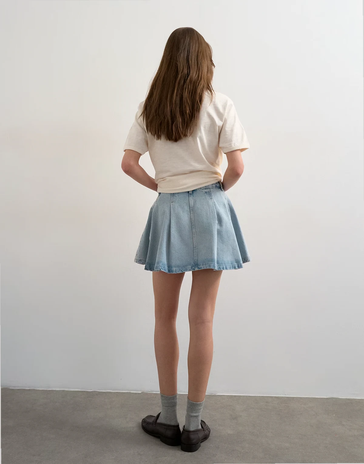 Dieser Rock ist aus Denim ohne Stretchanteil in einer hellblauen Waschung gefertigt. Das Modell hat ein plissiertes Design mit Gürtelschlaufen und Seitentaschen. Es hat eine reguläre Passform.
