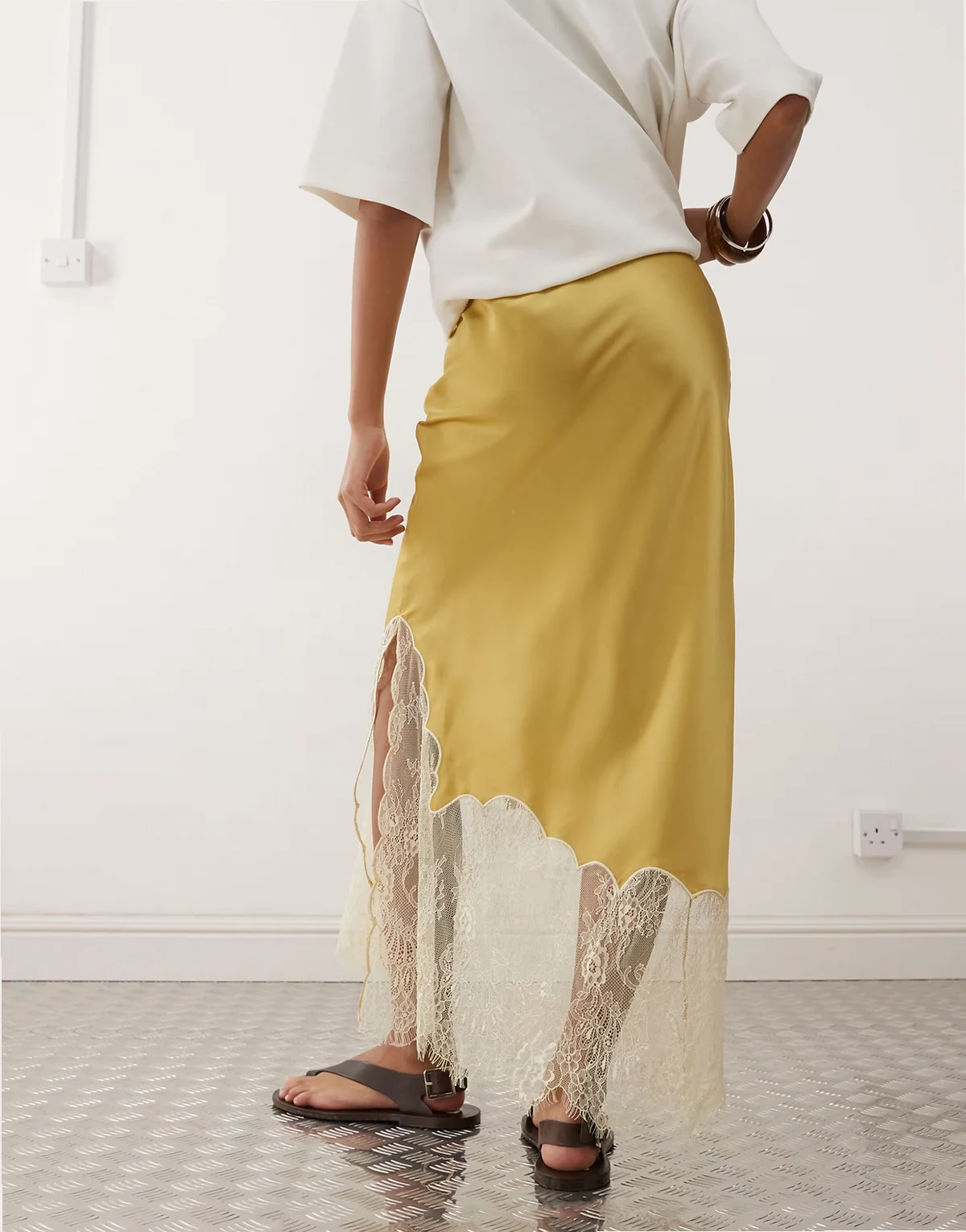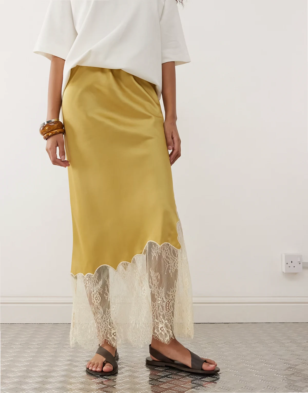 – Satin-Midirock in Gold mit asymmetrischem Saum und Spitzeneinsatz
