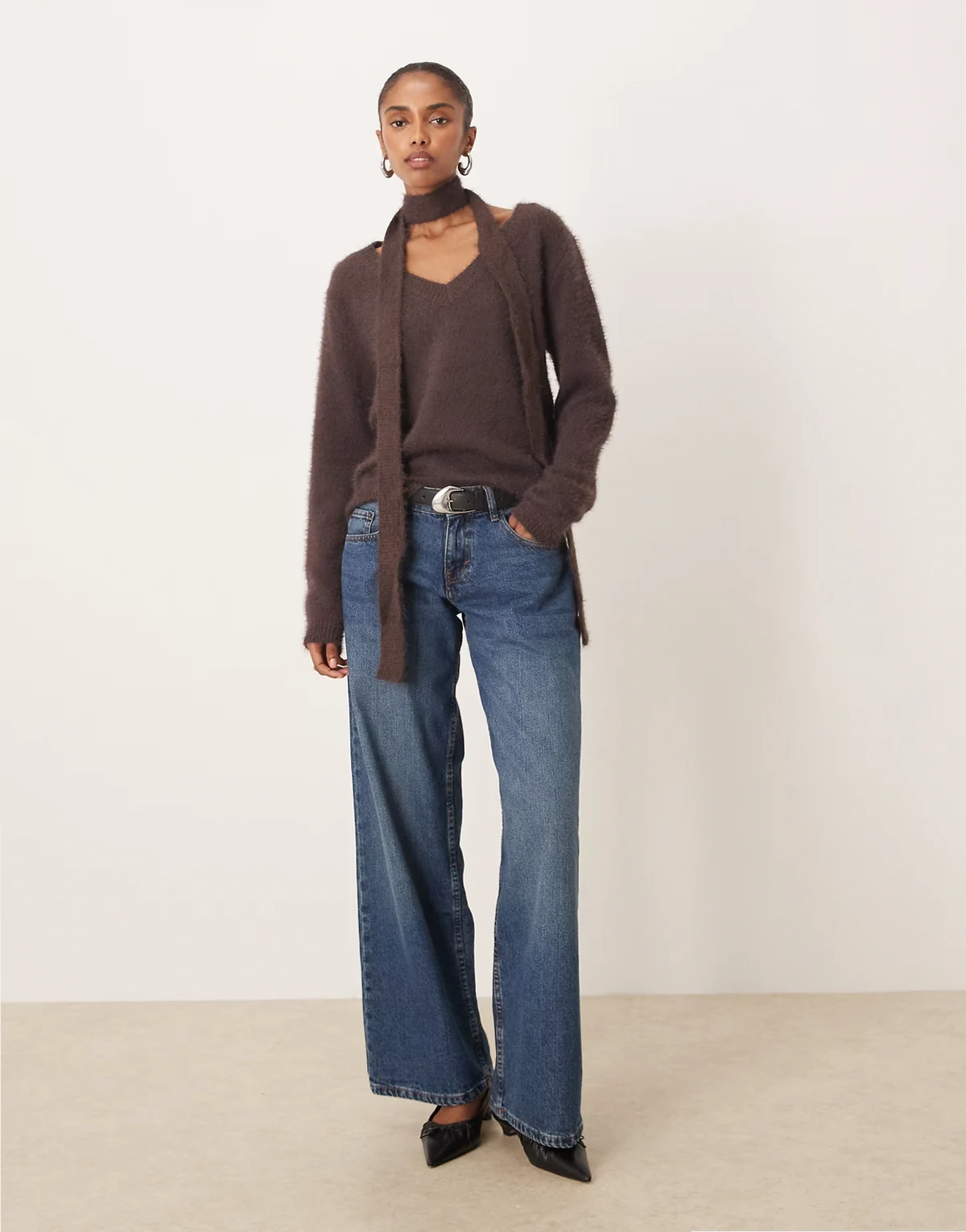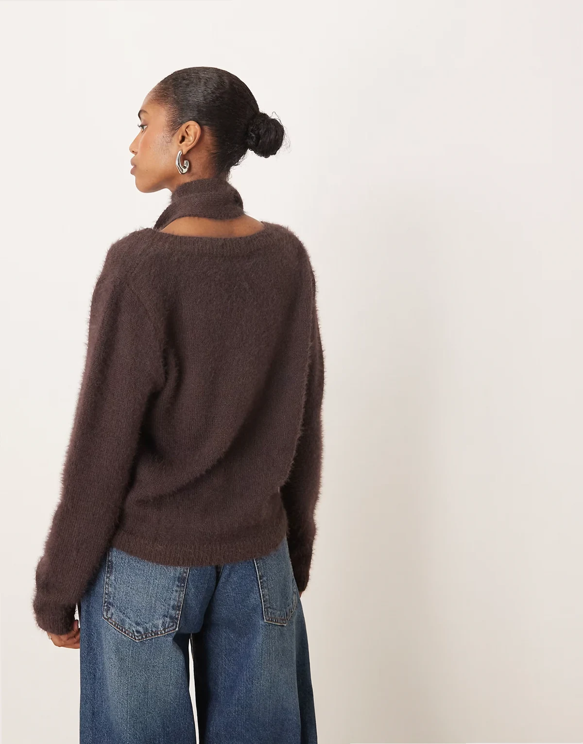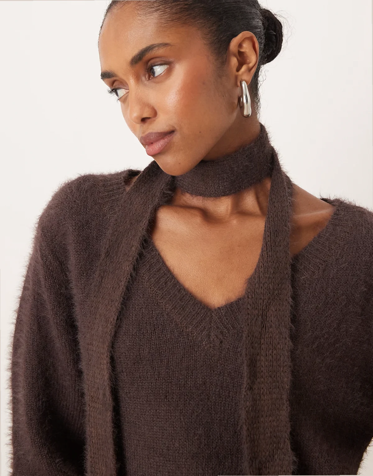 – Dikara – Flauschiger Pullover in Braun mit V-Ausschnitt und passendem Schal