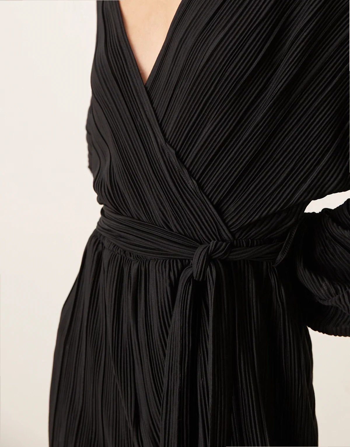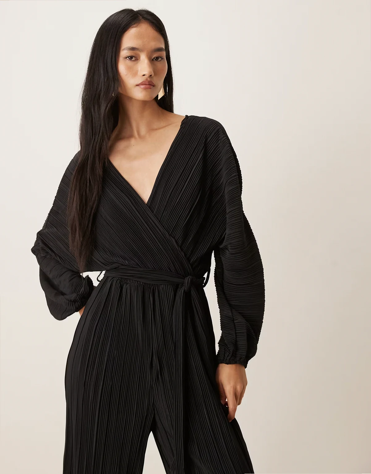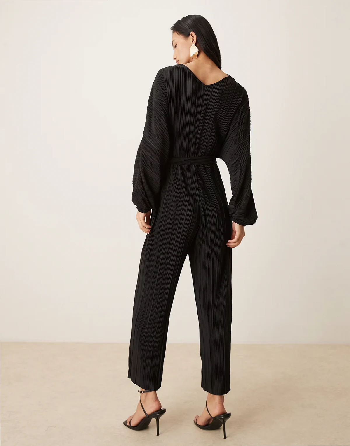 – Langärmliger Plissee-Jumpsuit in Schwarz mit Bindegürtel
