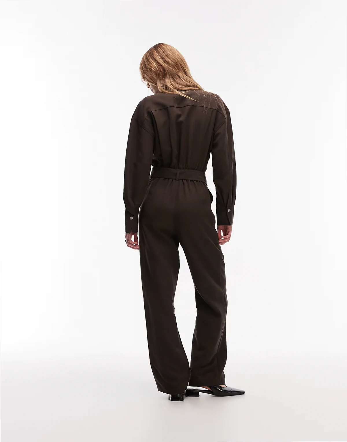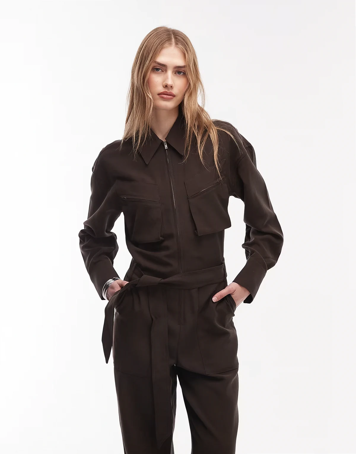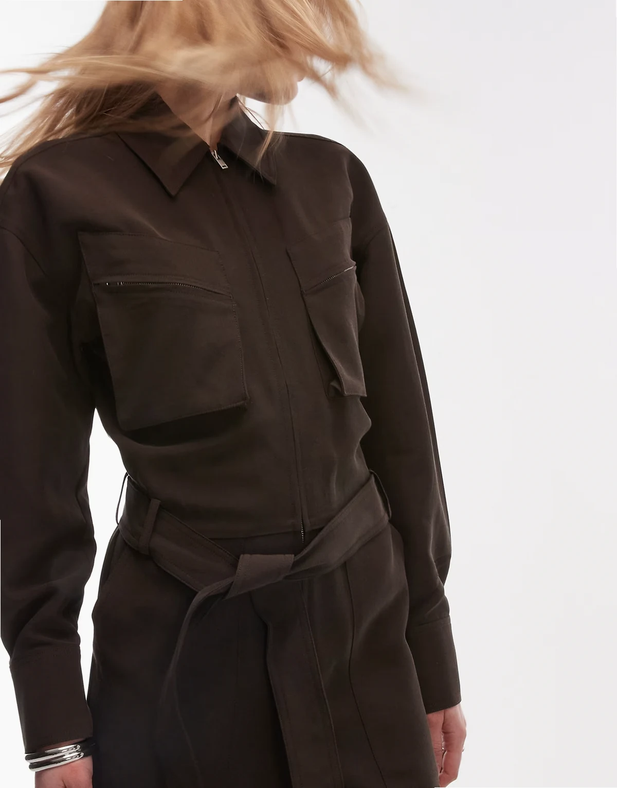 – Utility-Jumpsuit aus reiner Baumwolle in Braun mit Bindegürtel vorne