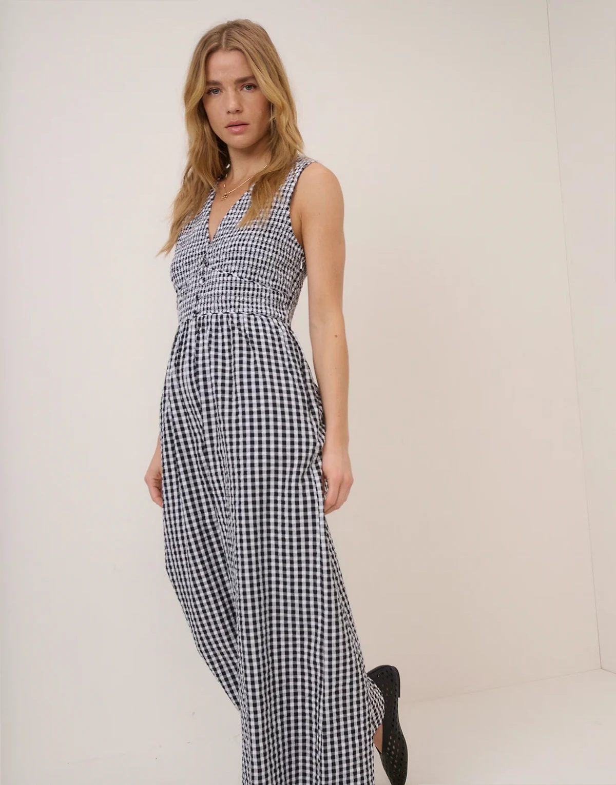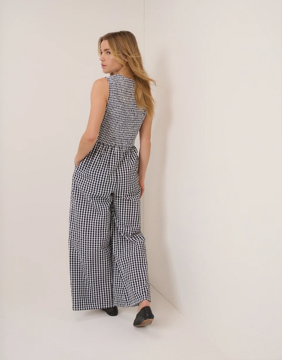 – Carmen – Ärmelloser Jumpsuit in Schwarz mit Vichy-Karos und V-Ausschnitt