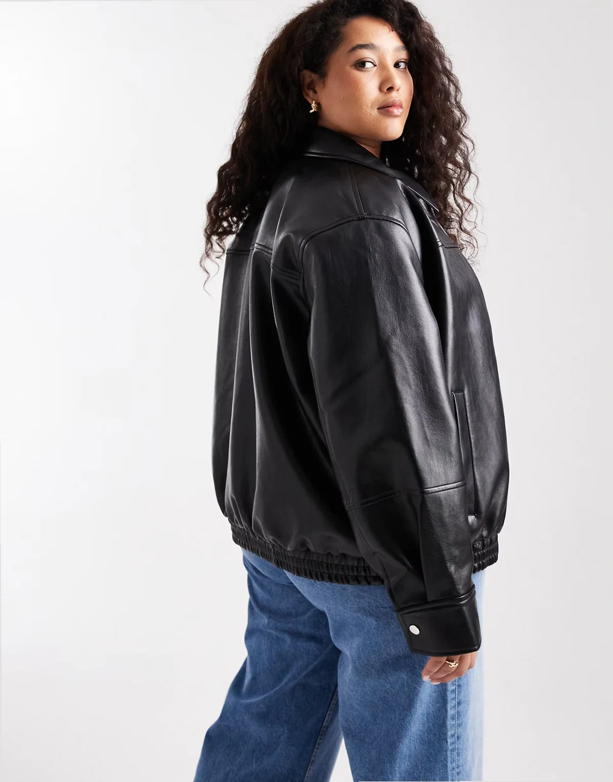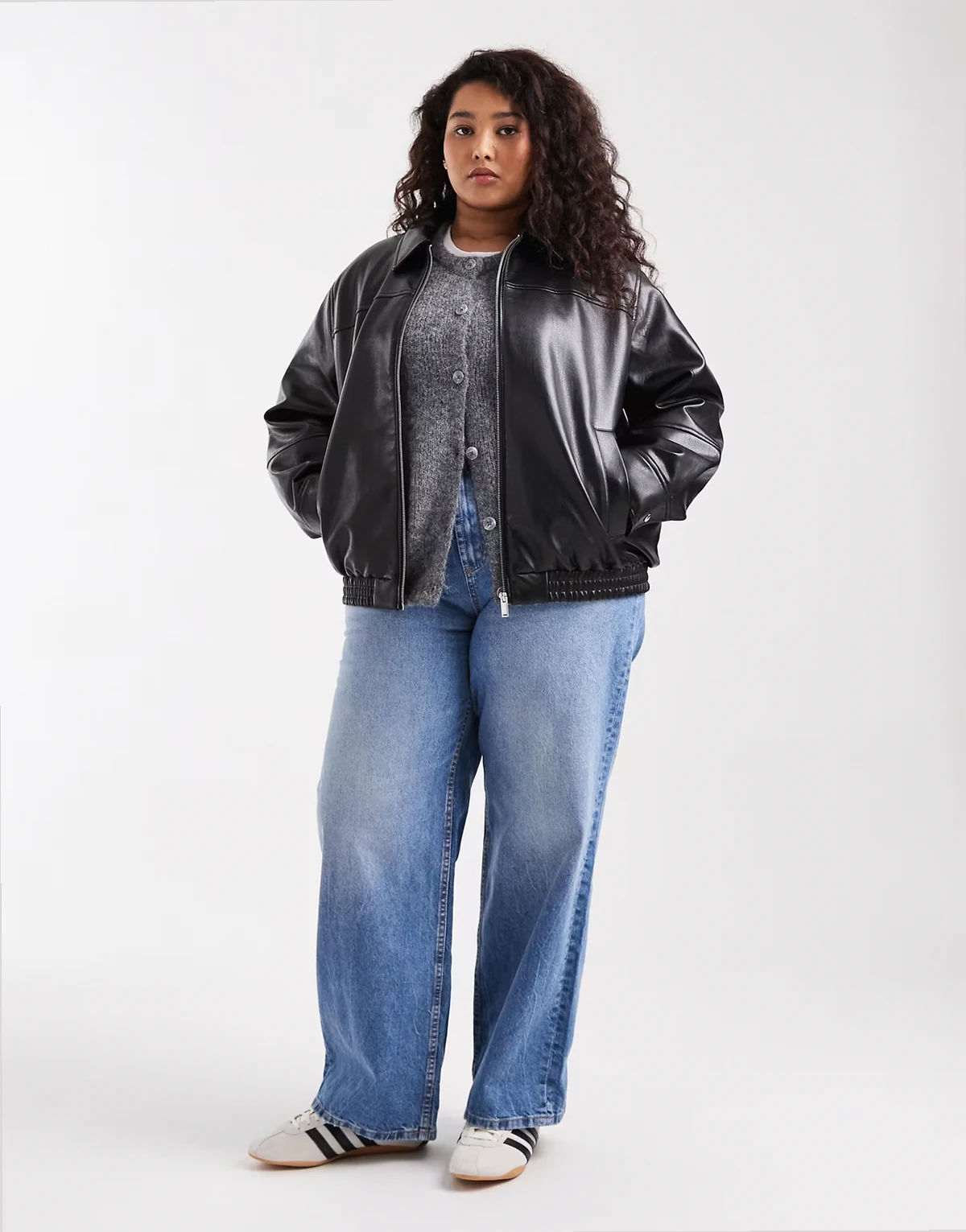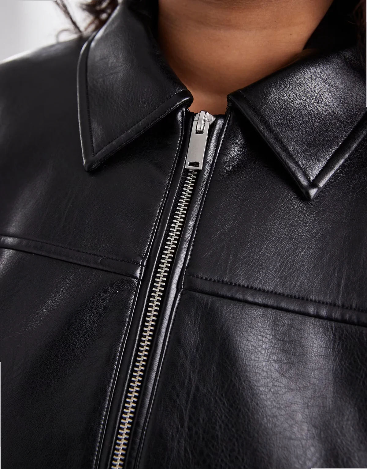 – Harrington-Jacke in schwarzer Lederoptik mit Reißverschluss vorne