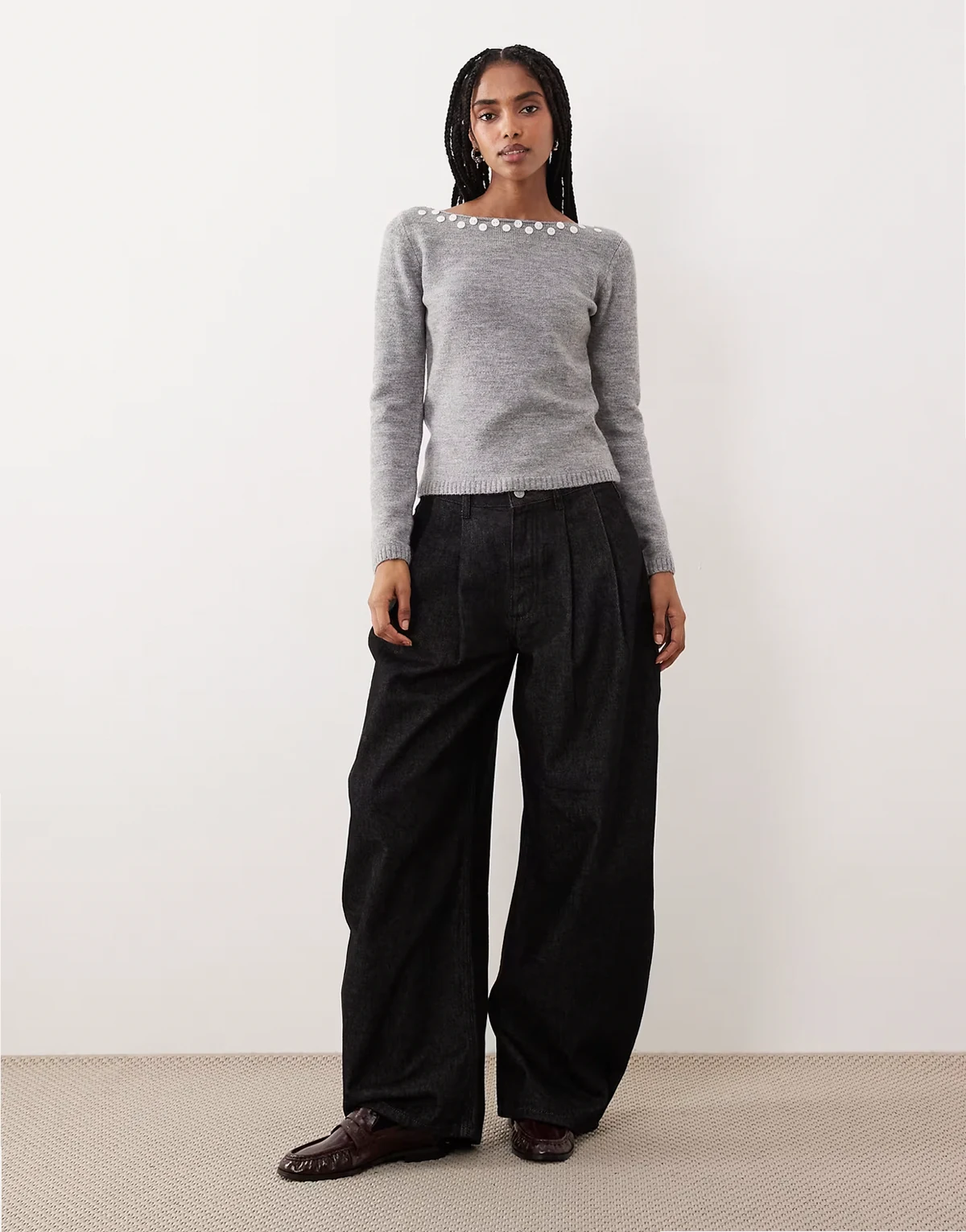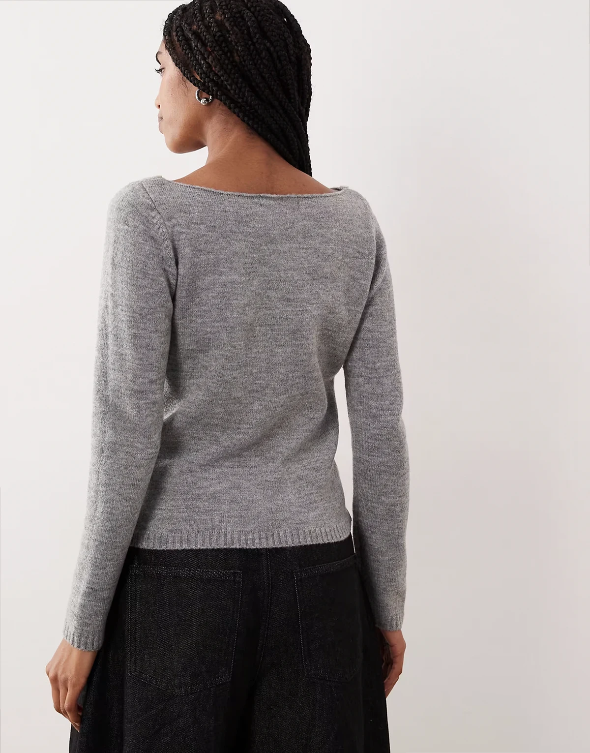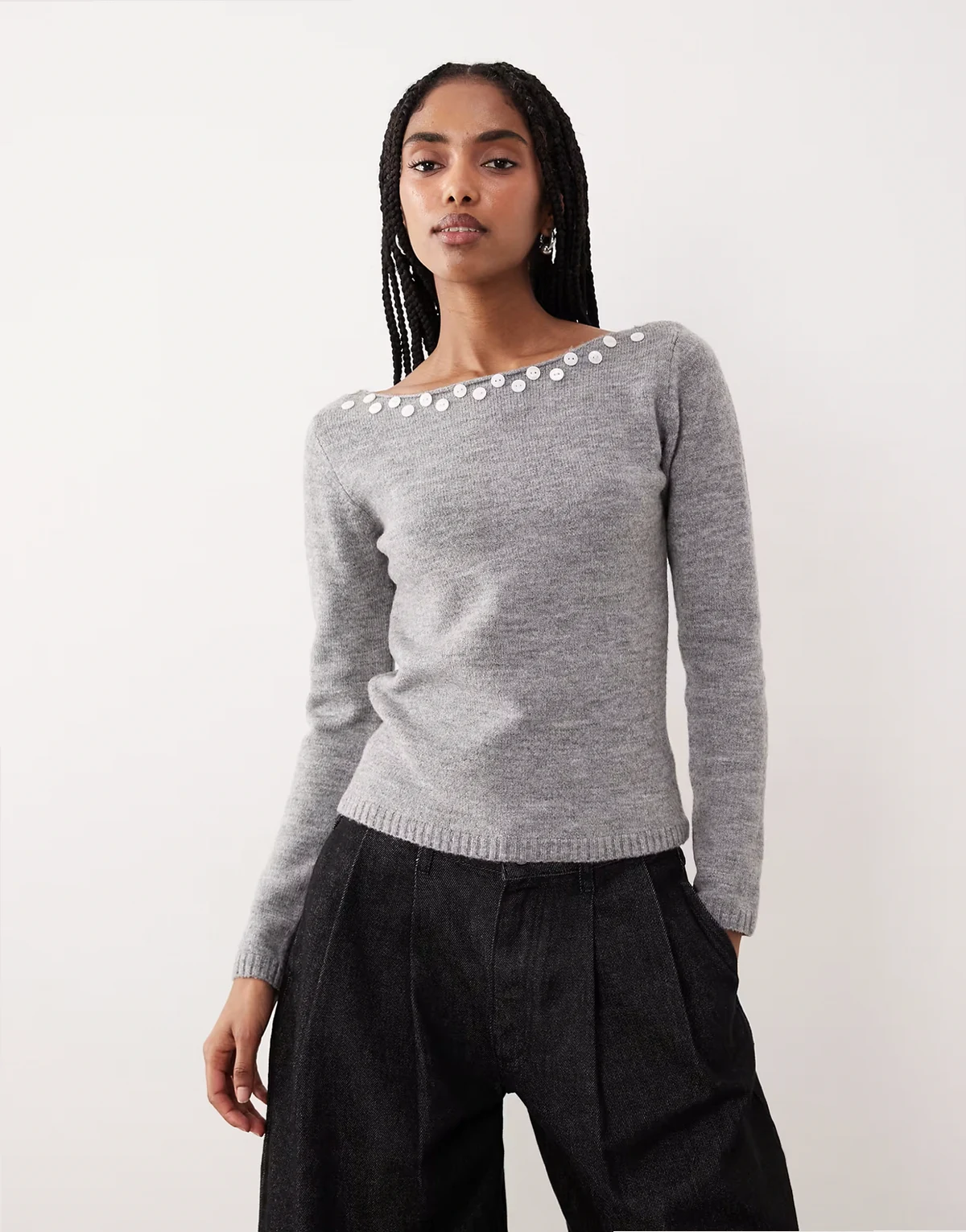 – Manahi – Pullover in Grau mit U-Boot-Ausschnitt und Perlendetail