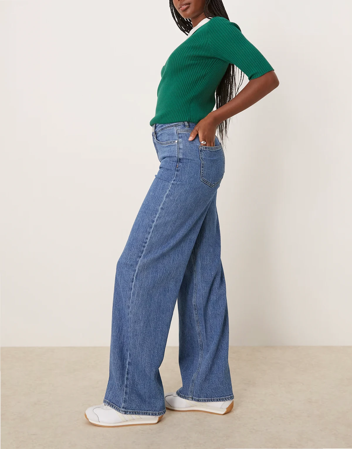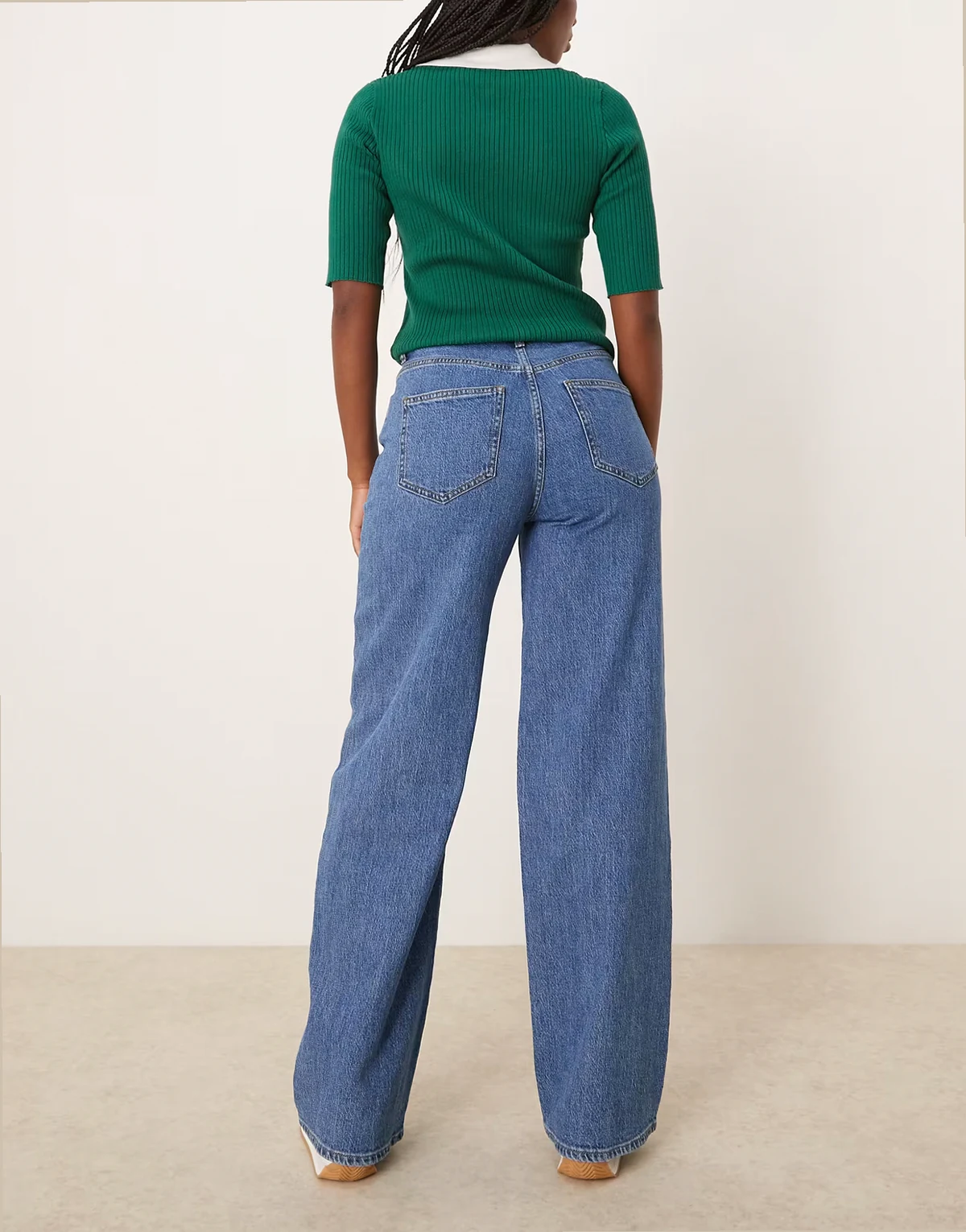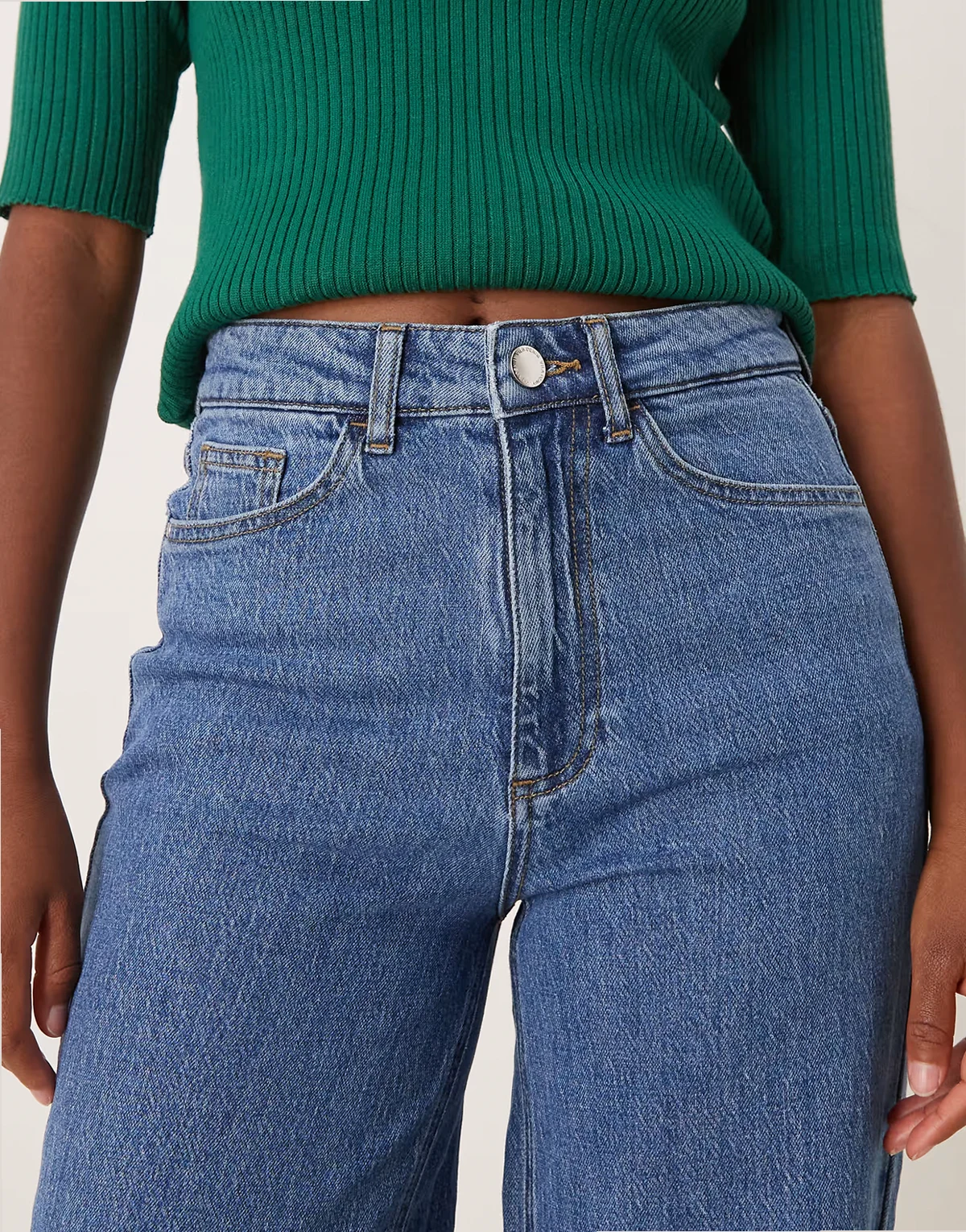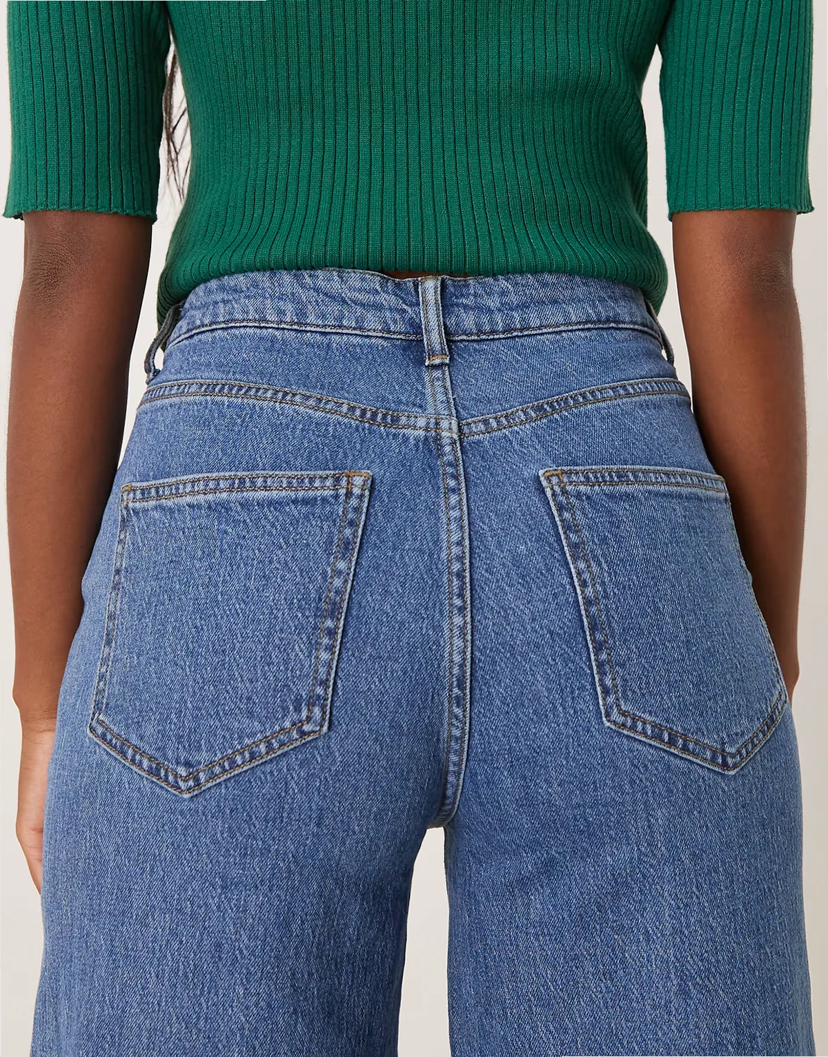 – Mittelblaue Denim-Jeans mit hoher Taille und weitem Bein