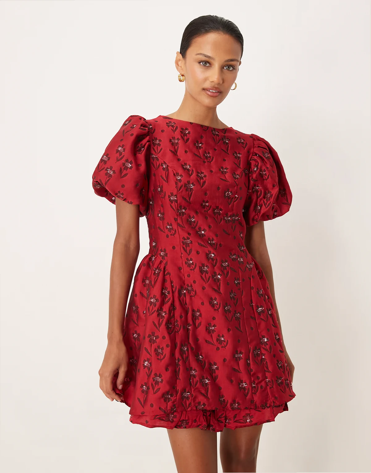 – Minikleid aus geblümtem Jacquard in Weinrot mit Puffärmeln