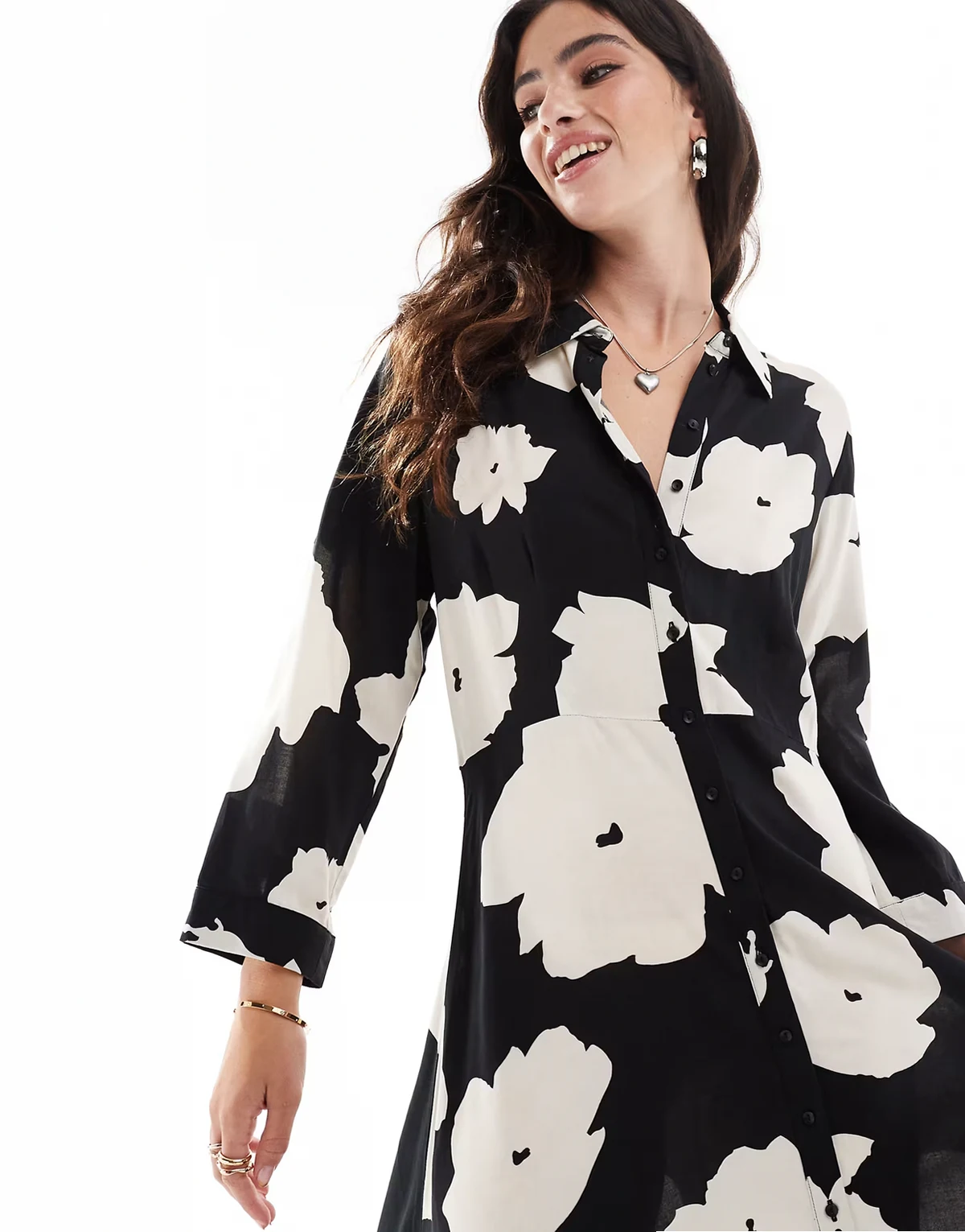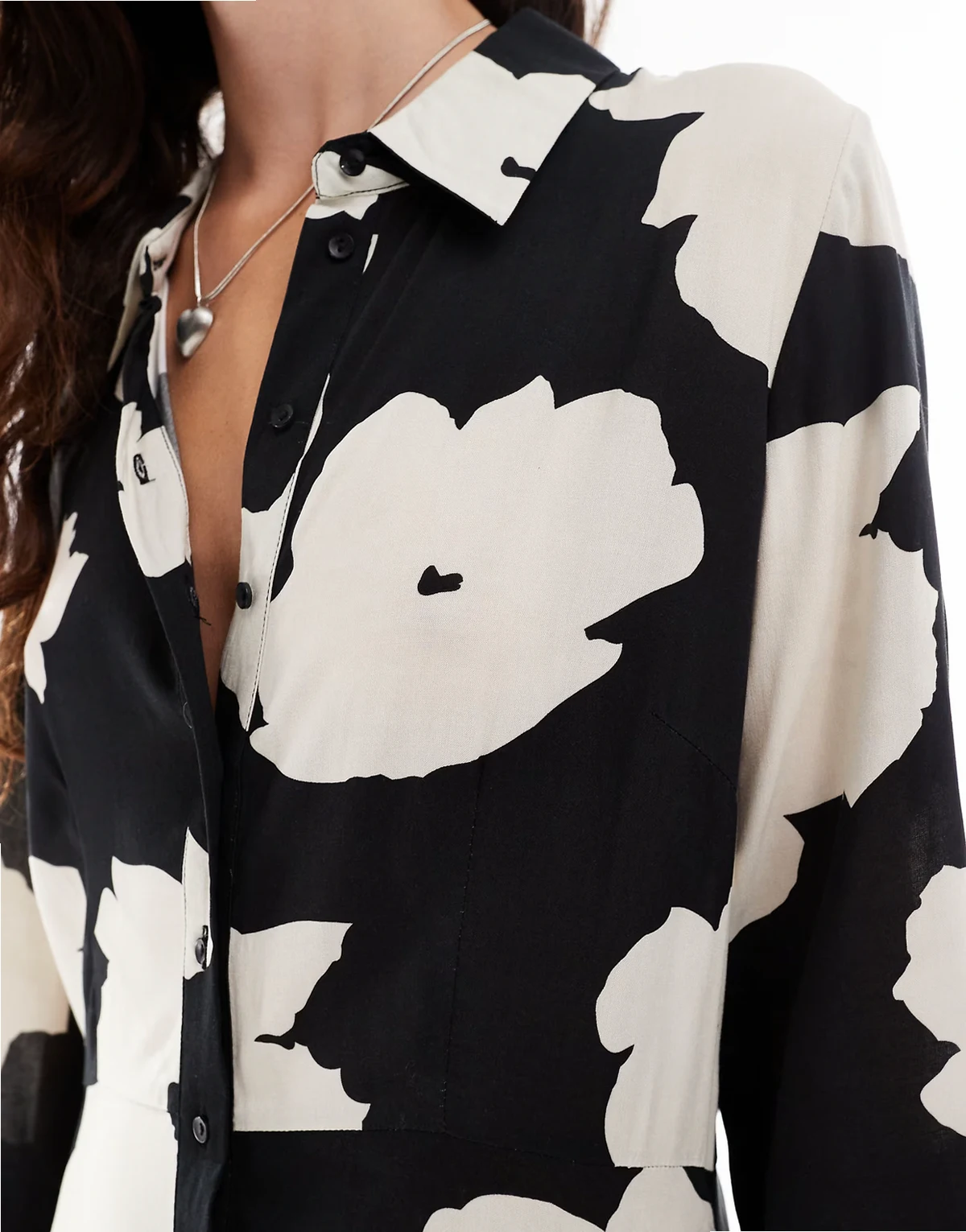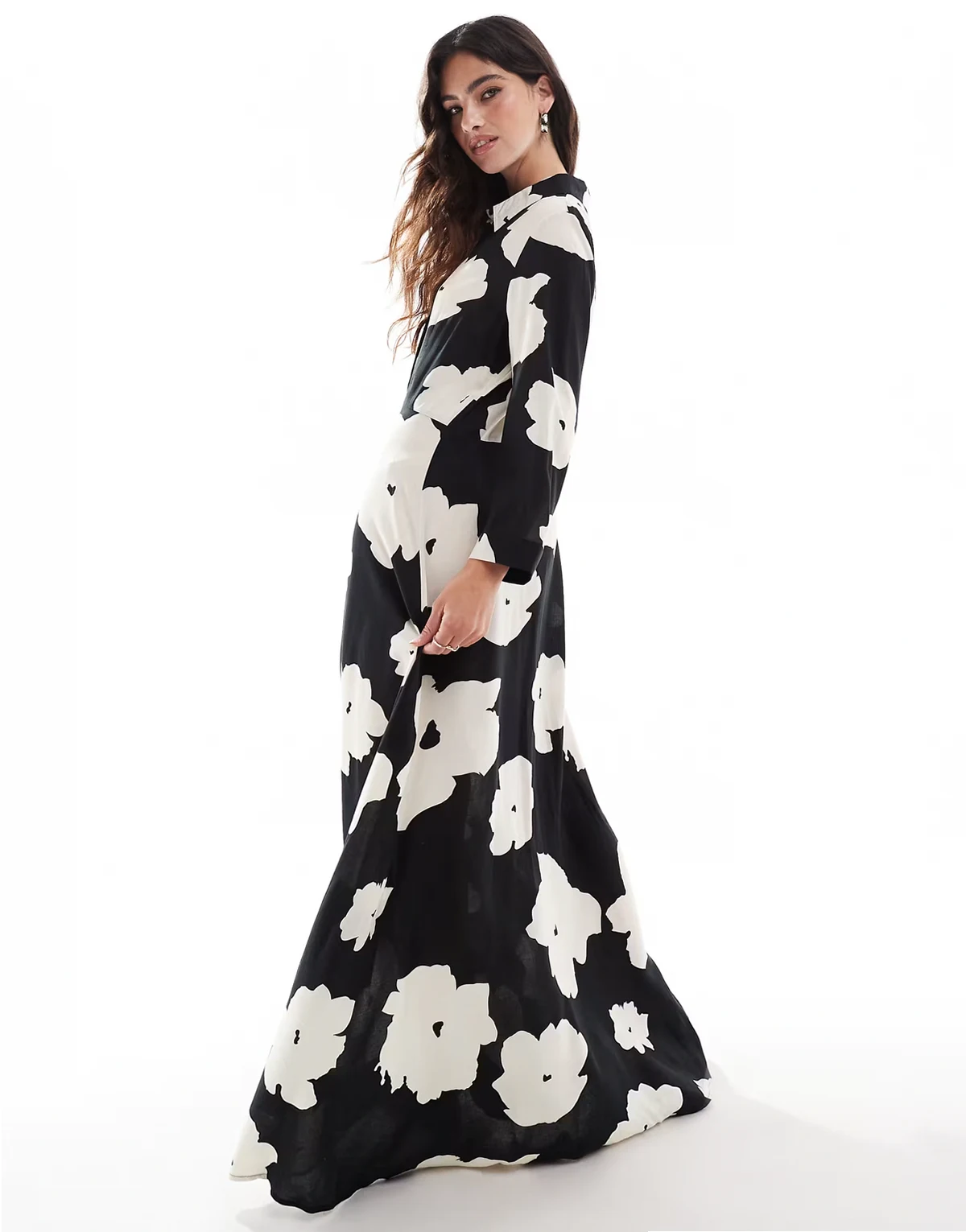 – Maxi-Hemdblusenkleid in Schwarz-Weiß mit Blumenmuster