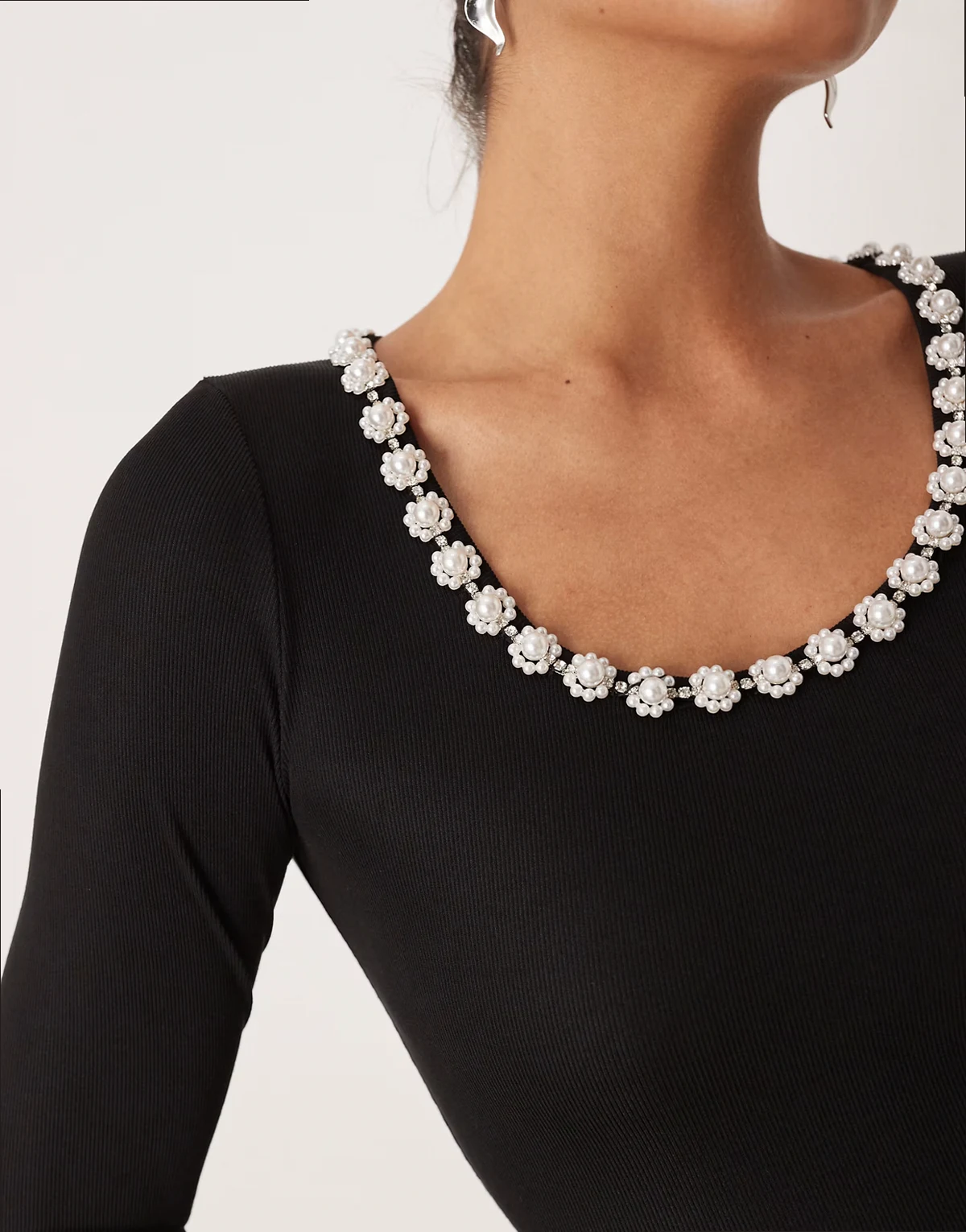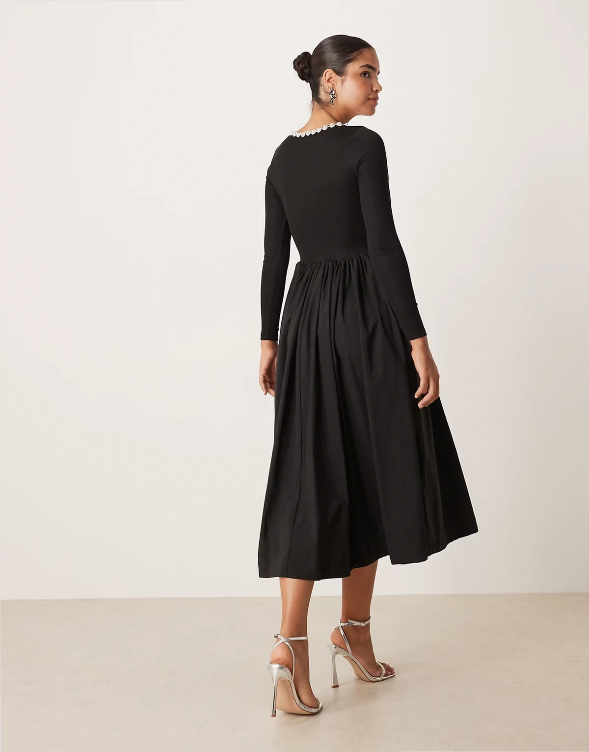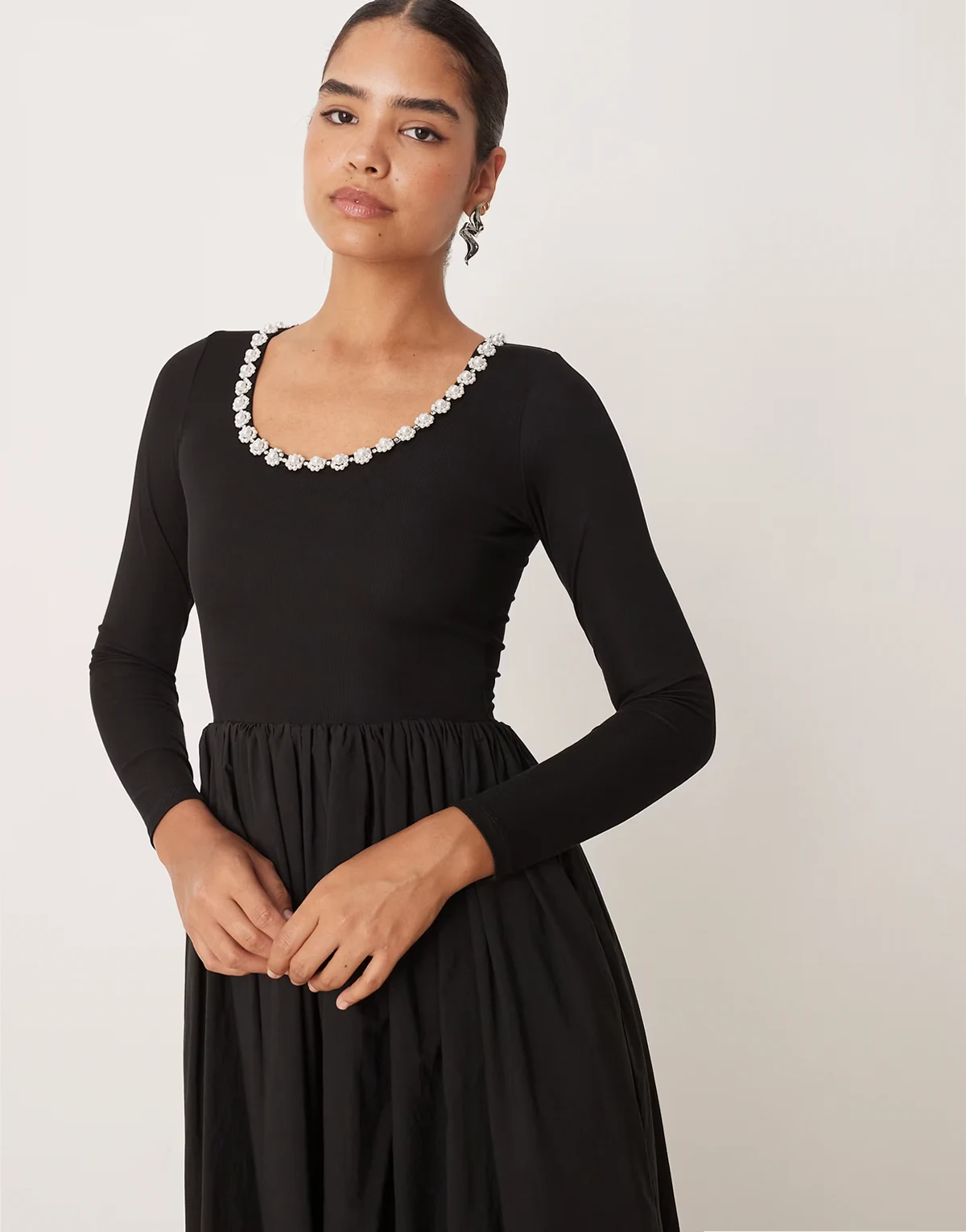 – Verziertes Midikleid aus geripptem Jersey-Mix in Schwarz mit weitem Rock und U-Ausschnitt