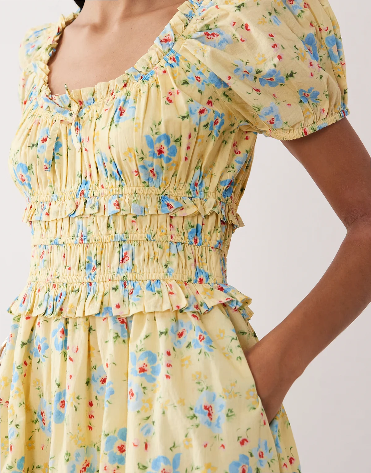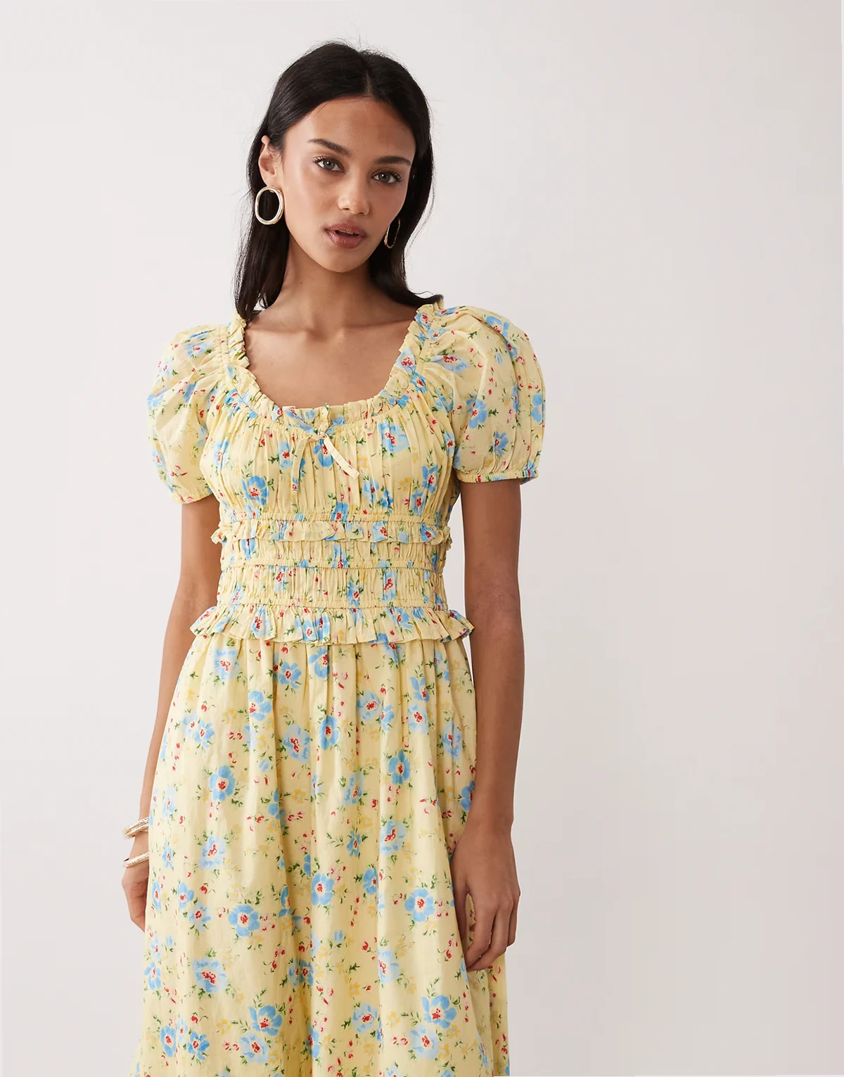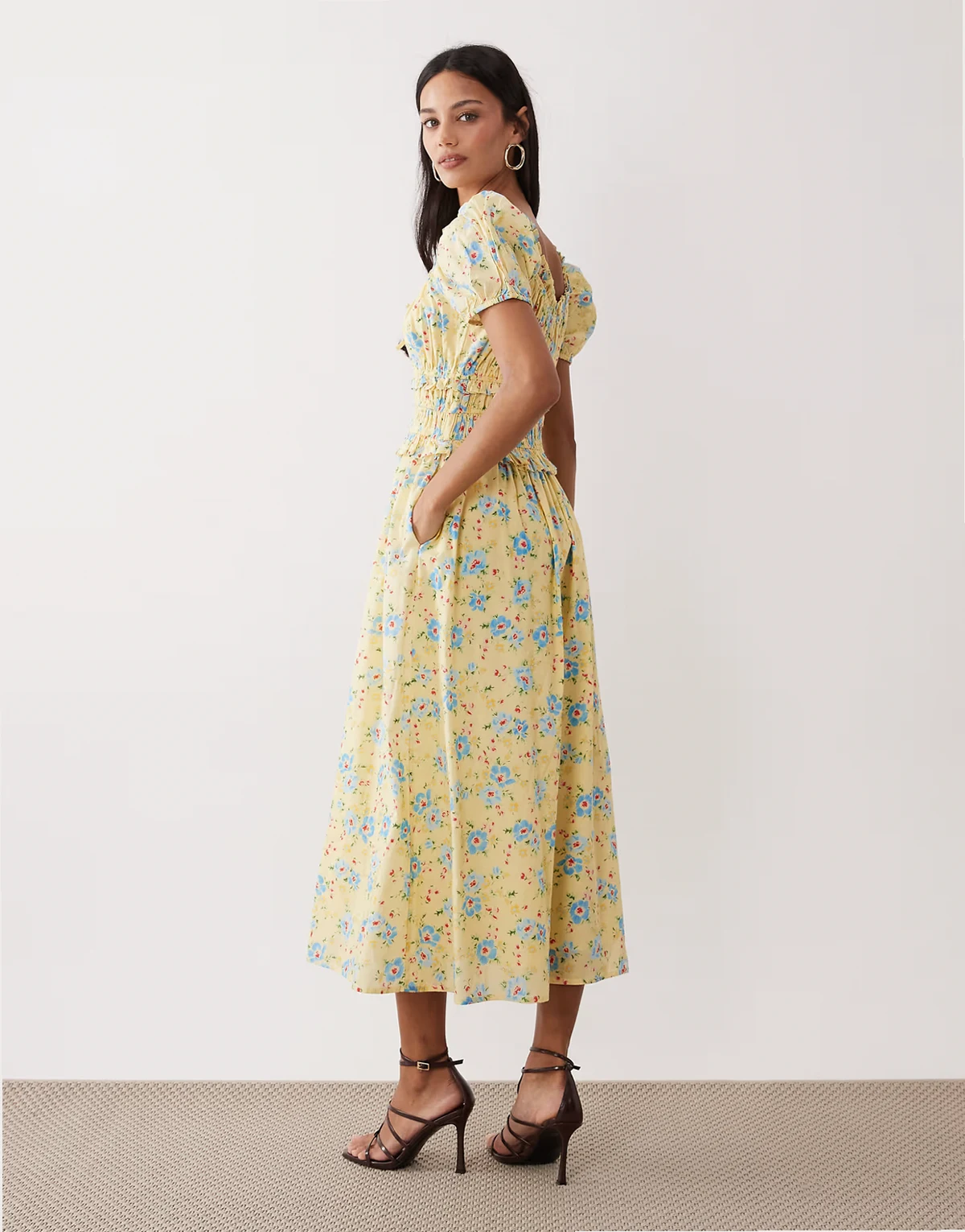 – Ariel – Midikleid im Milchmädchen-Stil in Zitronengelb mit Blumenmuster