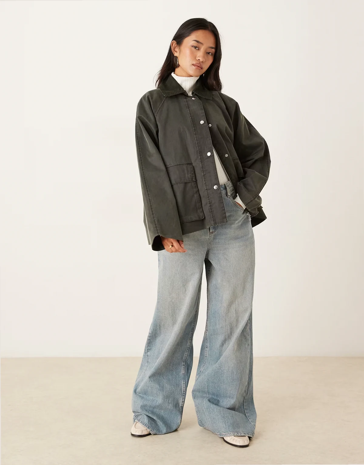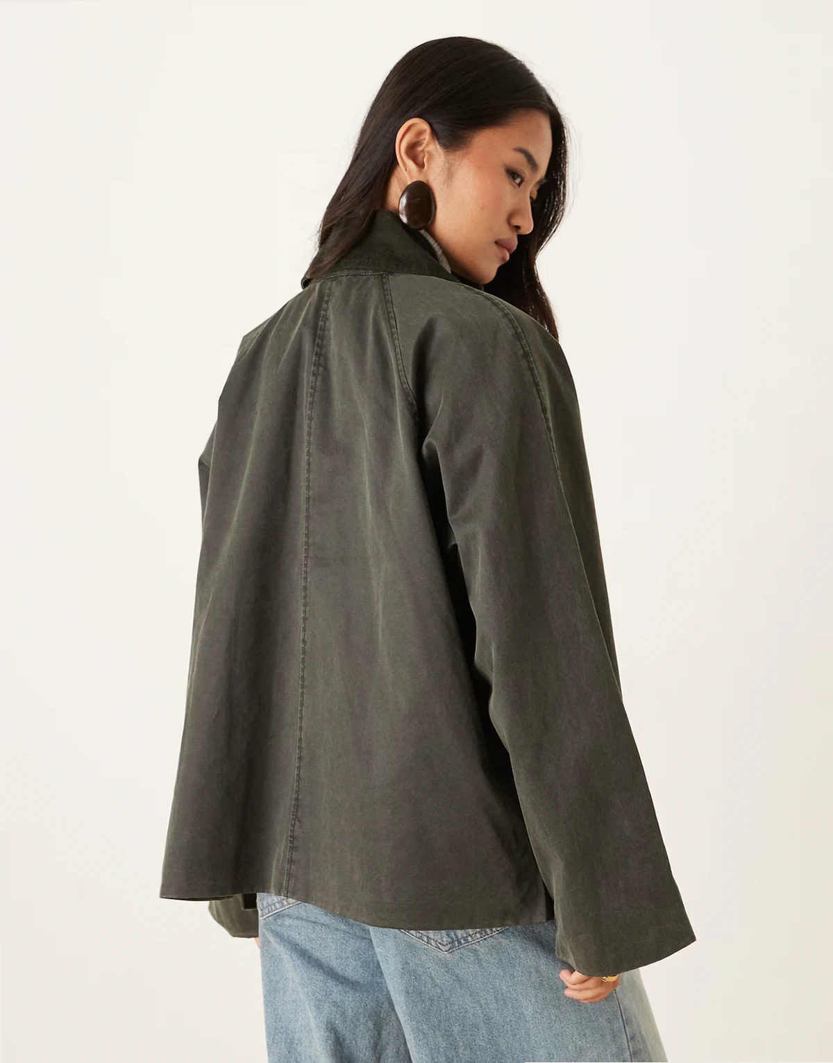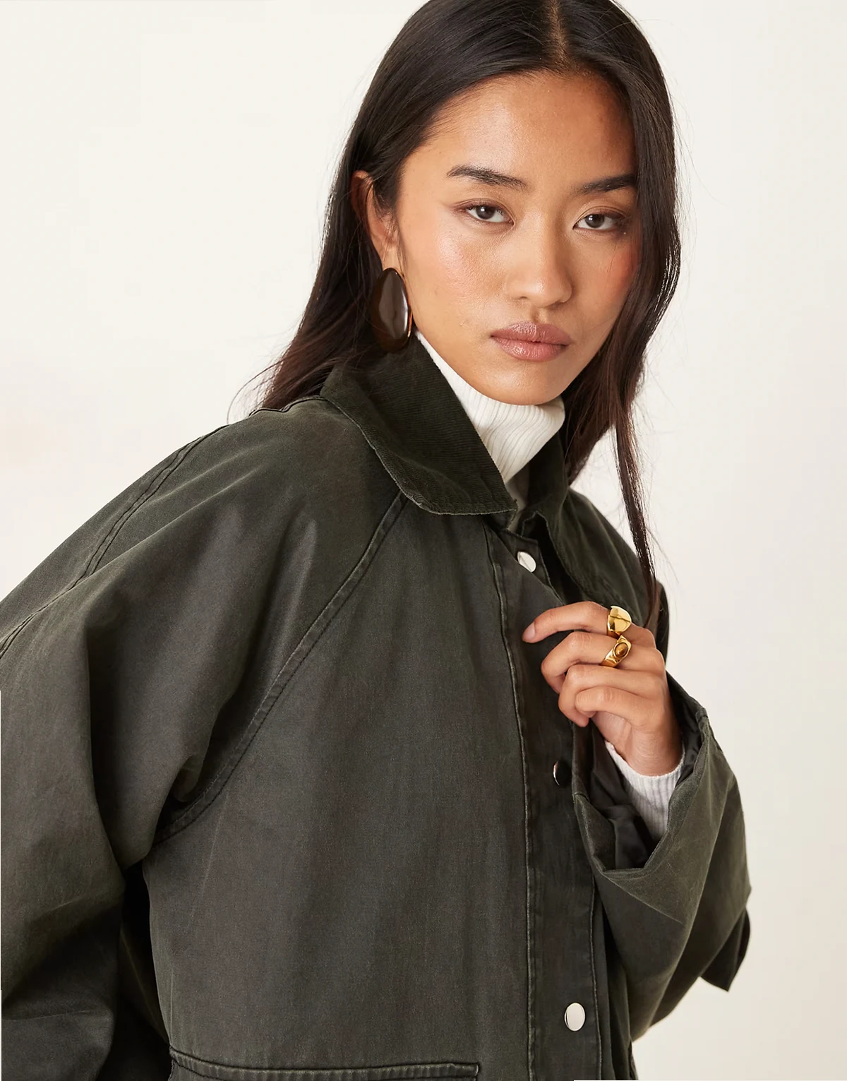– Oversize-Steppjacke in dunklem Khakigrün mit kontrastierendem Cordkragen