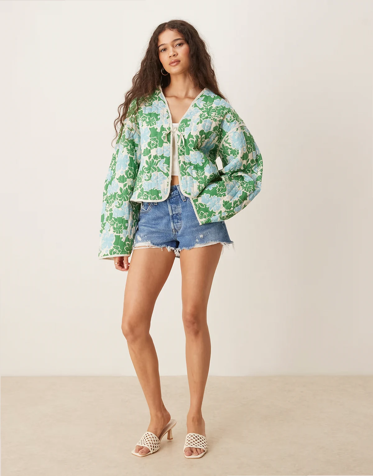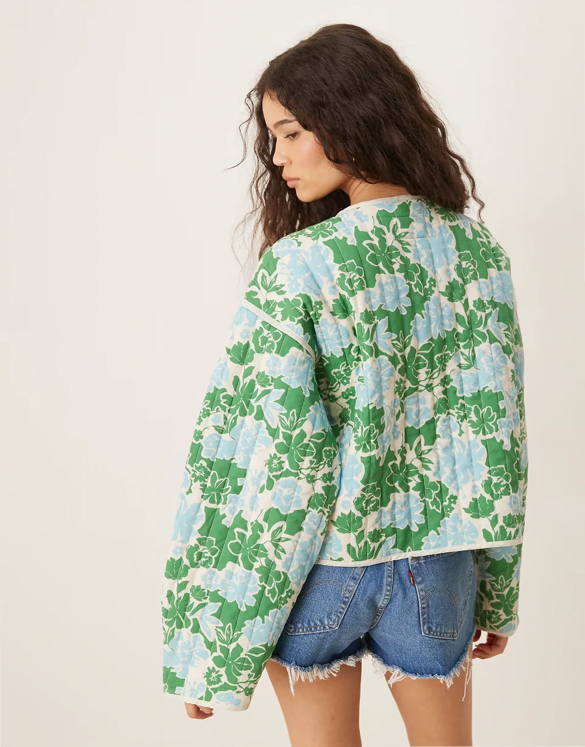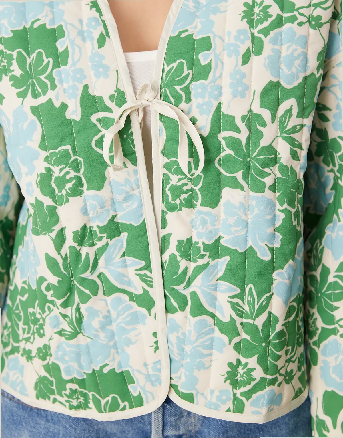 – Steppjacke mit blau-grünem Blumenmuster und Bindedetail vorn