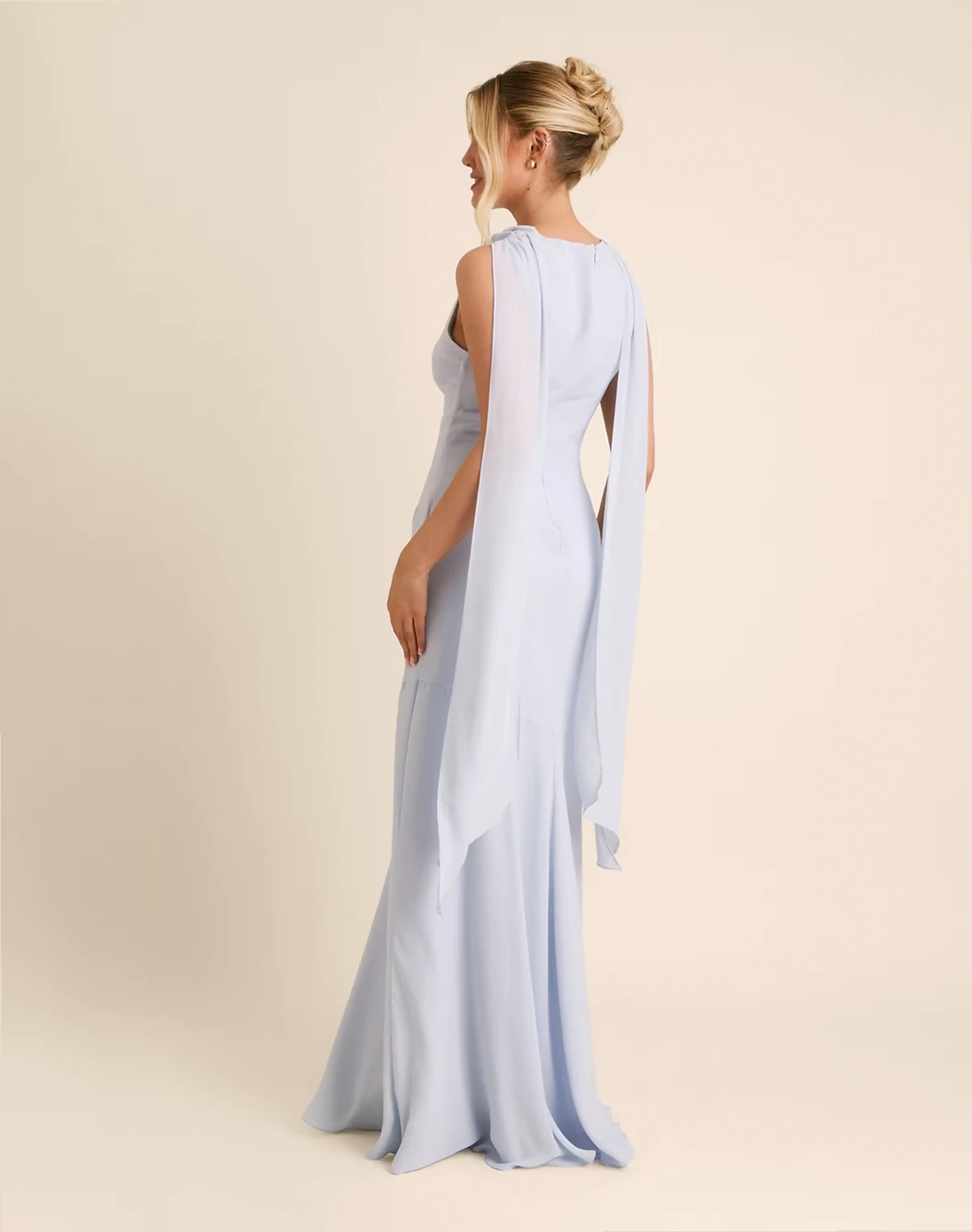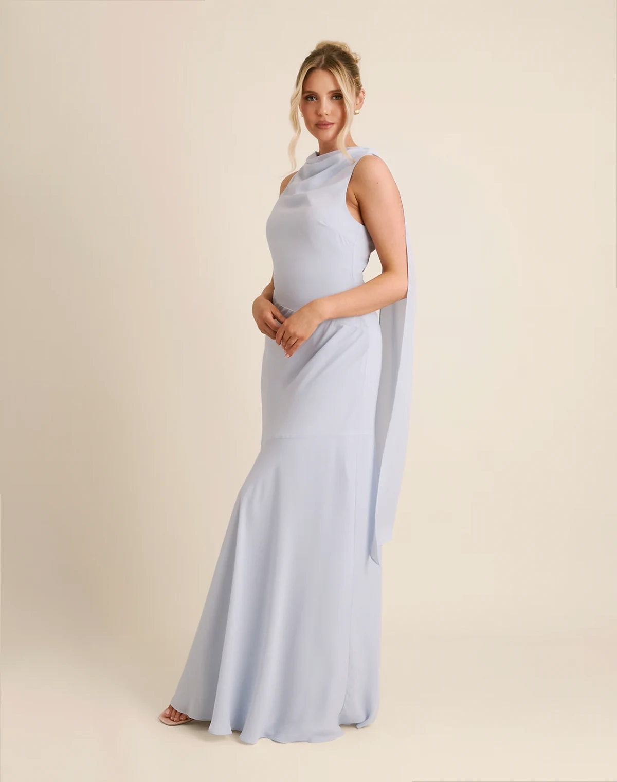 – Bridesmaid – Crepe-Maxikleid in Blassblau mit hohem Wasserfallausschnitt