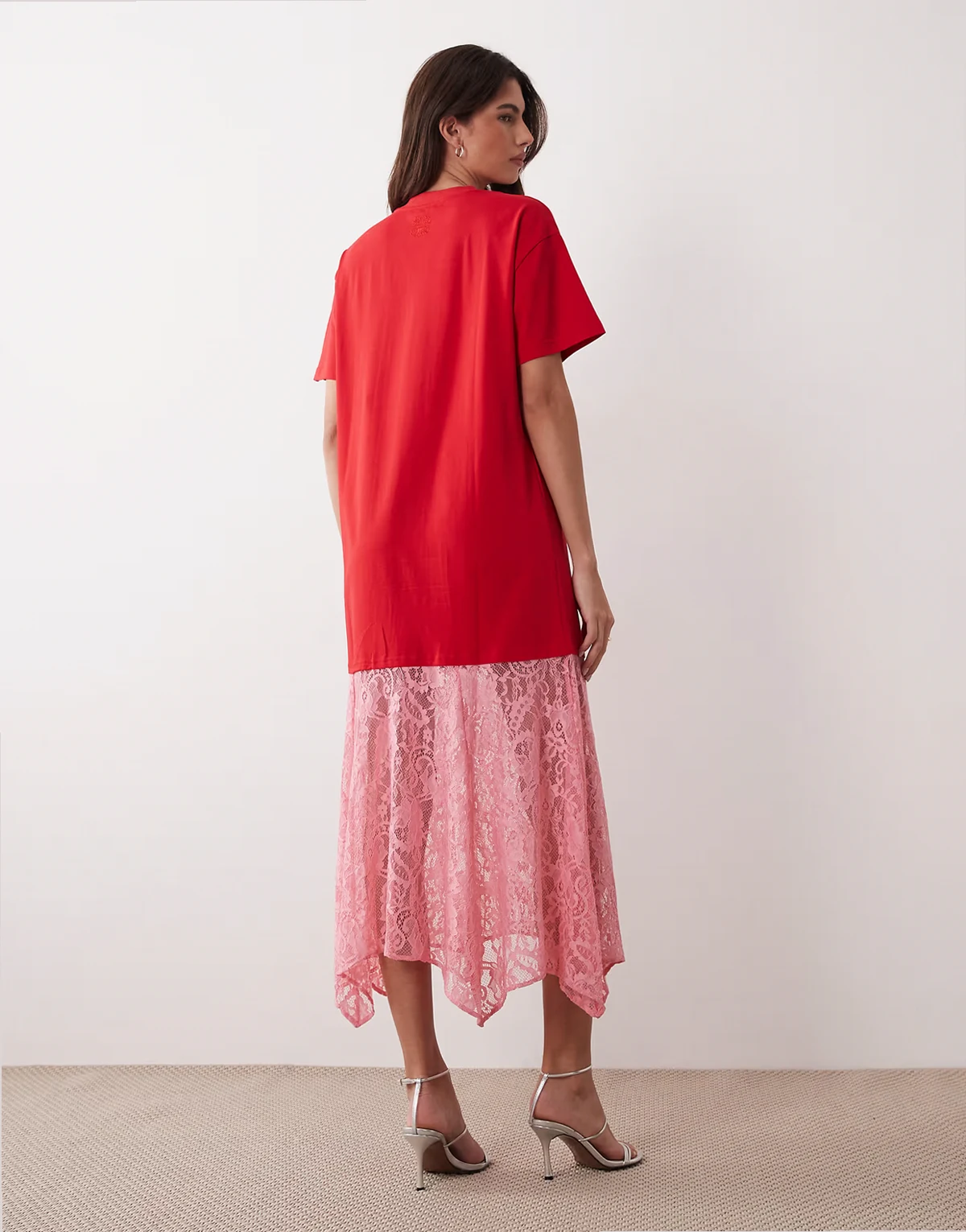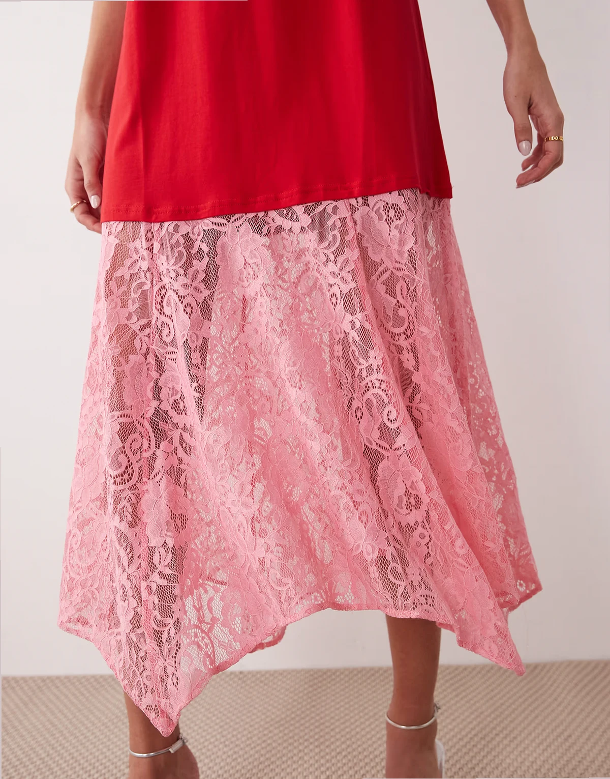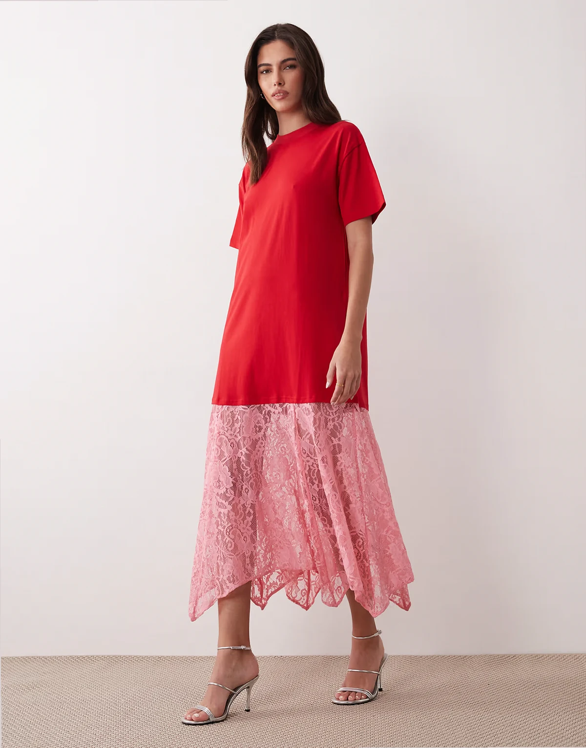 – T-Shirt-Maxikleid aus Jersey in Rot und Rosa mit Spitzenrock und Oversize-Schnitt