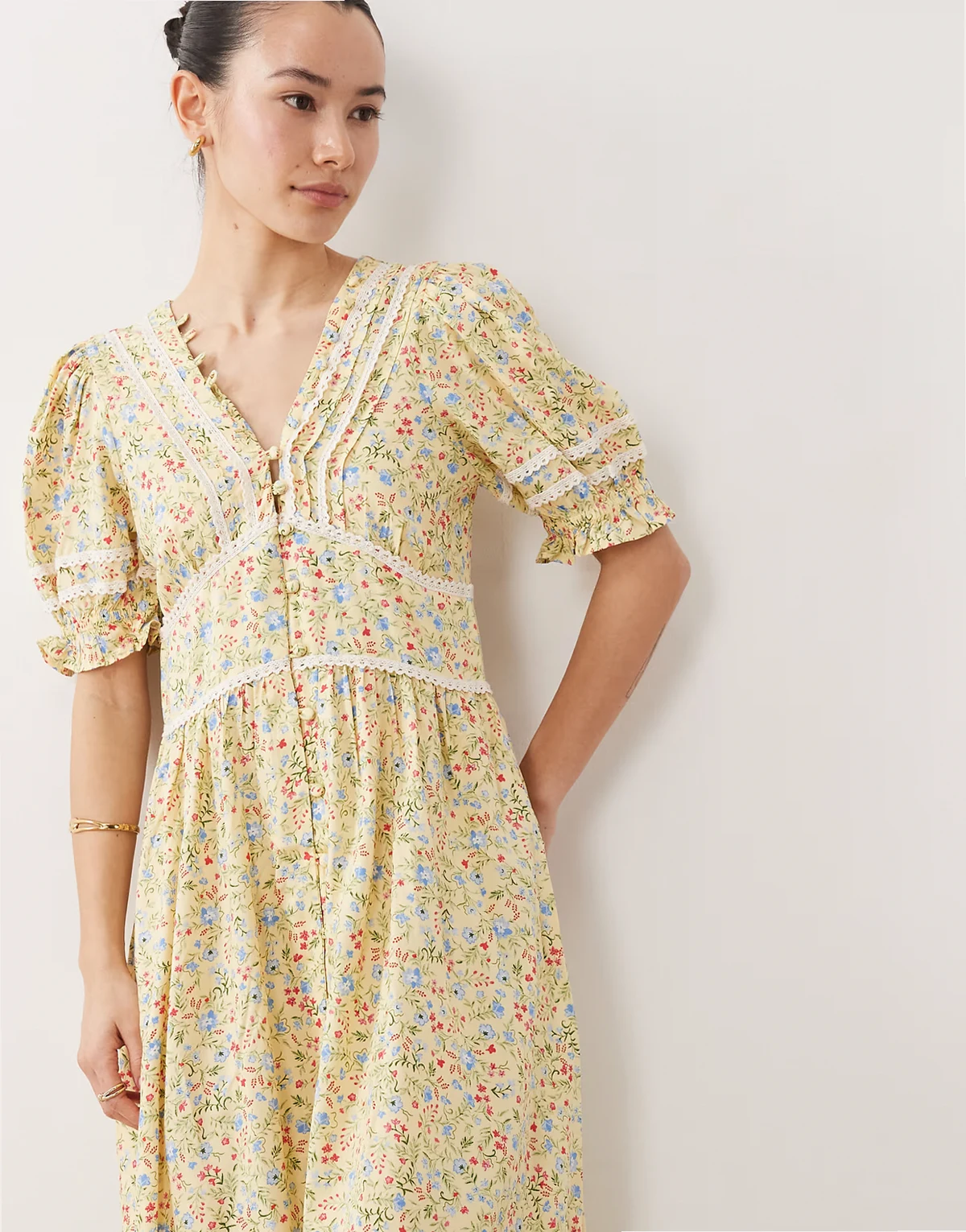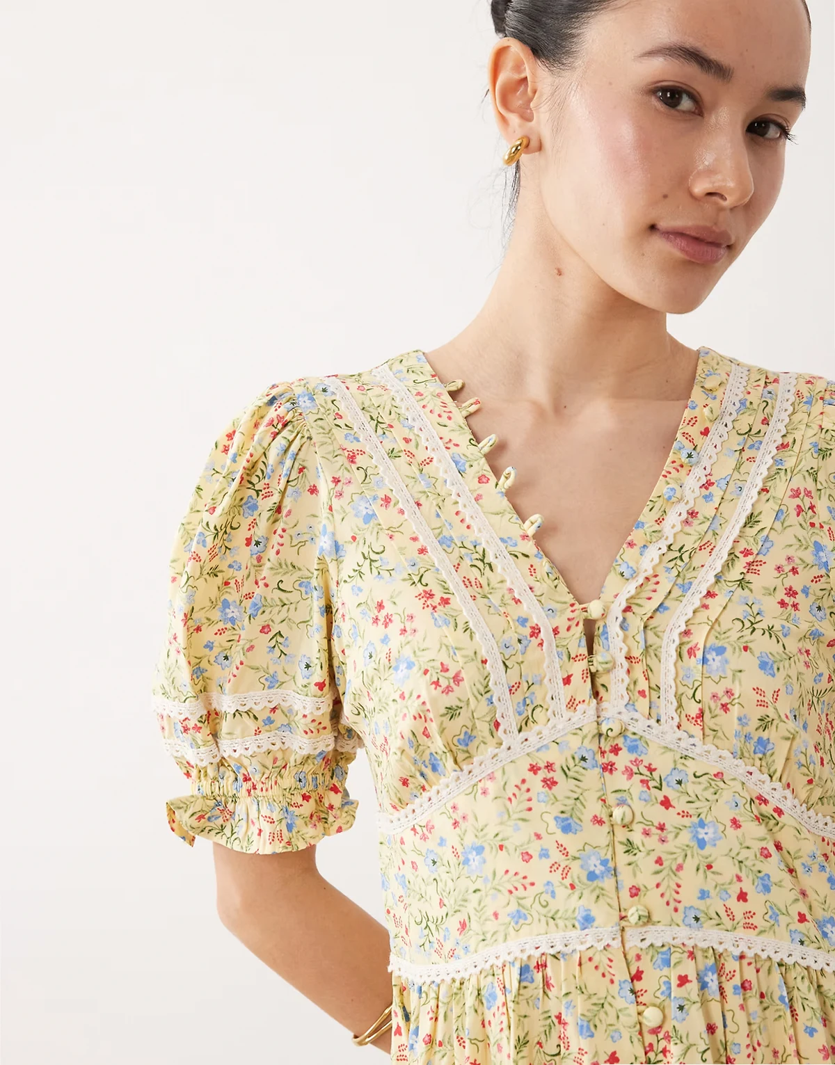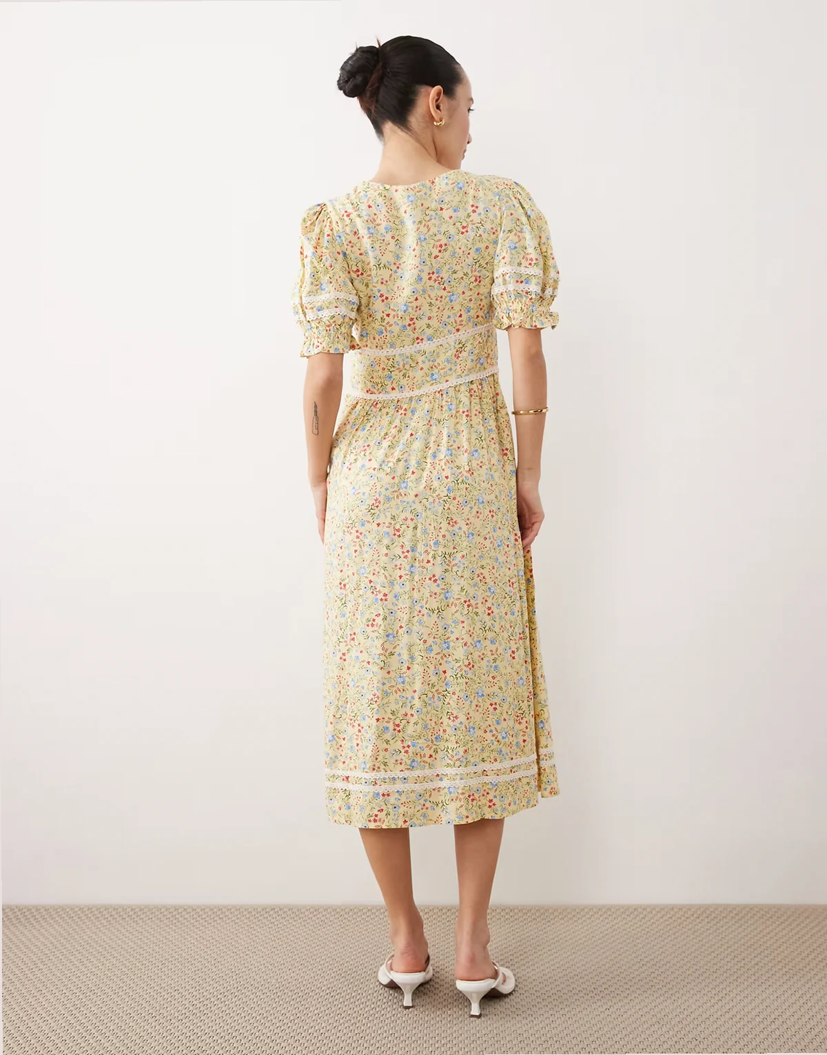 – Saffy – Midikleid in Zitronengelb mit Blumenmuster
