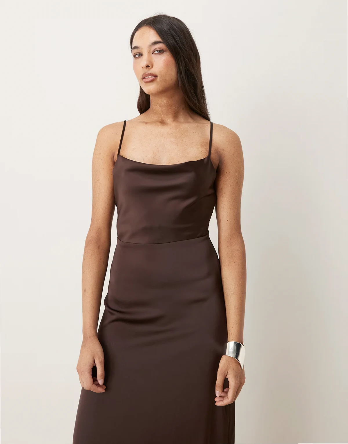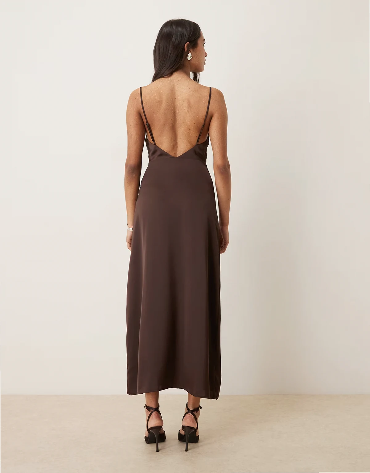 – Maxikleid aus Satin in Schokobraun mit Wasserfallausschnitt