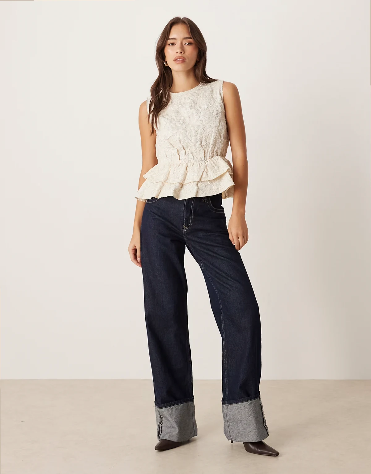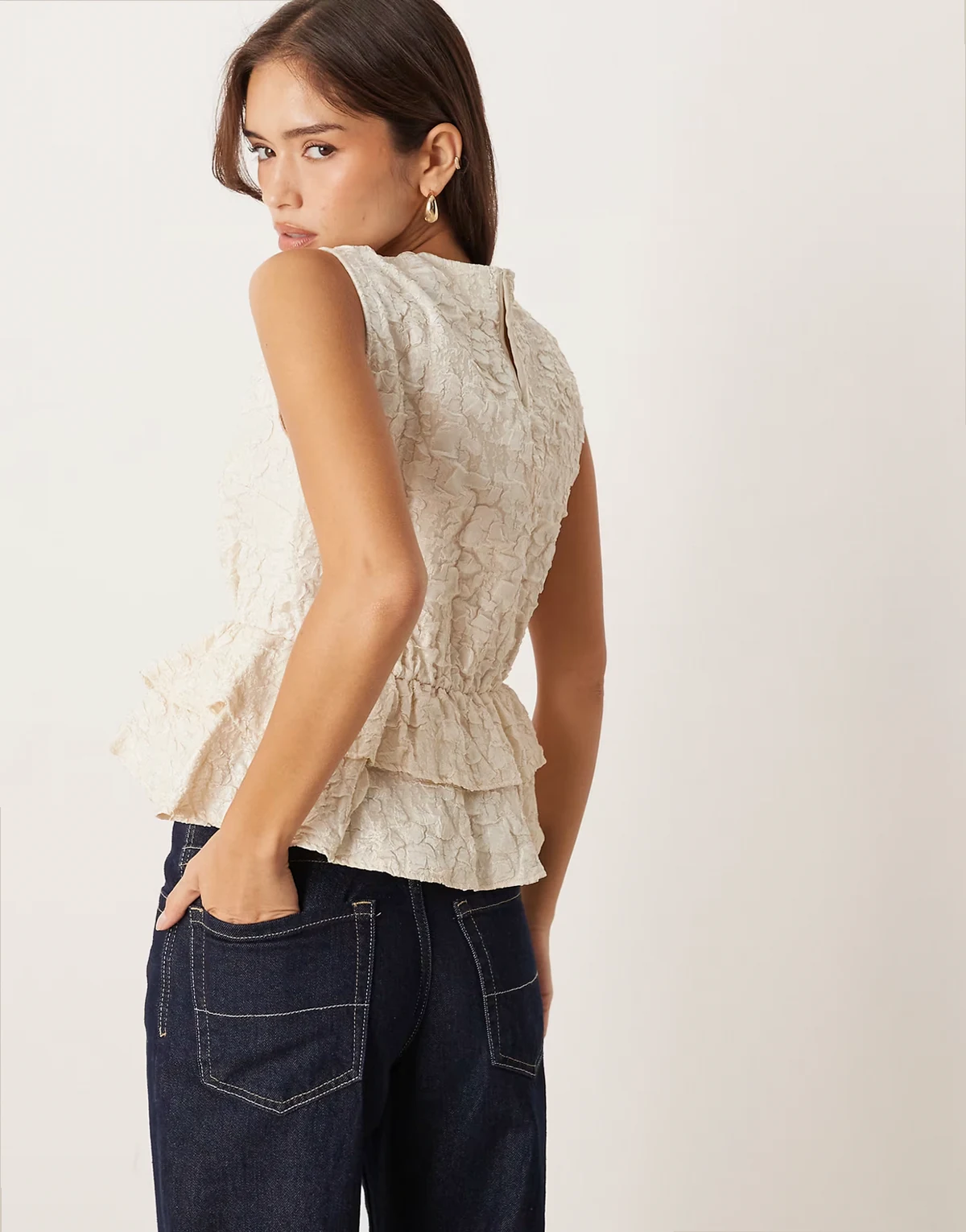 – Ärmelloses Jacquard-Oberteil in Birke-Creme mit Schößchen