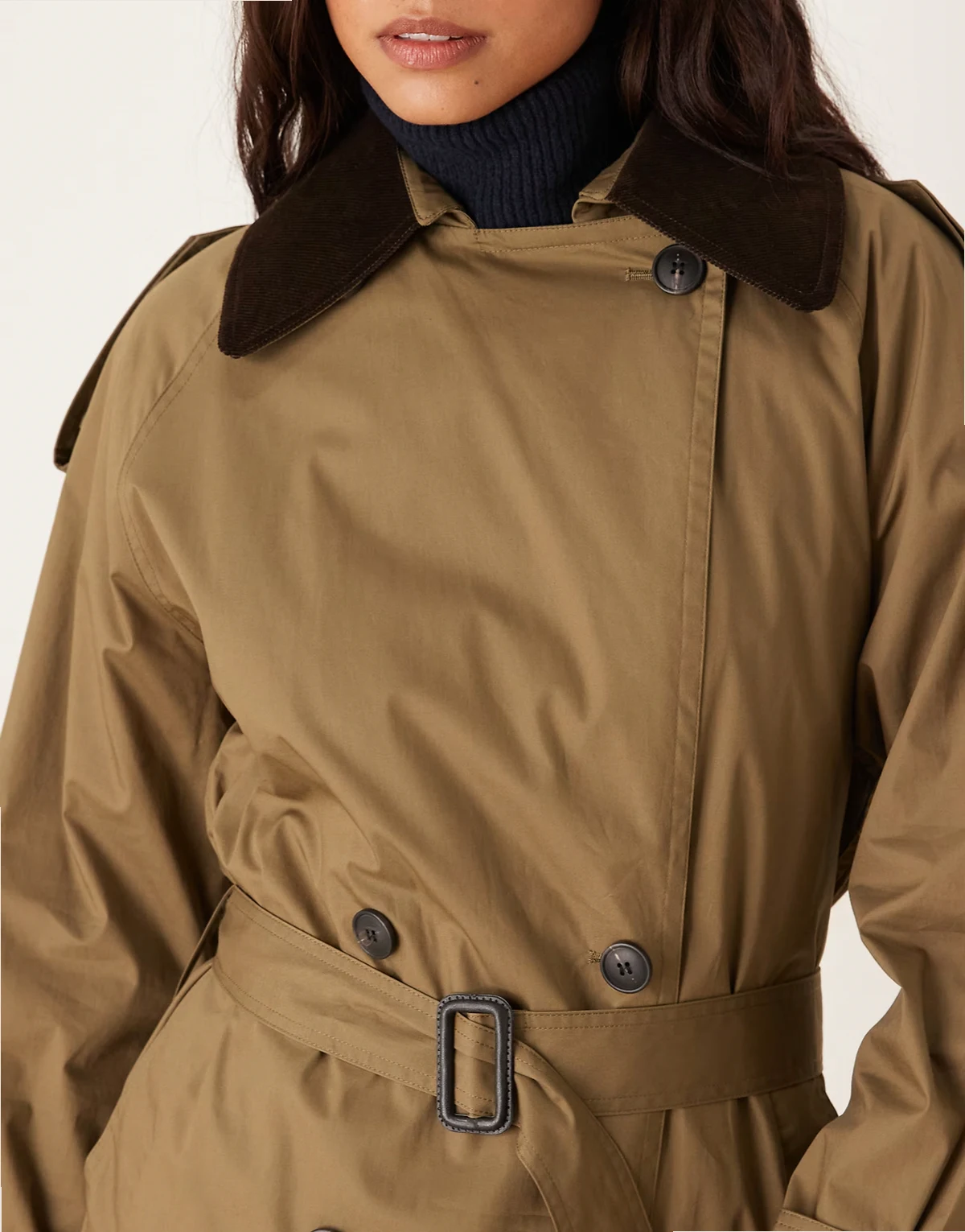 Kragen: 97% Baumwolle, 3% Elastan, Futter: 80% Polyester, 20% Baumwolle, Hauptmaterial: 100% Baumwolle, Besatz: 55% Polyester, 45% Viskose.