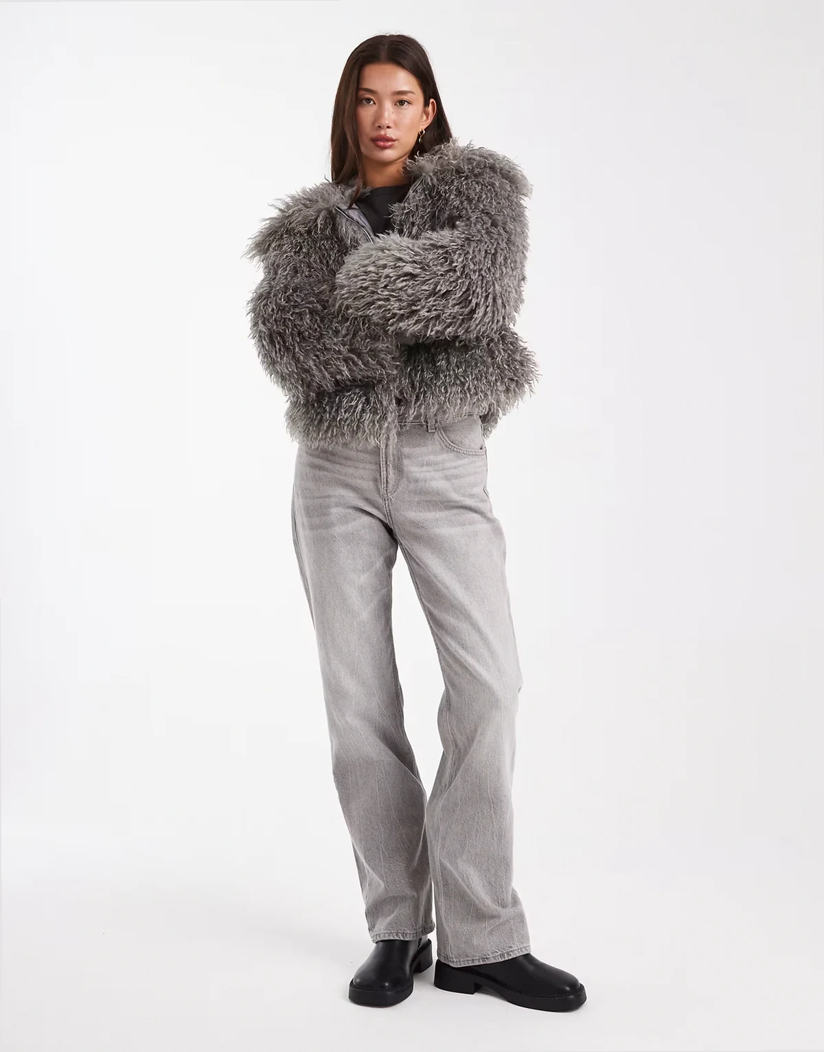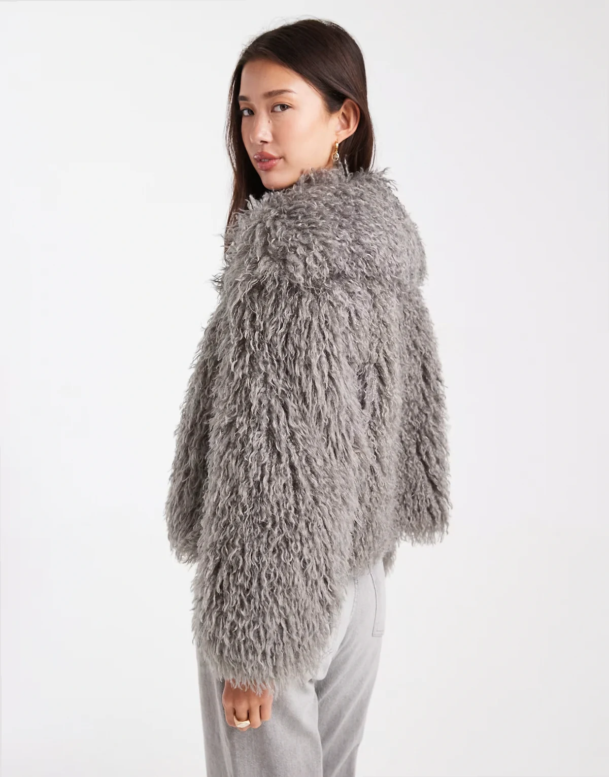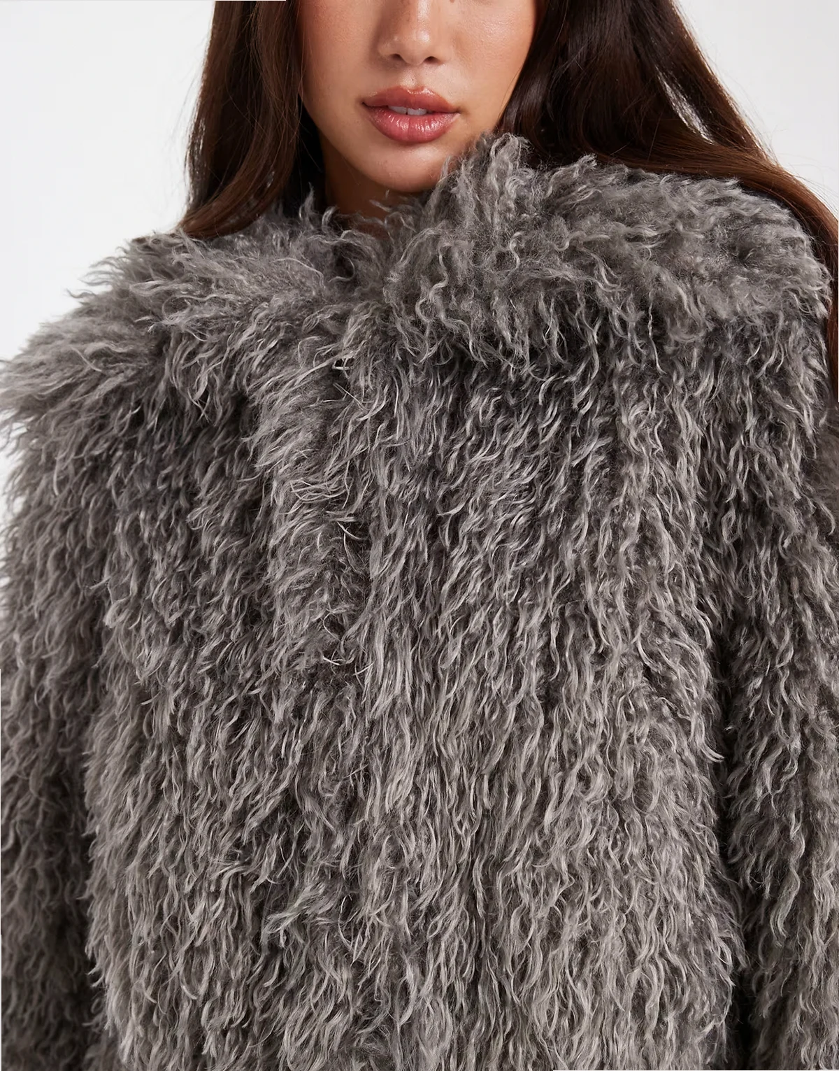 – Cocoon-Mantel aus Kunstpelz in Anthrazitgrau mit gerippten Bündchen