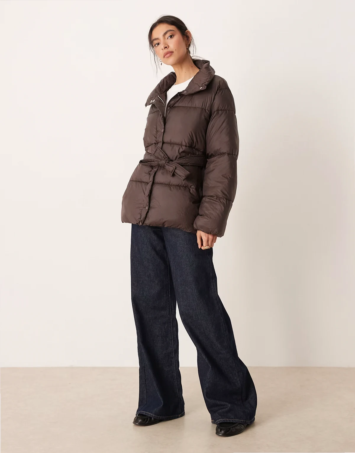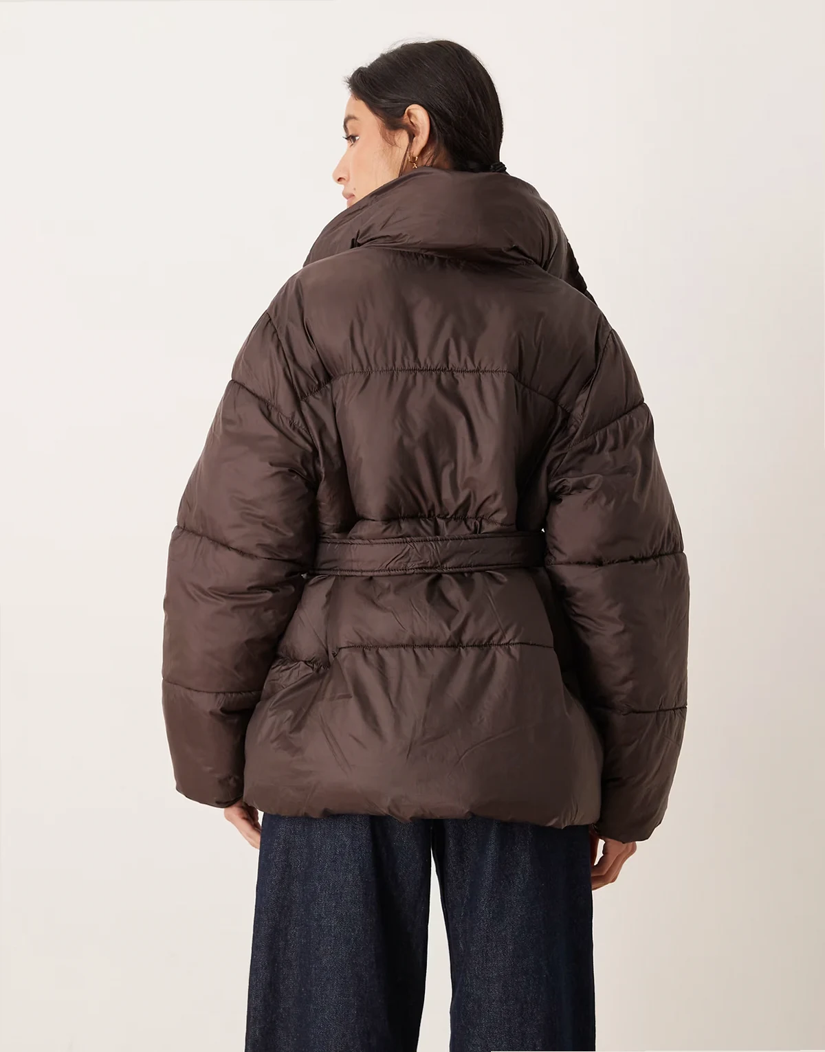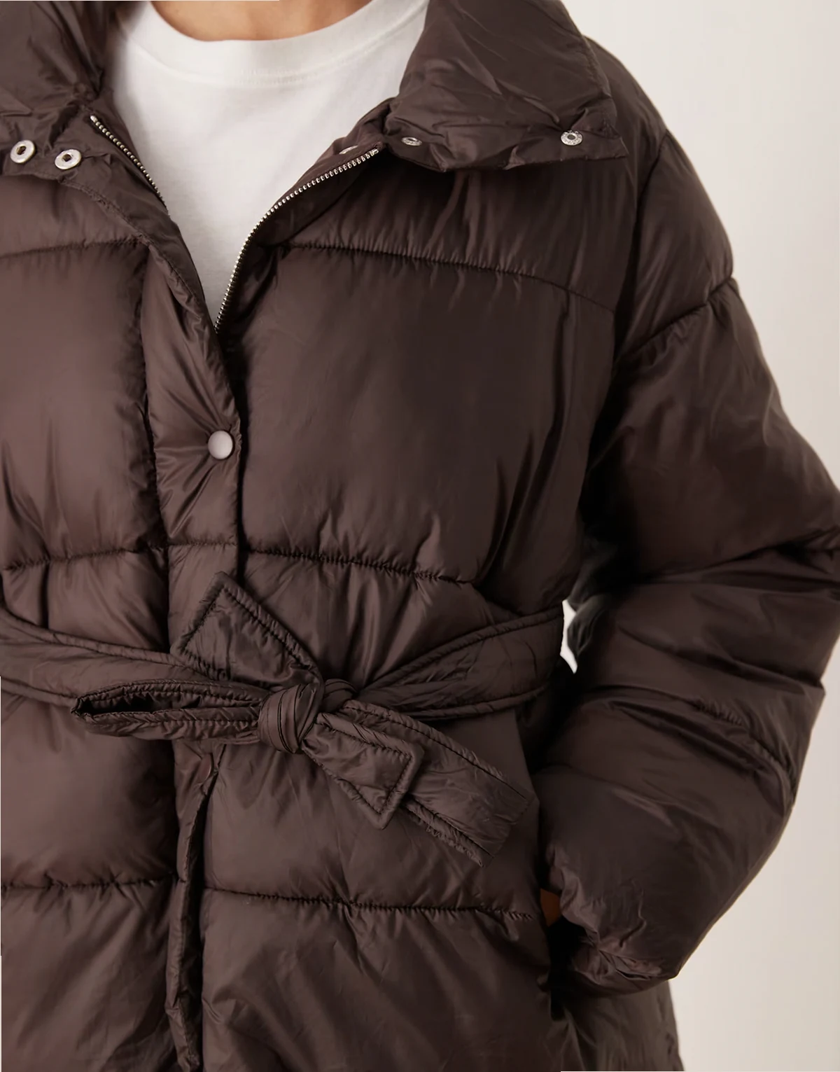 – Pufferjacke in Dunkelbraun mit Gürtel