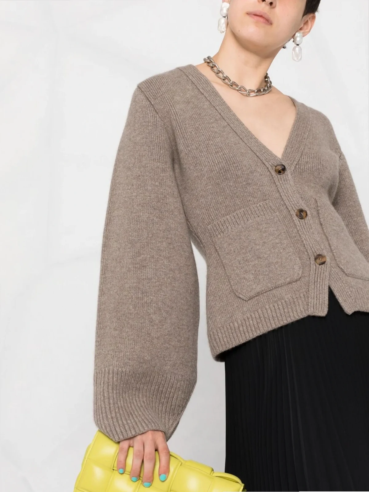 Gestricktes Design, V-Ausschnitt, Knopfverschluss vorne, lange Ärmel, zwei aufgesetzte Taschen vorne, gerippter Saum. Material: Kaschmir.