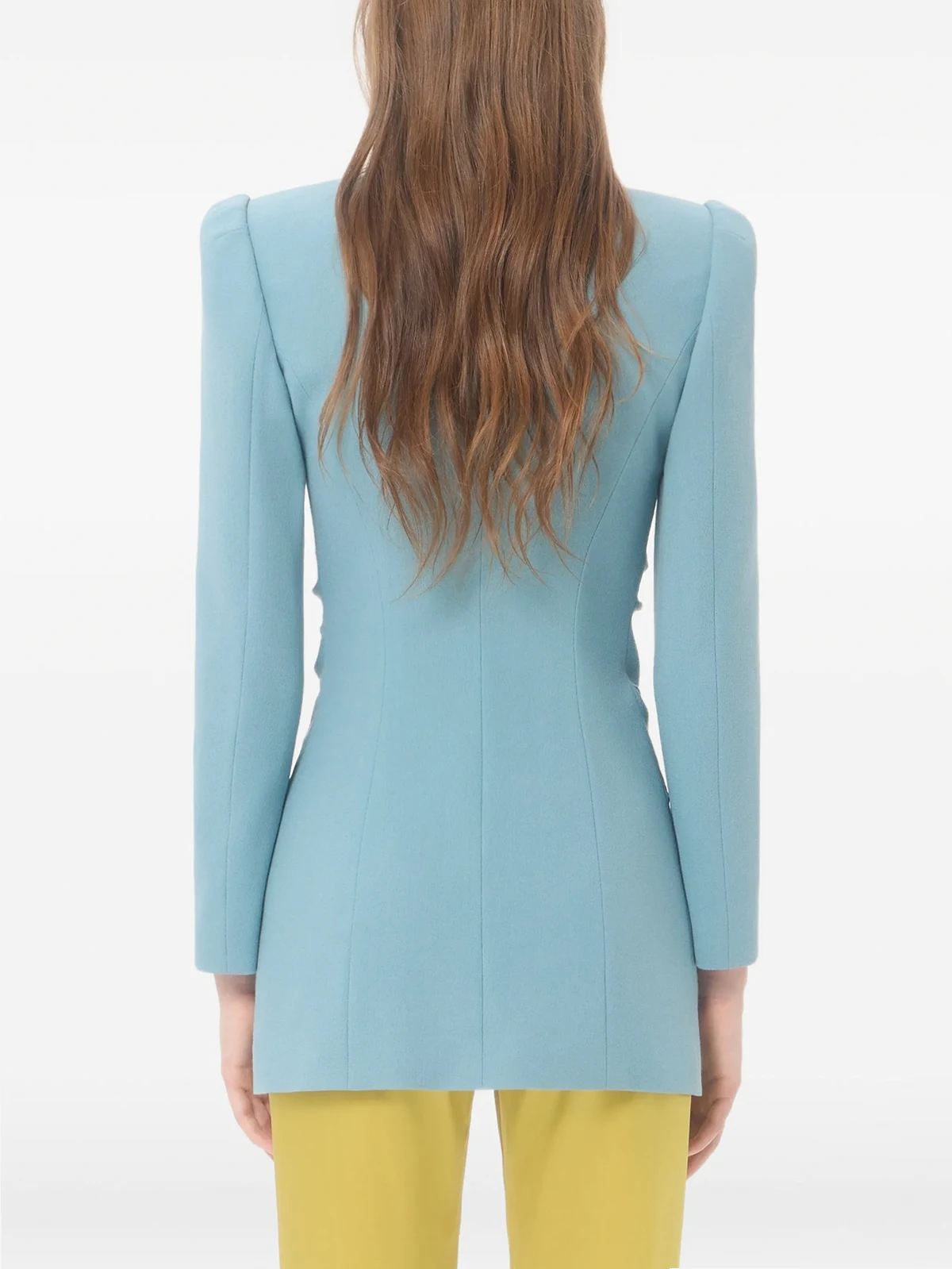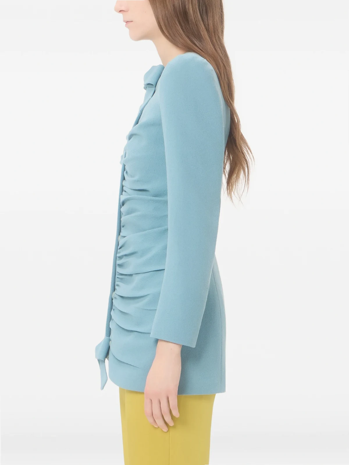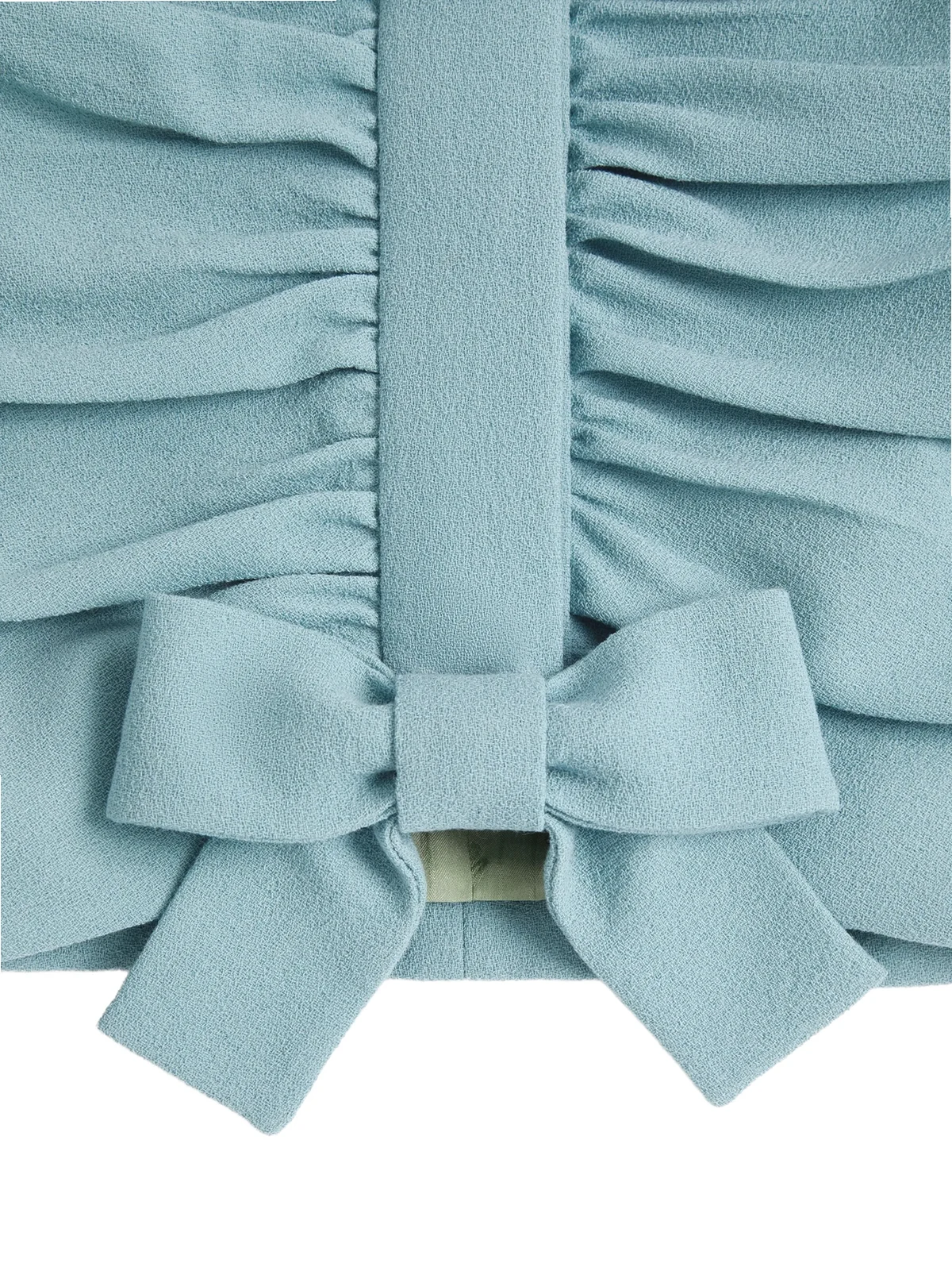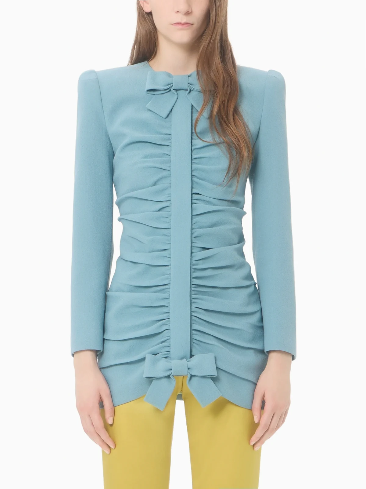 Jacket in crispy light wool with front ruching and matching bows padded shoulders front zip closure with snap buttons crispy light wool flower, stripes, and VLogo lining The model is 176 cm / 5'9" tall and wears an Italian size 40