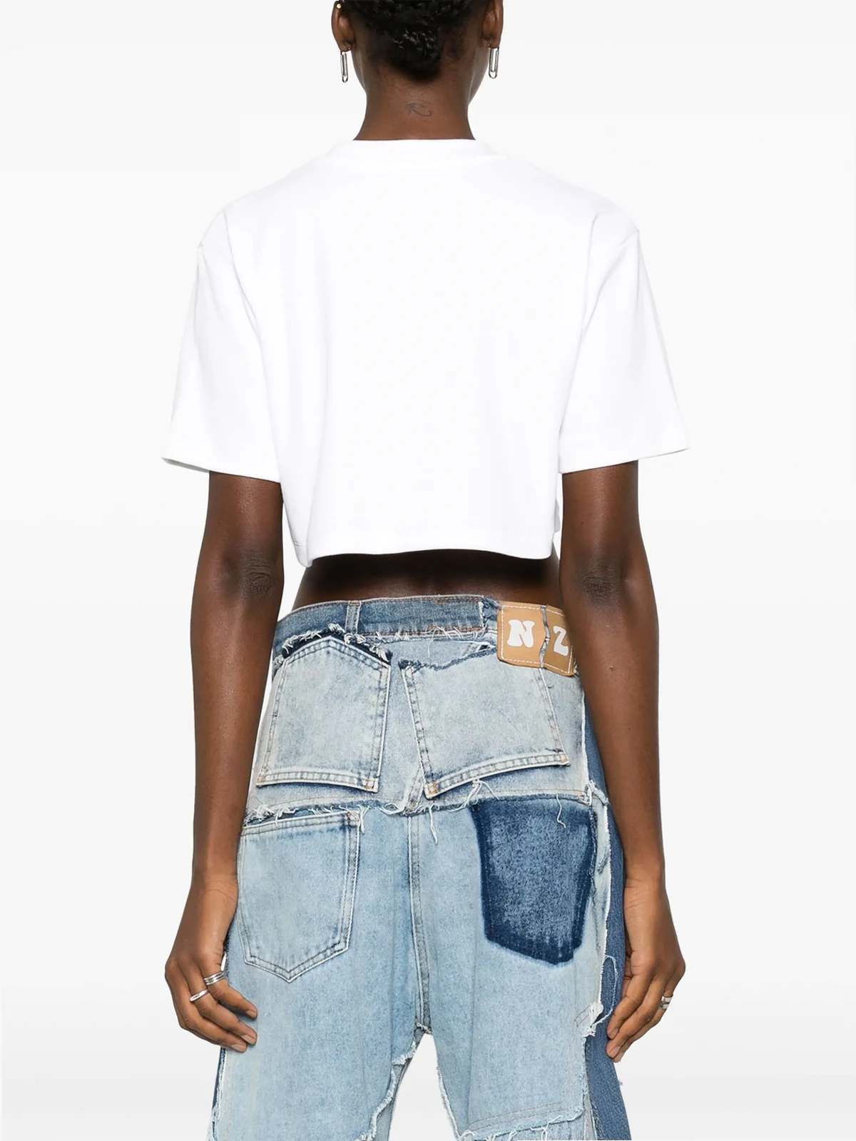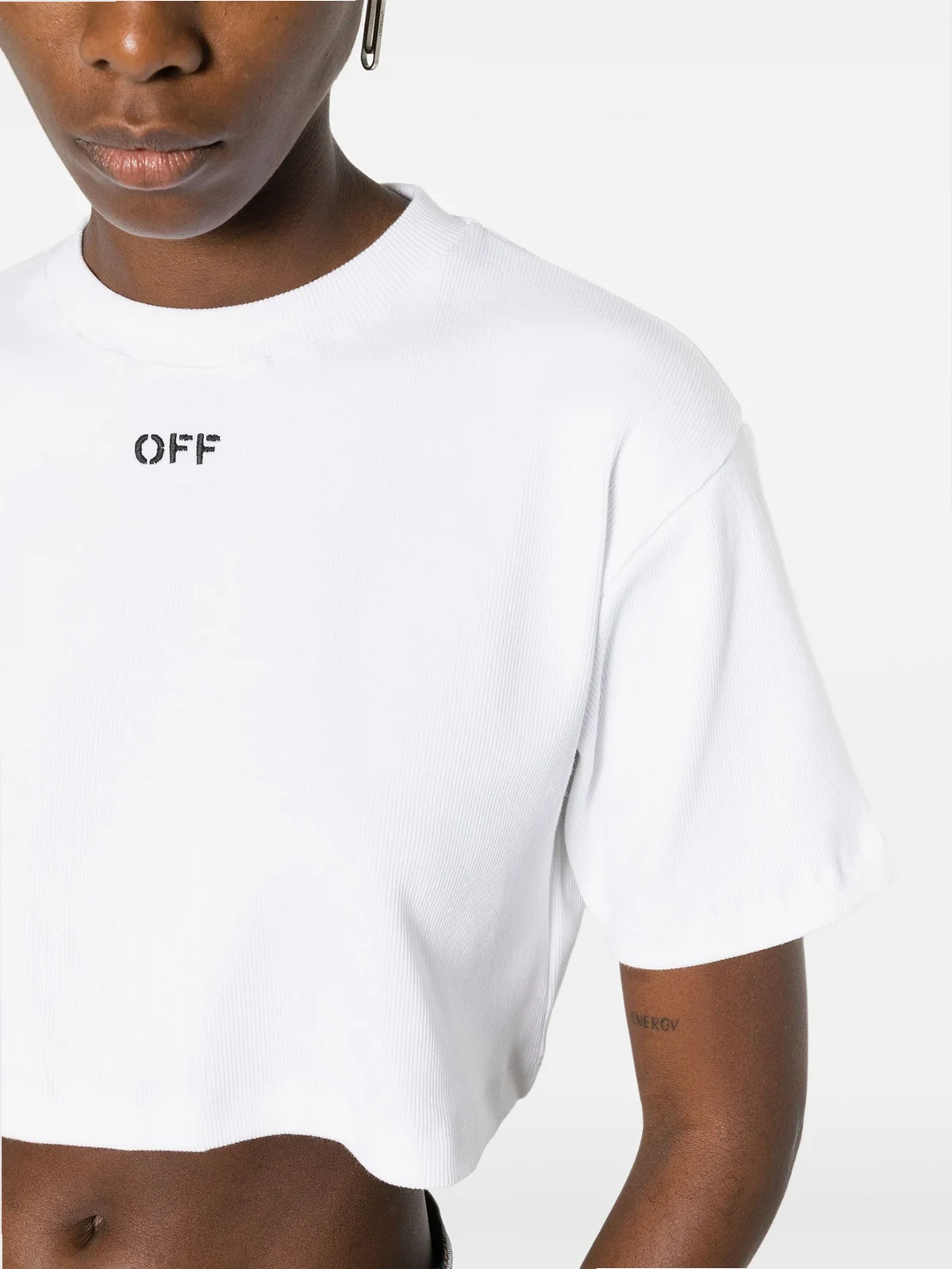 Weiß, gerippter Feinstrick, Logo-Print vorne, runder Ausschnitt, tiefe Schulter, kurze Ärmel, gerader Saum, Cropped-Design.