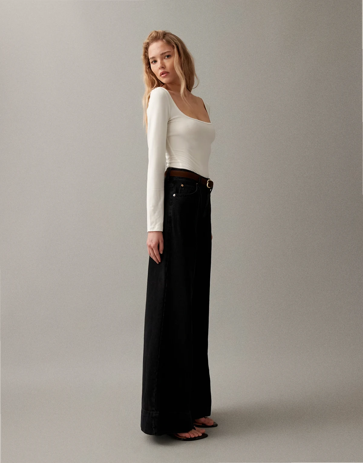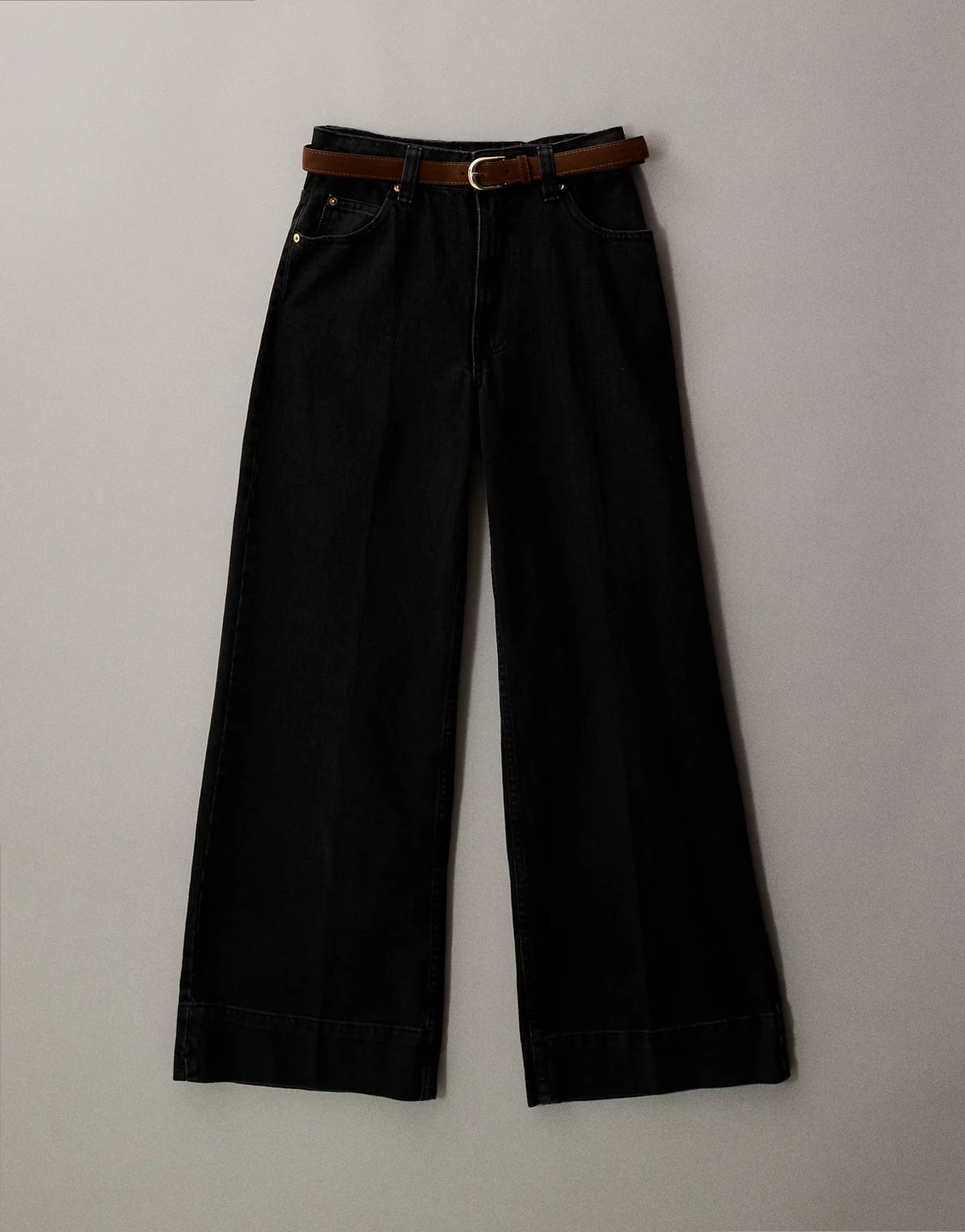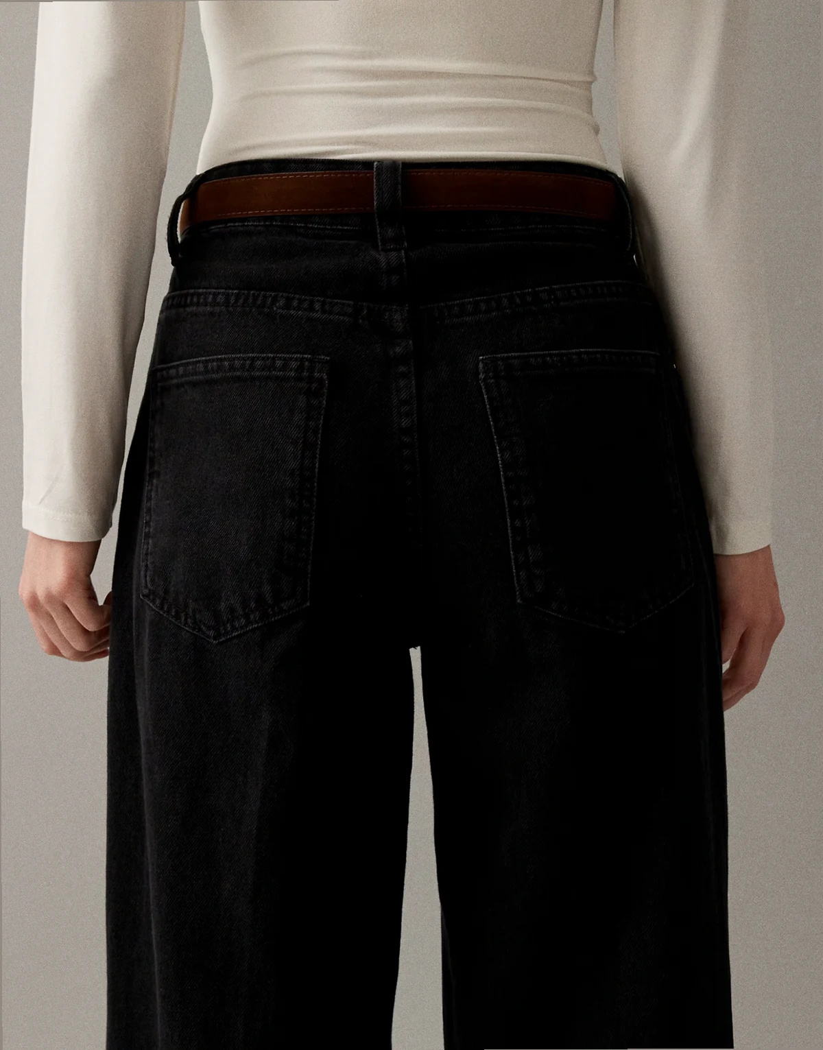 – Jeans in Schwarz mit weitem Bein, Gürtel und Bügelfalte vorne