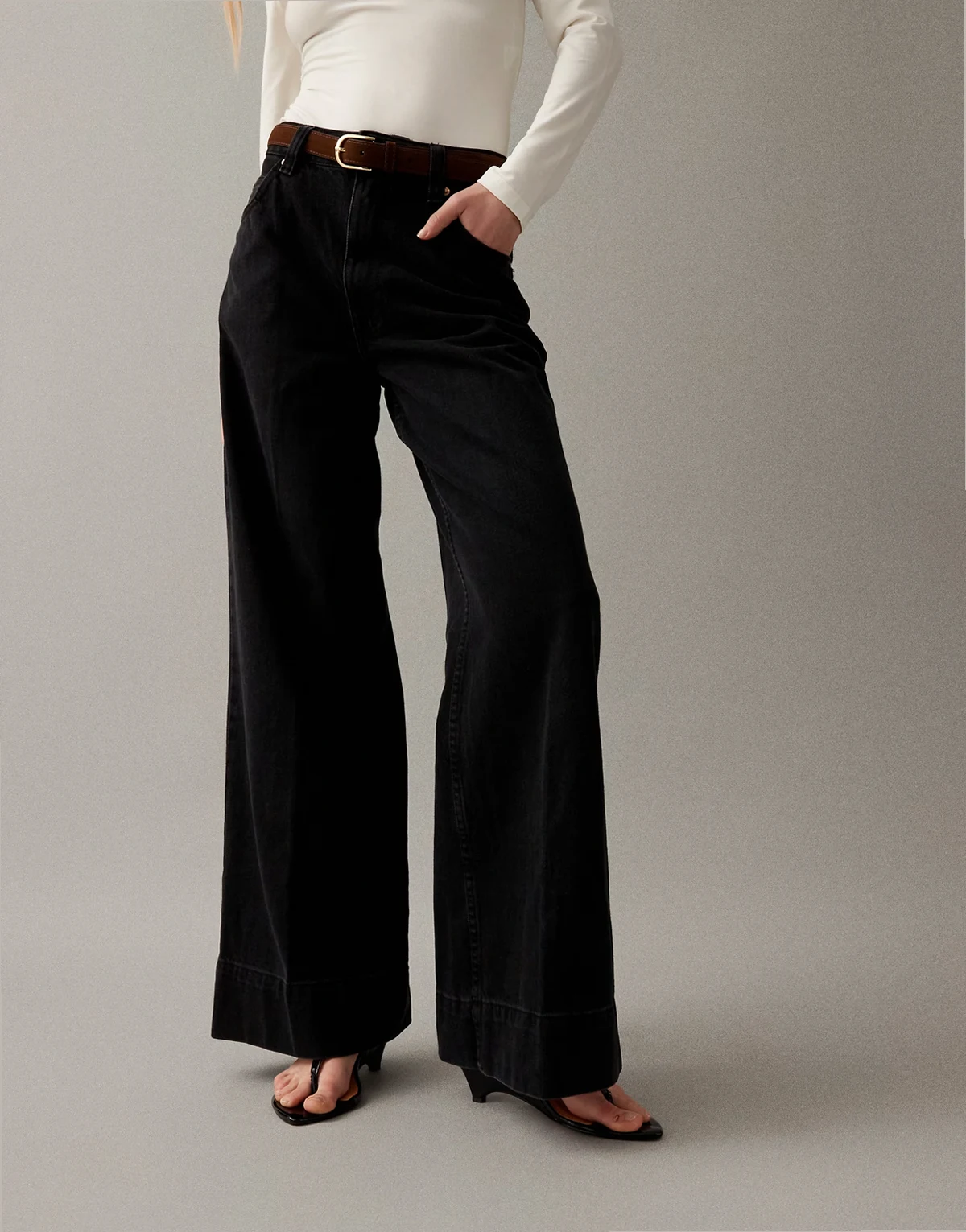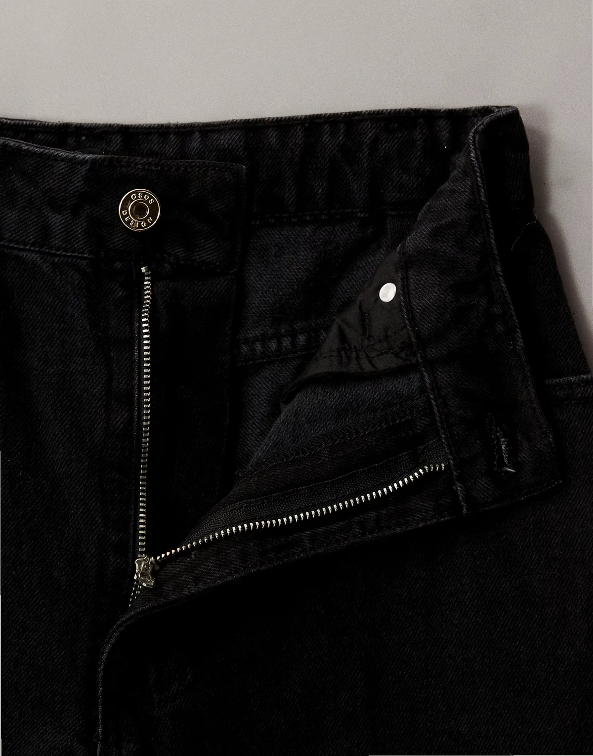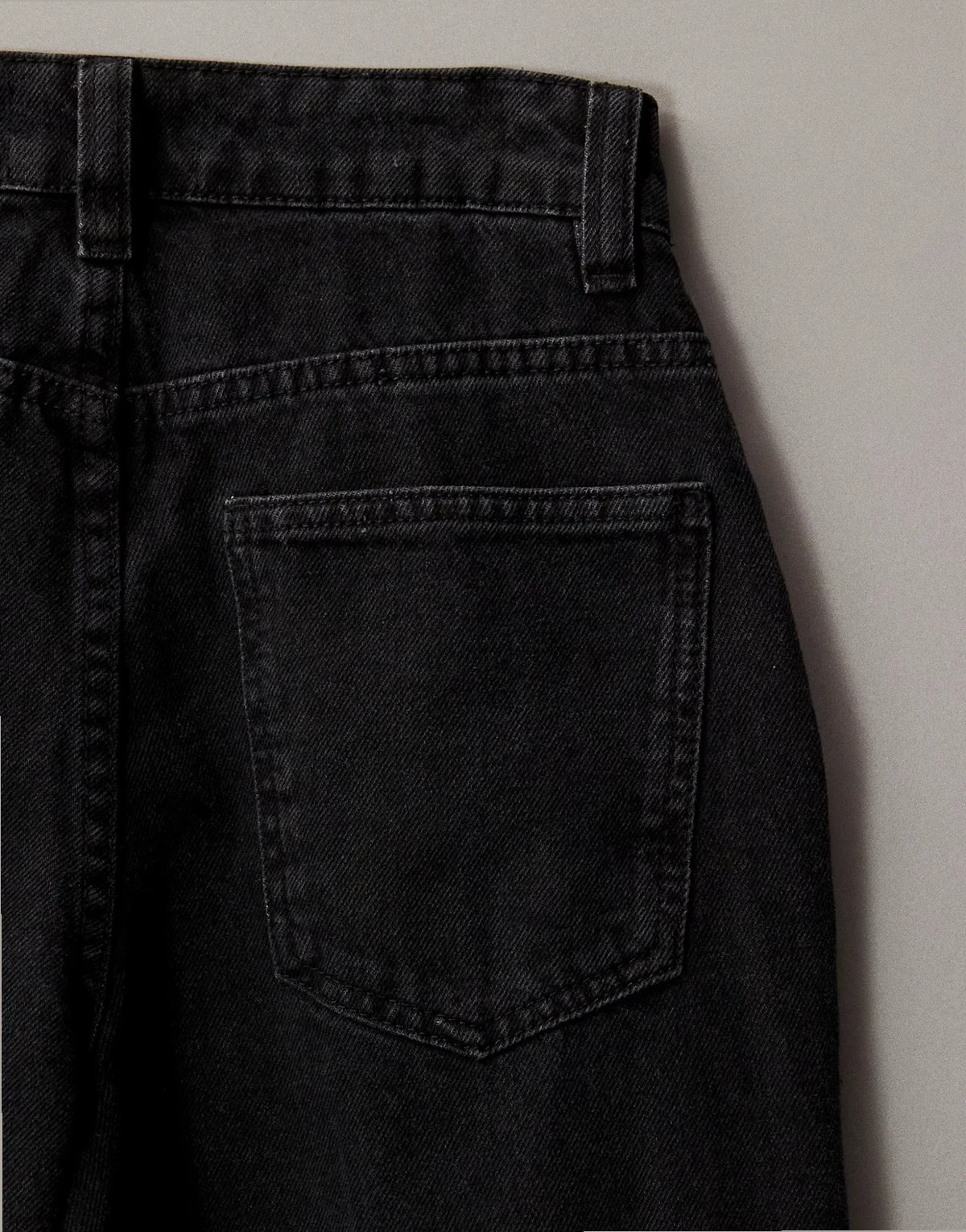– Jeans in Schwarz mit weitem Bein, Gürtel und Bügelfalte vorne