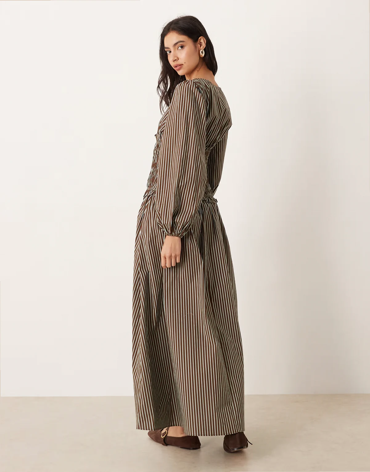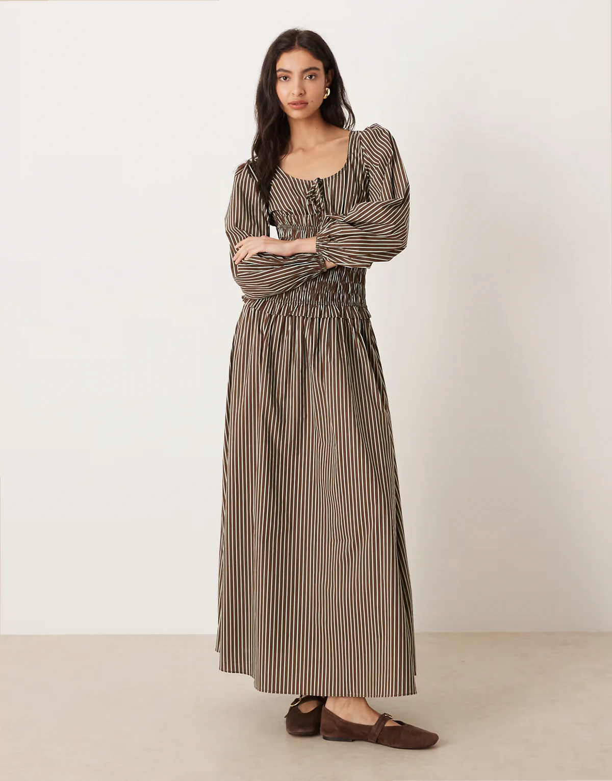 – Gestreiftes Maxikleid in Braun-Blau mit abfallender Taille und gesmoktem Oberteil