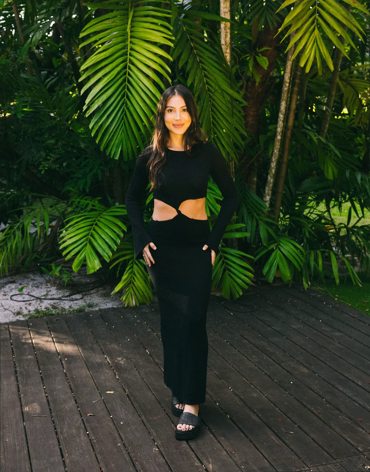 – Maxi-Strandkleid aus Strick in Schwarz mit Zierausschnitt-Details