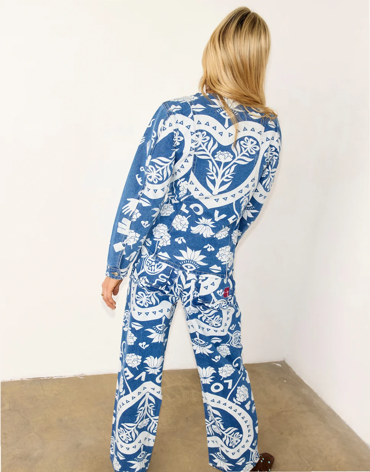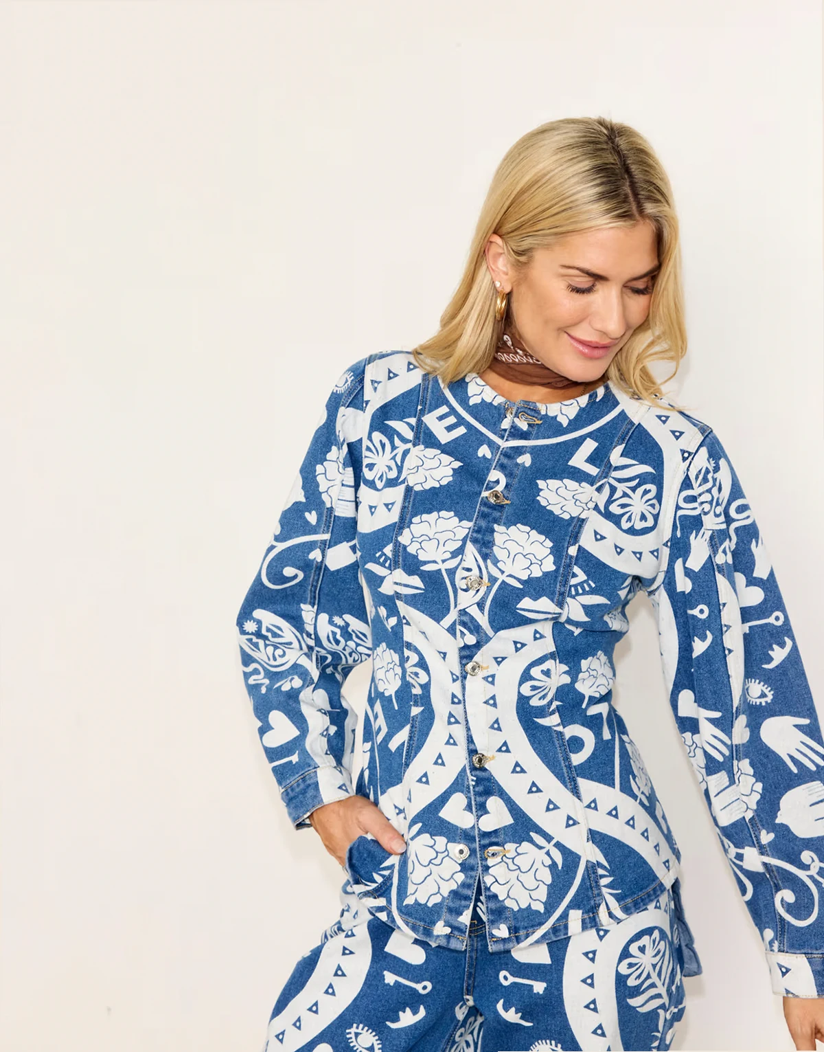 – Amara – Strukturierte Jeansjacke in Blau mit Muster und Ballonärmeln