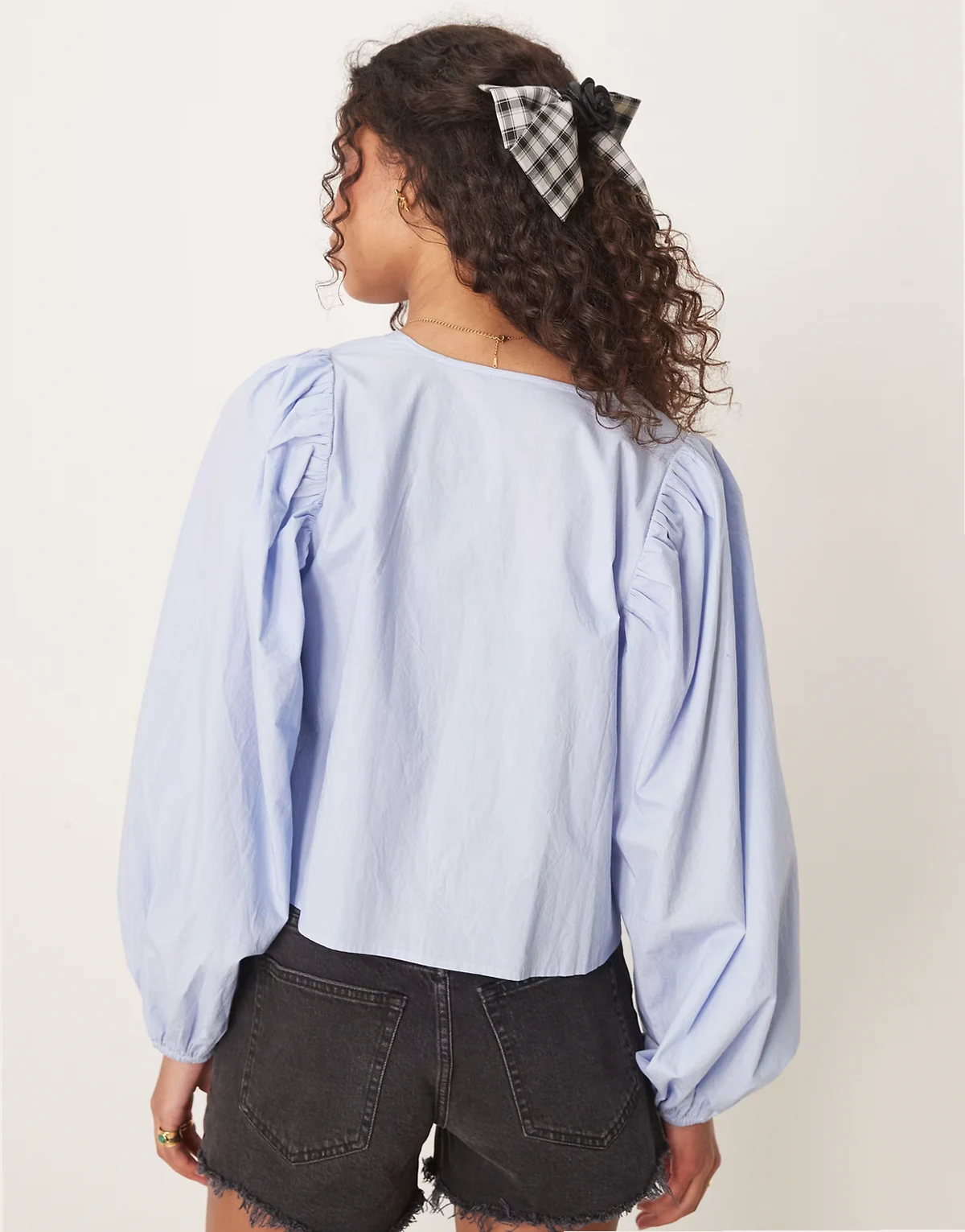 – Blusenoberteil in Blau mit voluminösen Ärmeln und Bindedetails vorne