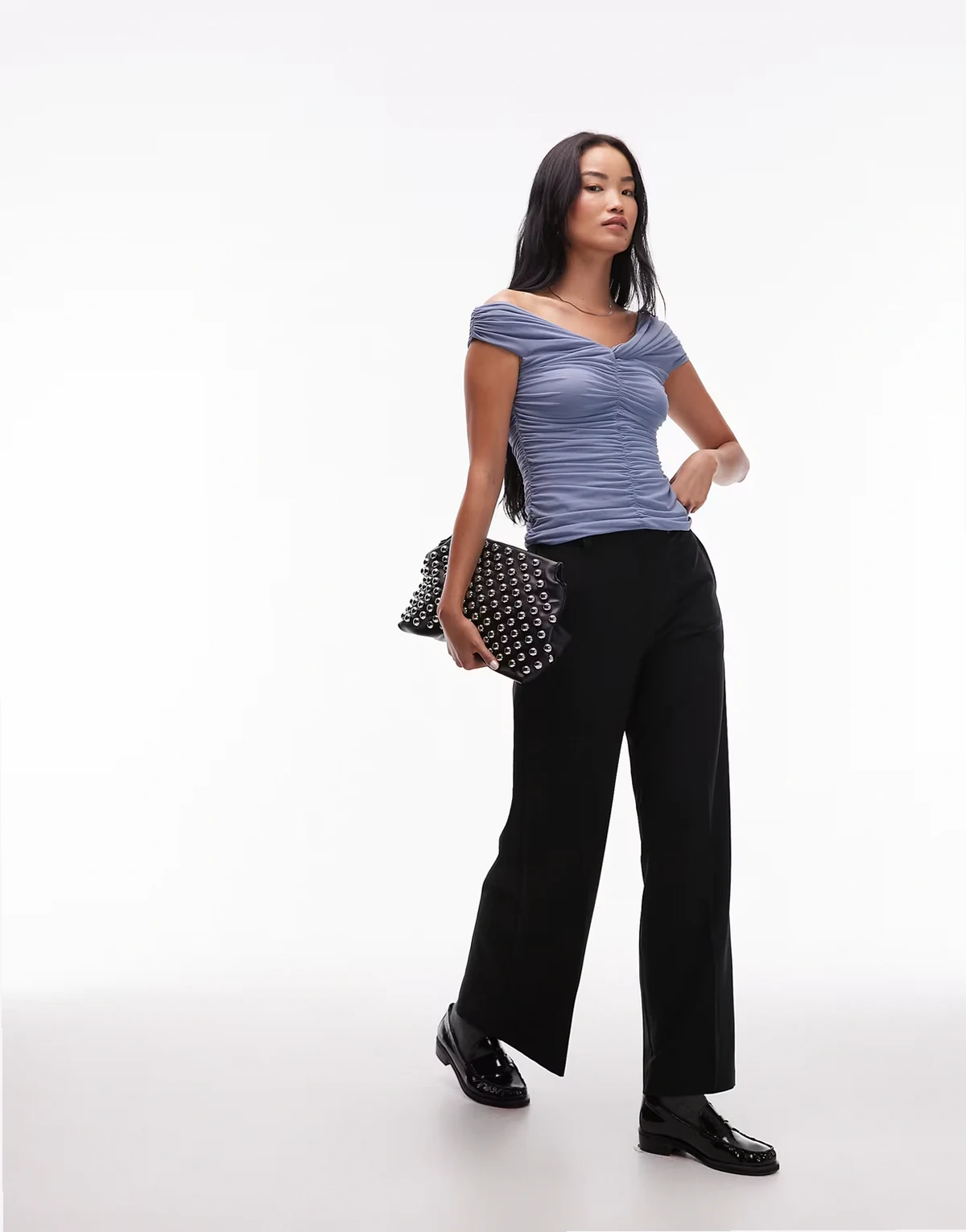 – Kurzärmliges, gerafftes, drapiertes Oberteil mit Netzstoff in Mittelblau