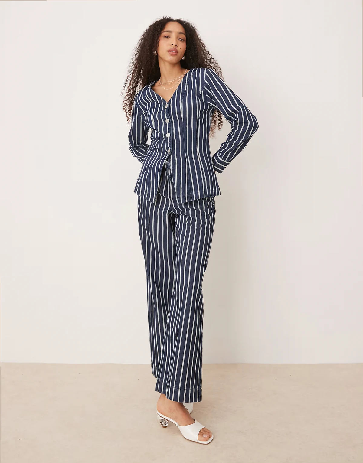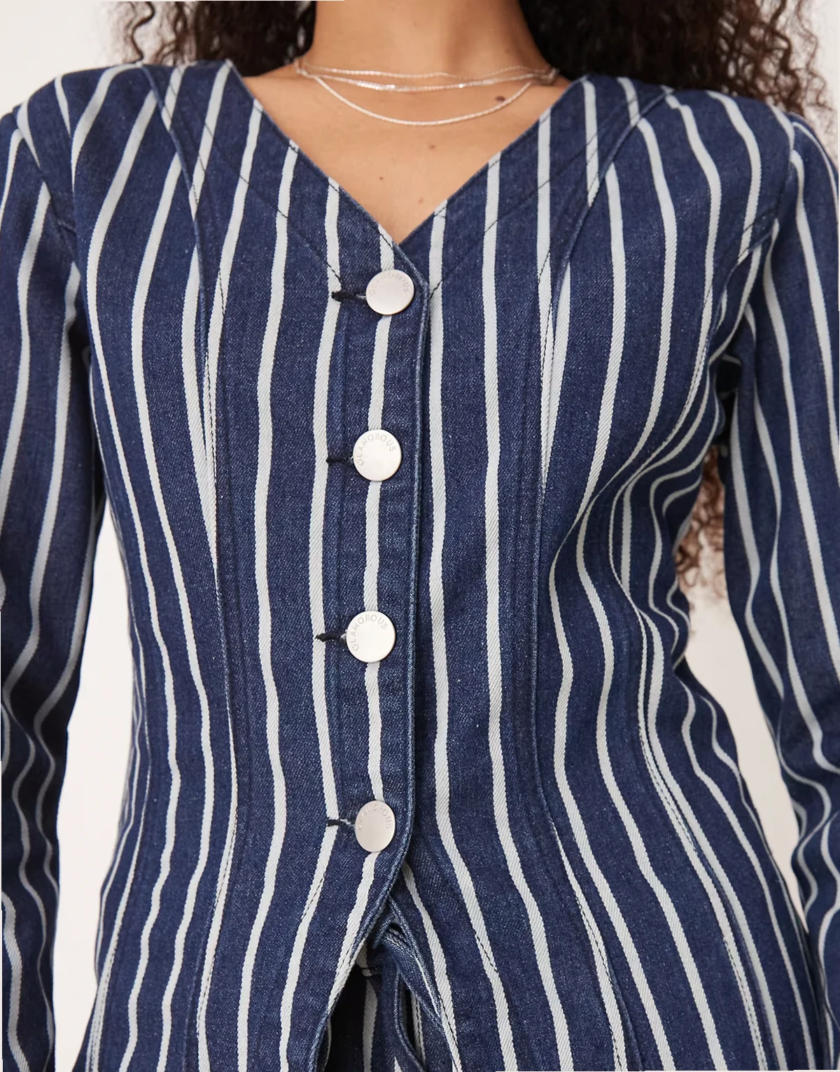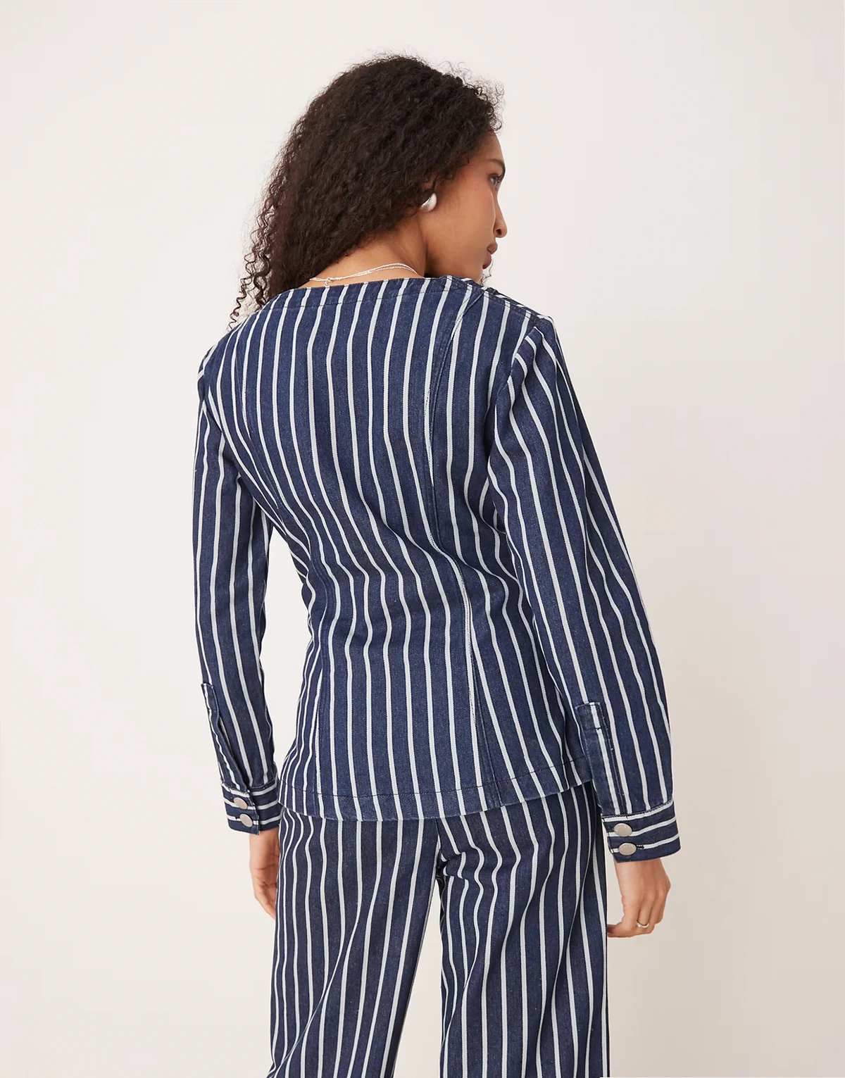 – Langärmlige Jeans-Bluse in gestreiftem Blau mit V-Ausschnitt