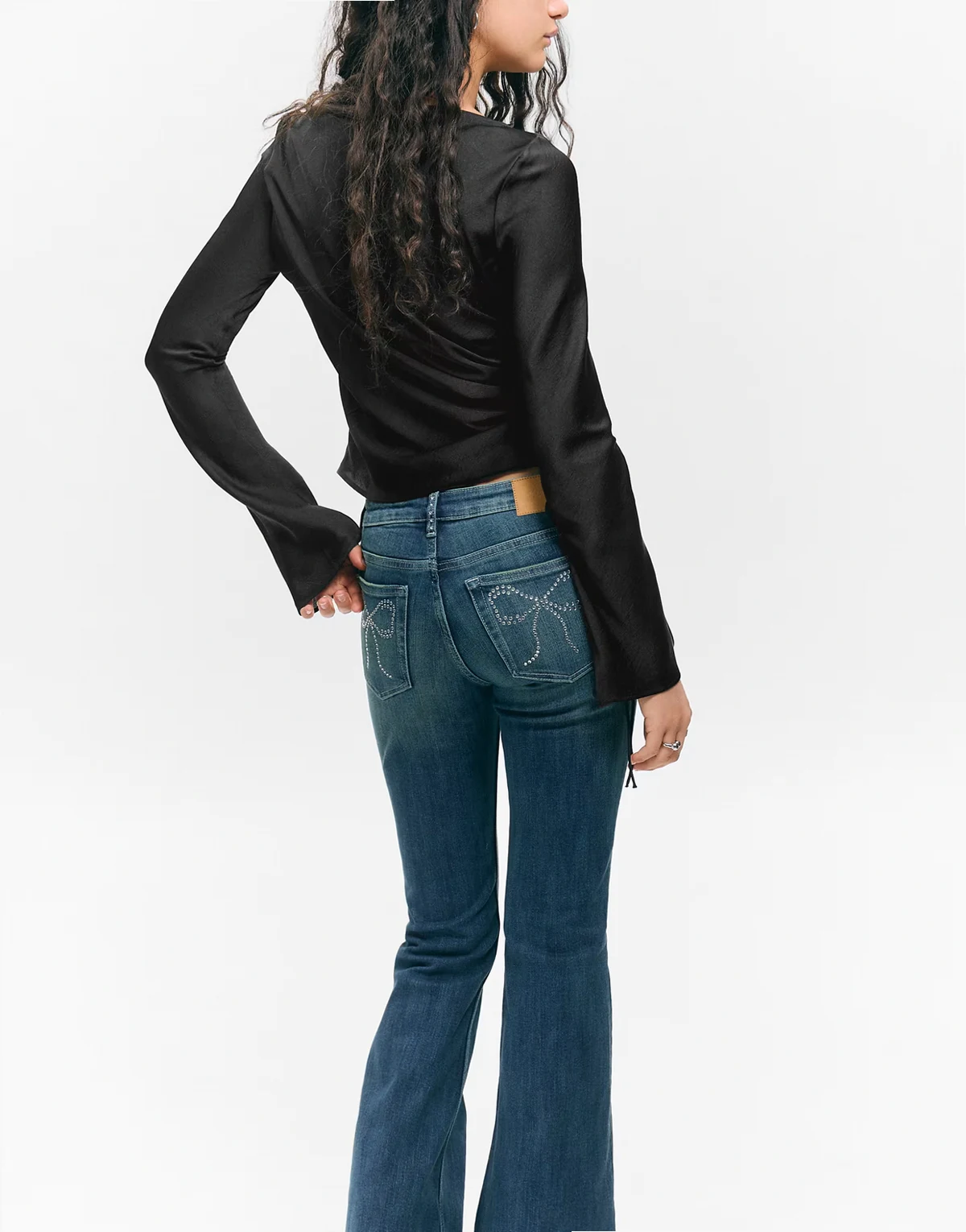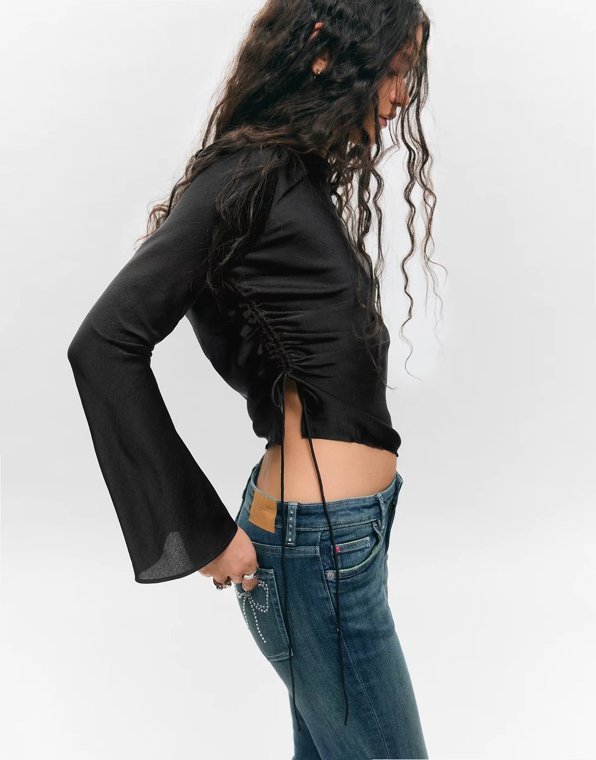 – Langärmliges Oberteil aus Knitter-Satin in Schwarz mit U-Boot-Ausschnitt