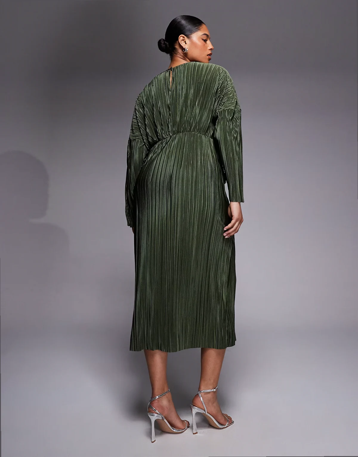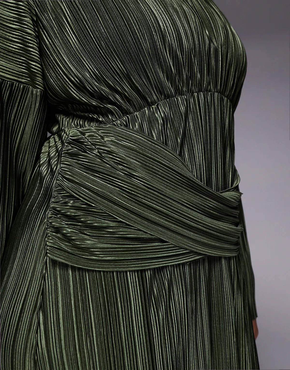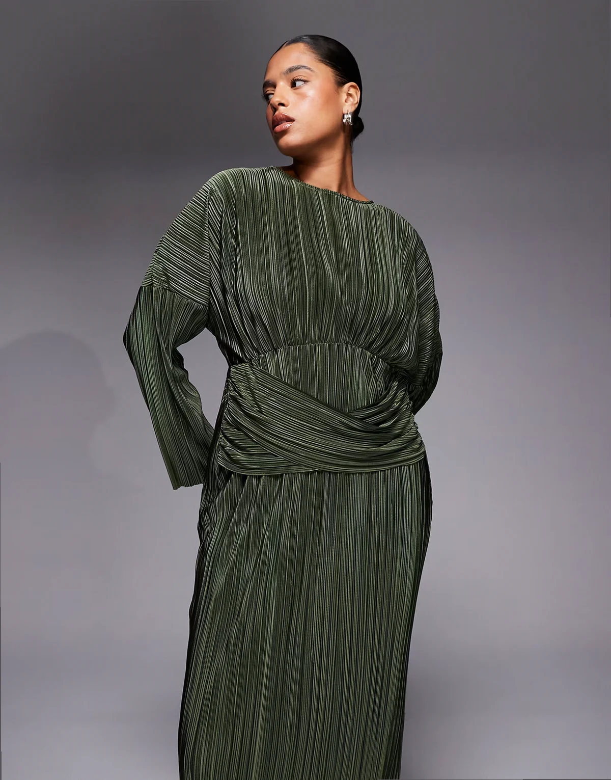 ASOS DESIGN Curve – Langärmliges, plissiertes Maxikleid in Khaki mit drapierter Taille