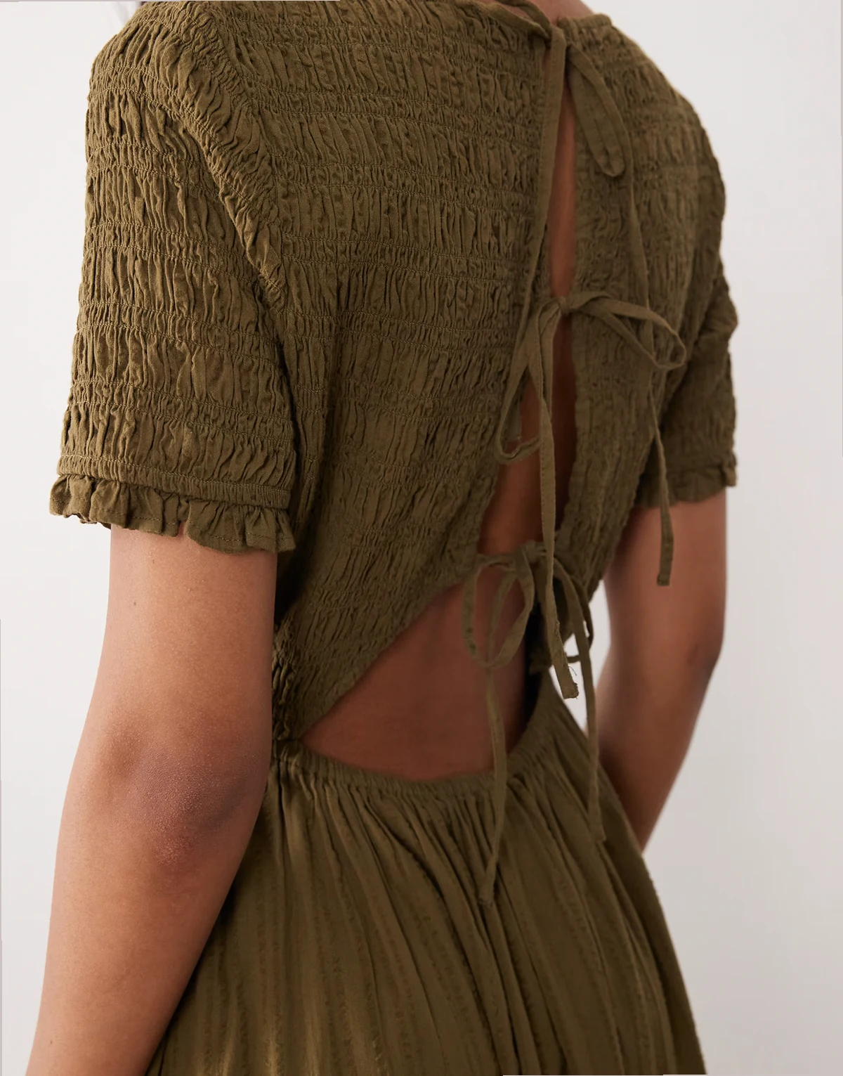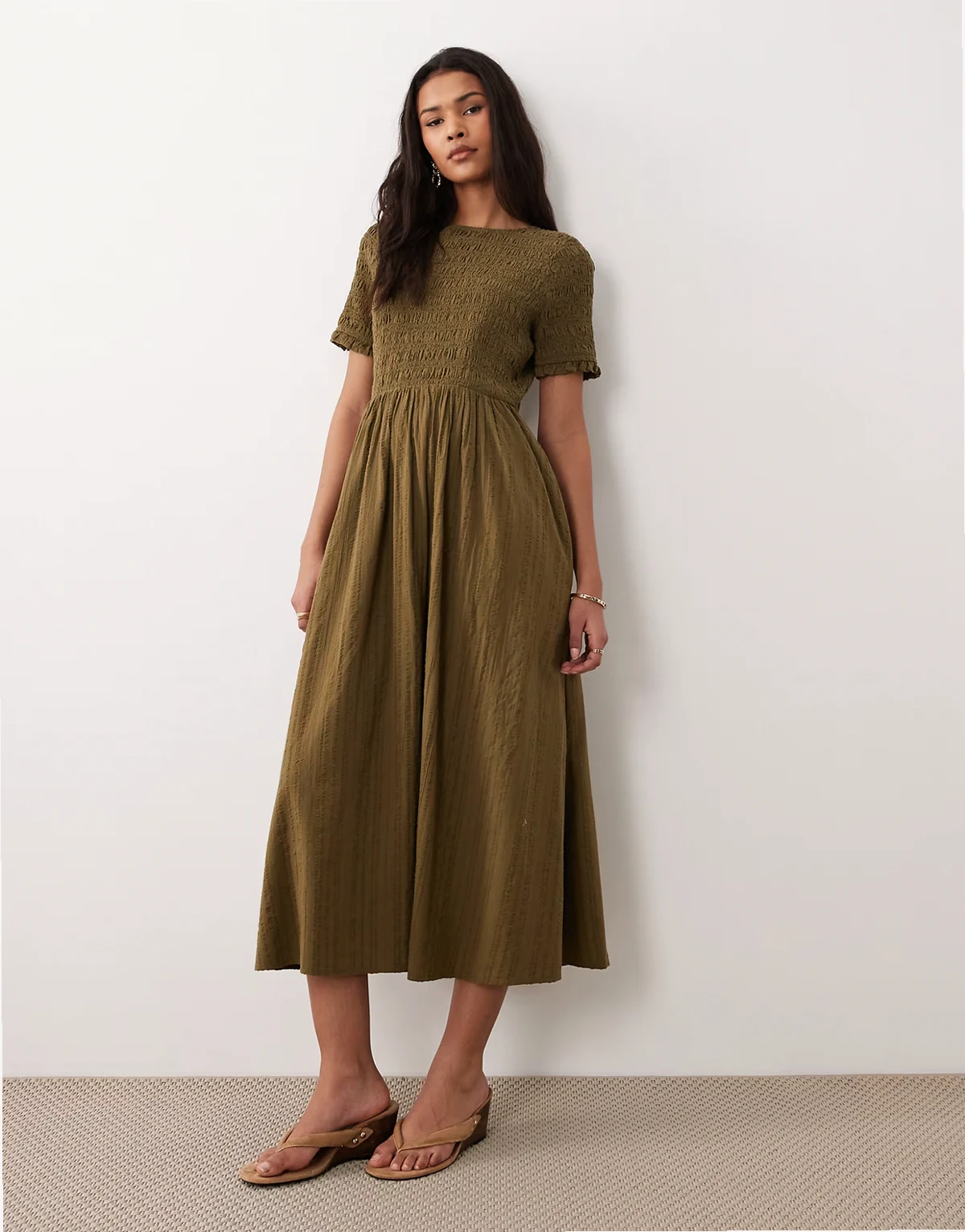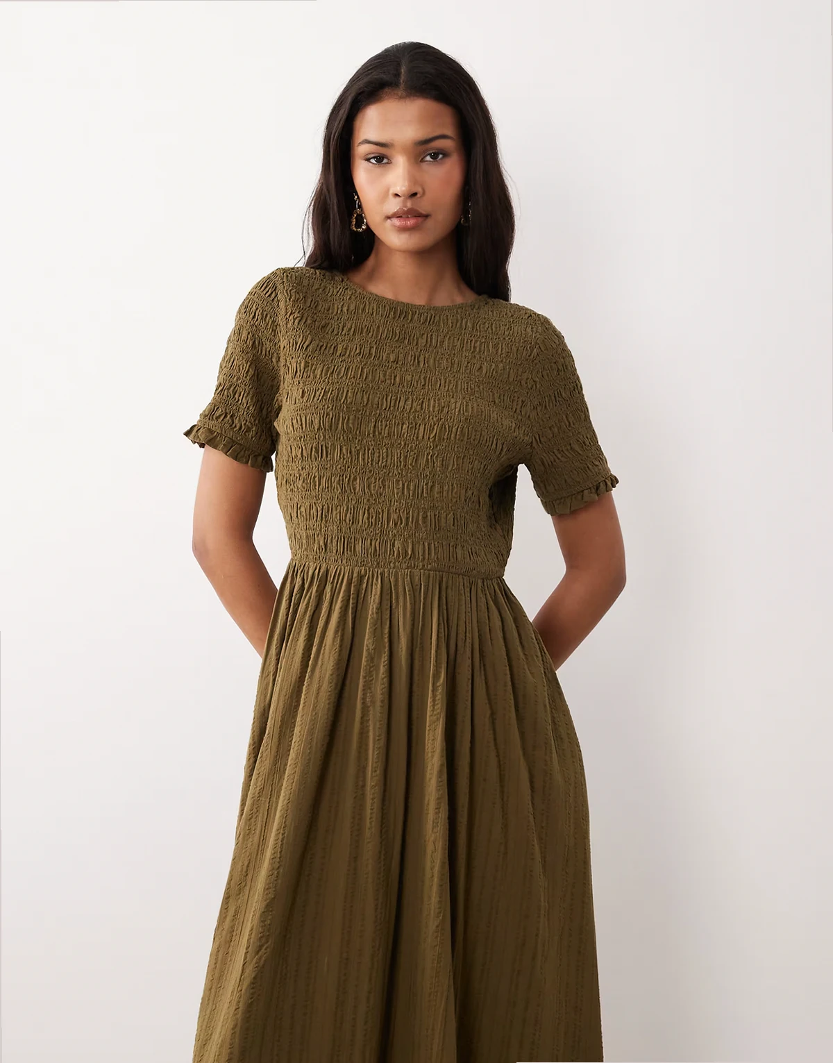 – Leah – Gesmoktes Midikleid in Khaki mit weitem Rockteil