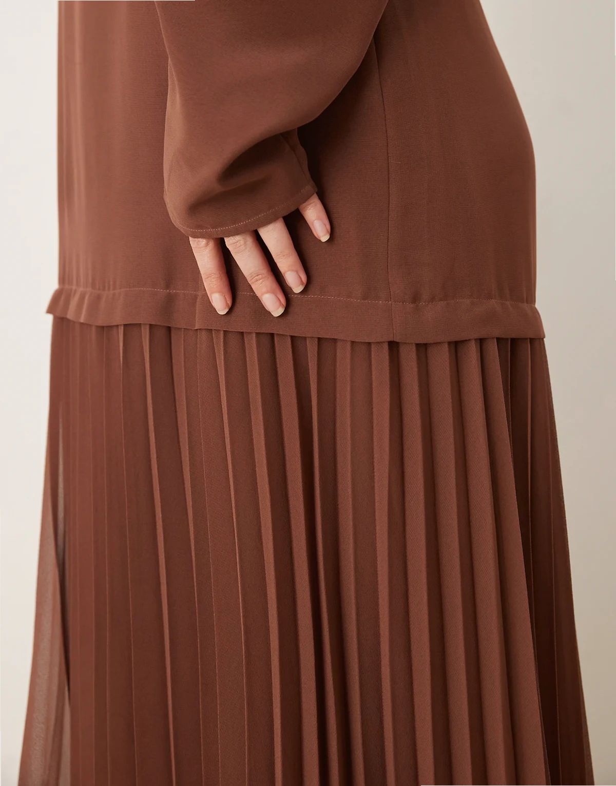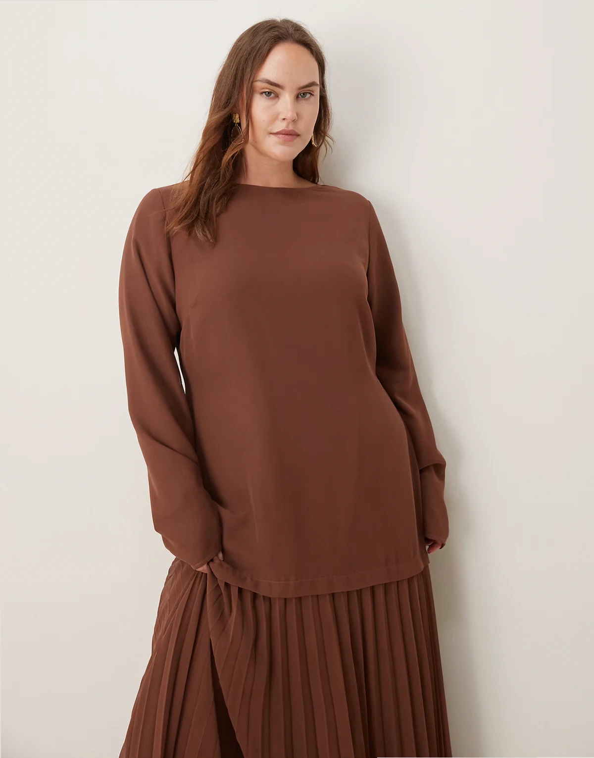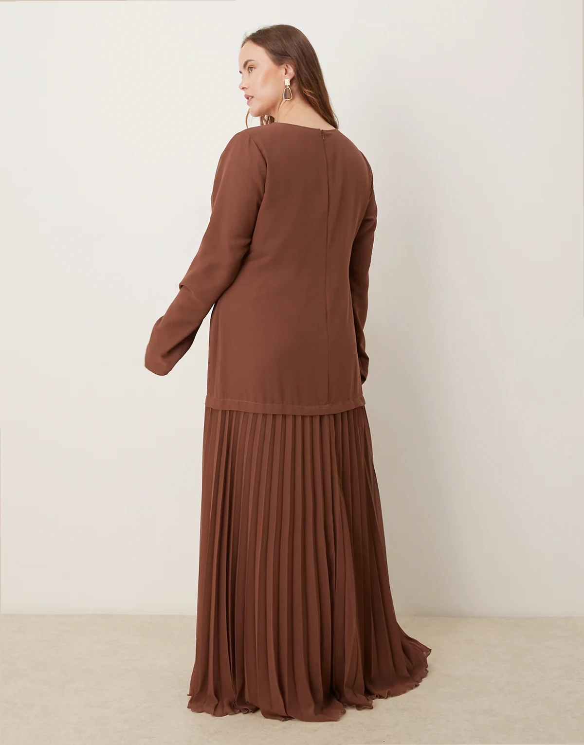 ASOS DESIGN Curve – Langärmliges Maxikleid in Schokobraun mit plissiertem Rock