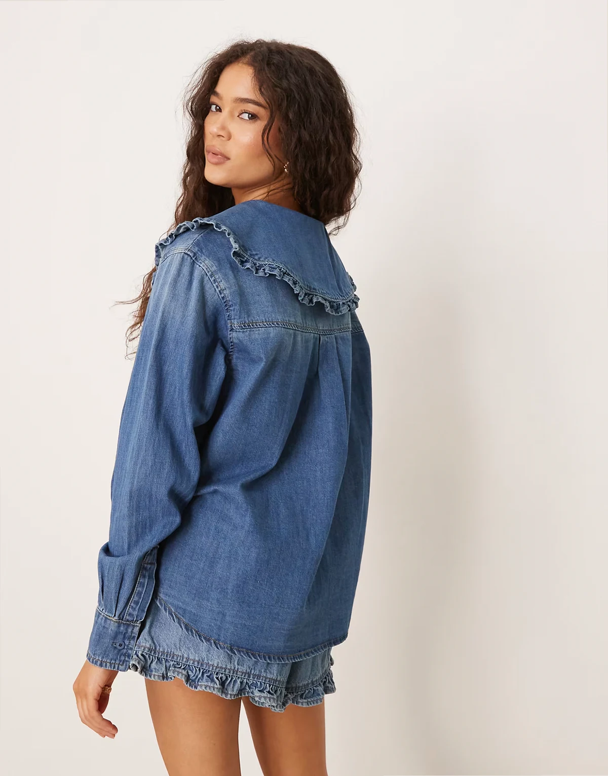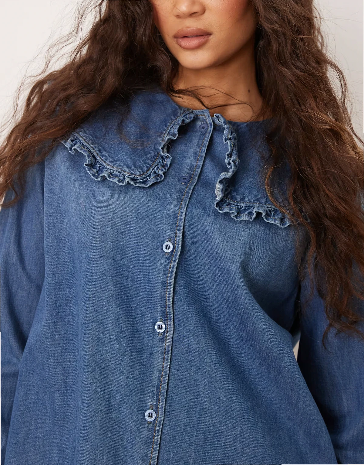 – Jeanshemd in Blau mit Rüschen-Kragen und Knopfleiste