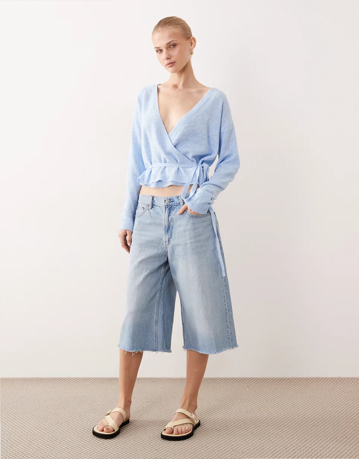 – Strickjacke in meliertem Hellblau mit Bindegürtel