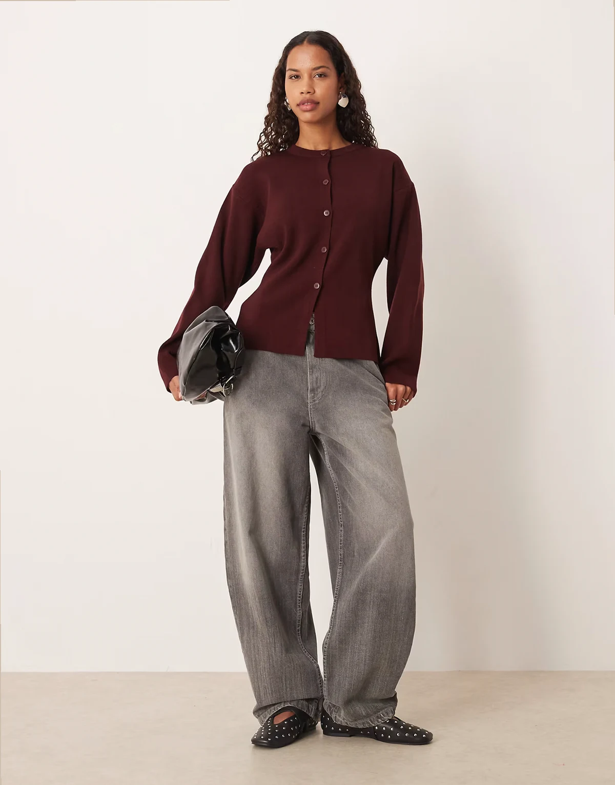 – Strukturierte Strickjacke in Pflaume mit Rundhalsausschnitt