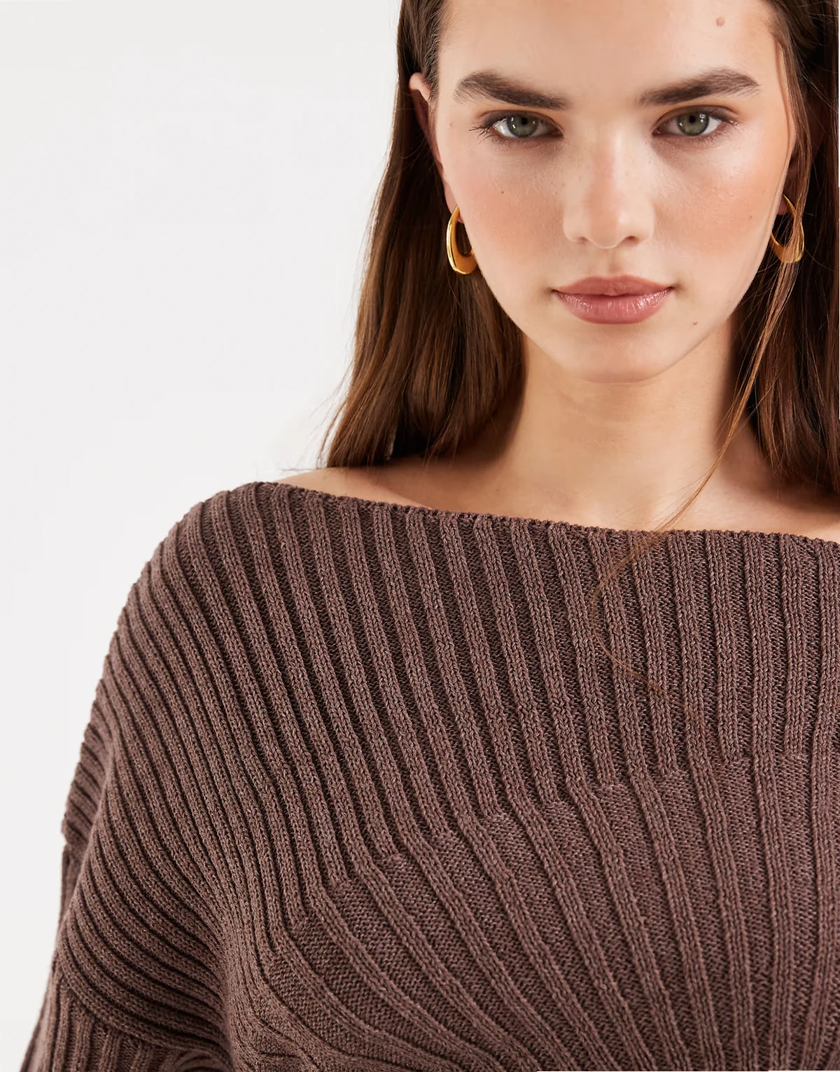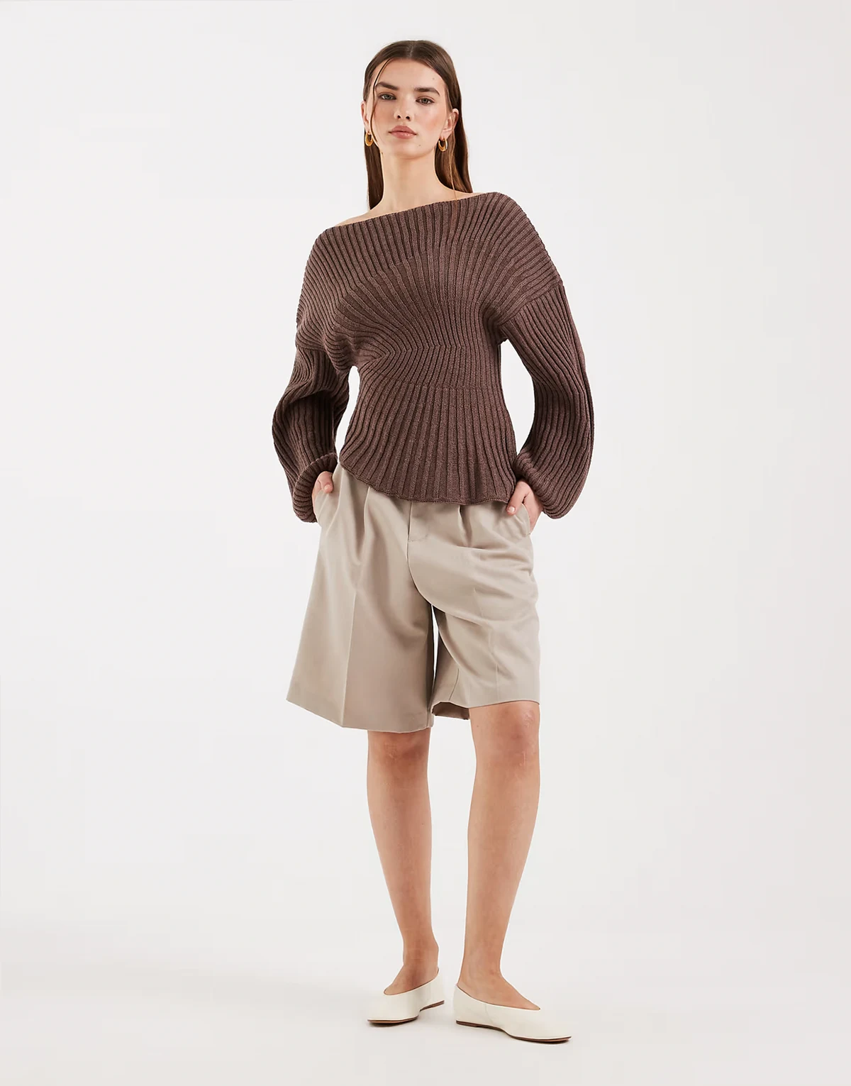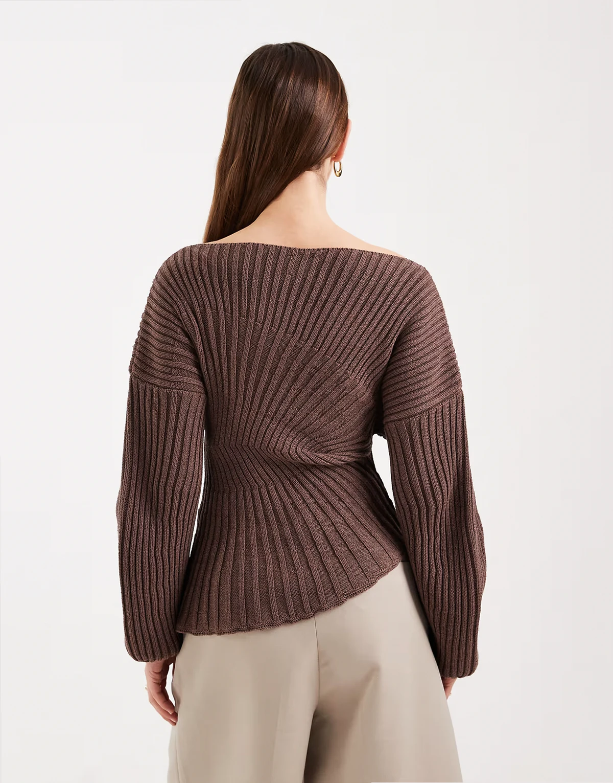 – Taillierter, plissierter Strickpullover in Braun