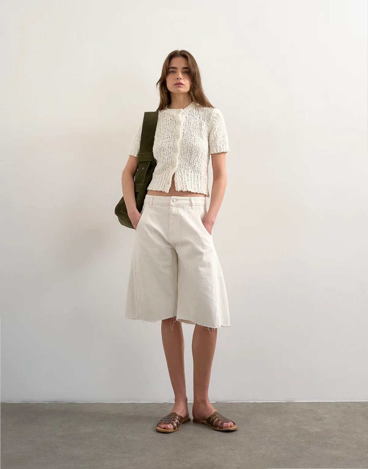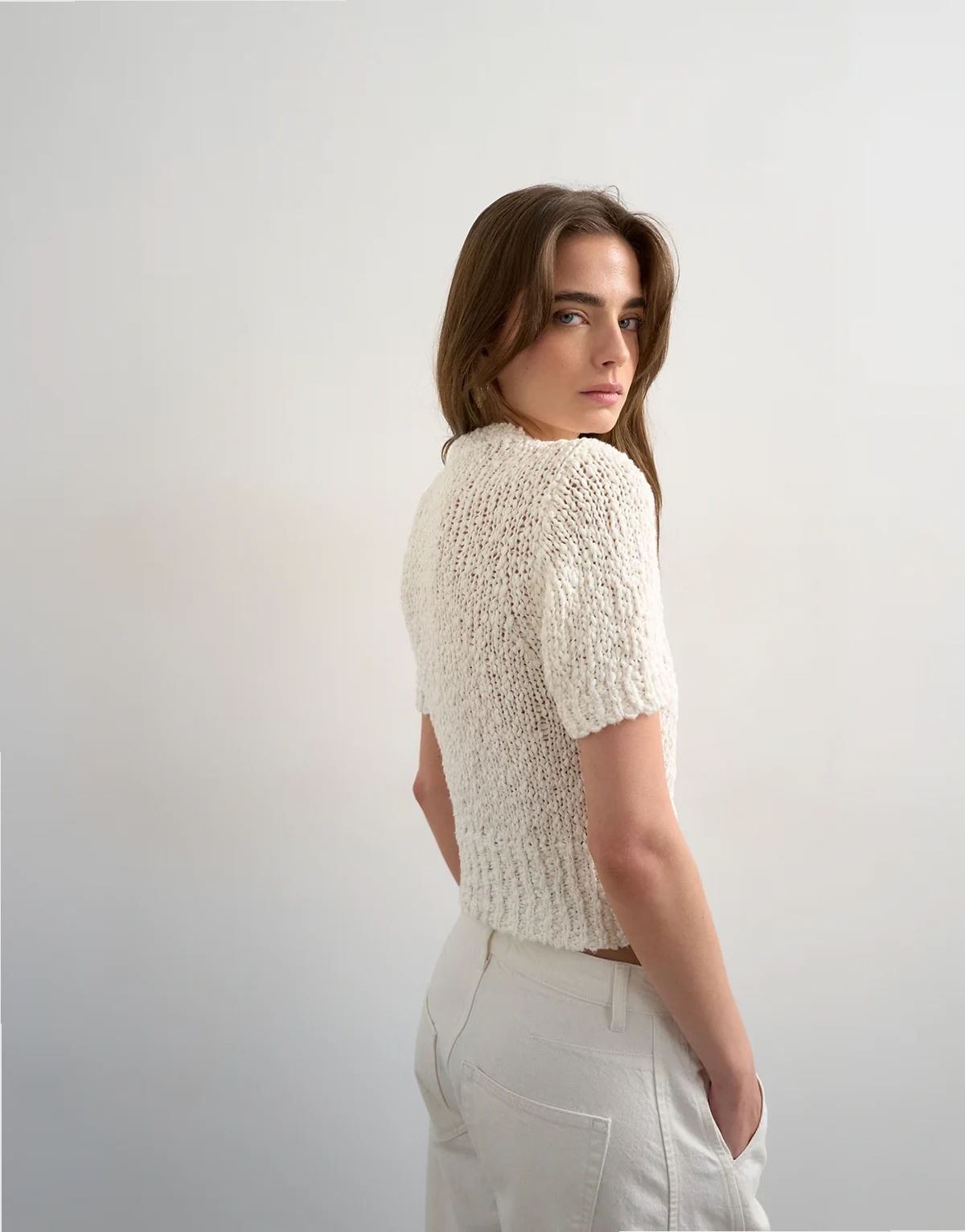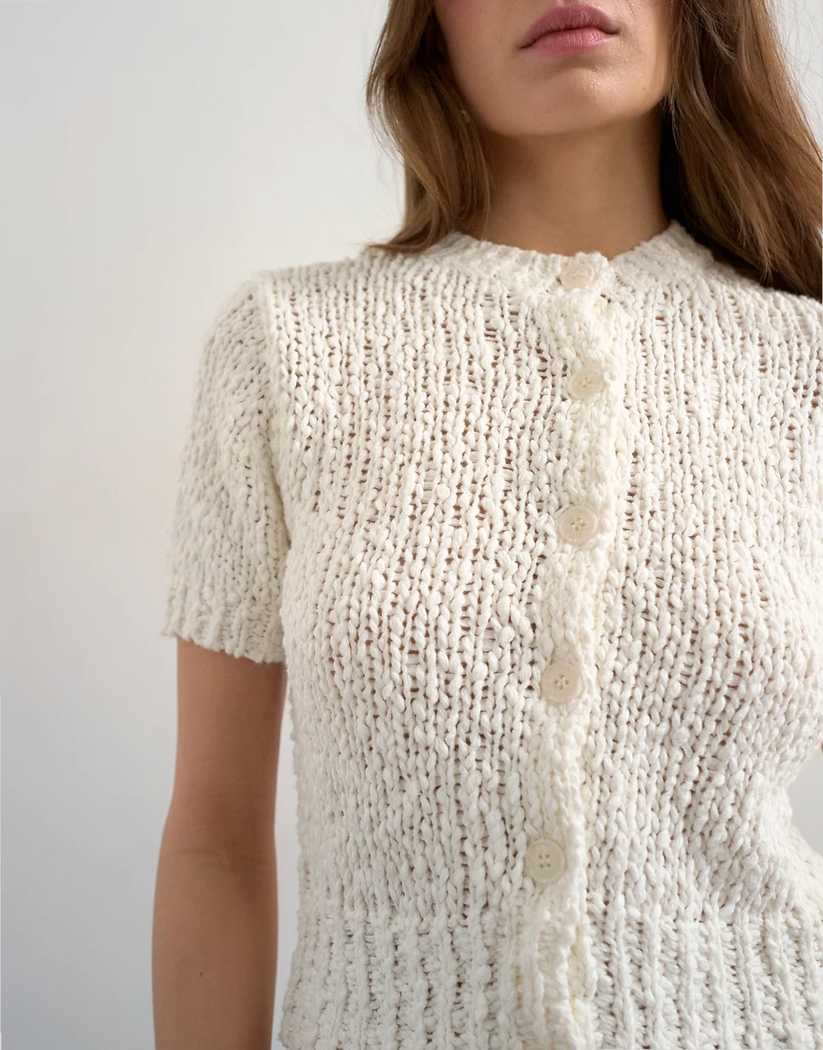 Diese Strickjacke ist aus einem groben, strukturierten Strickstoff in einem elfenbeinfarbenen Ton gefertigt. Das Modell verfügt über einen Rundhalsausschnitt, kurze Ärmel, eine Knopfleiste und eine schmale Passform.