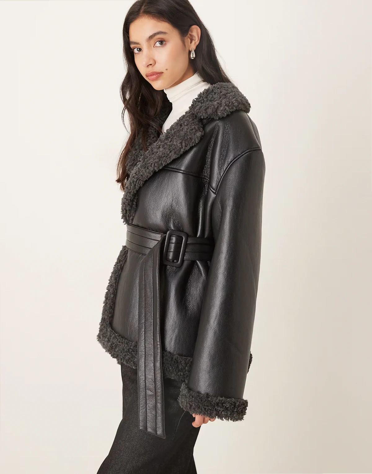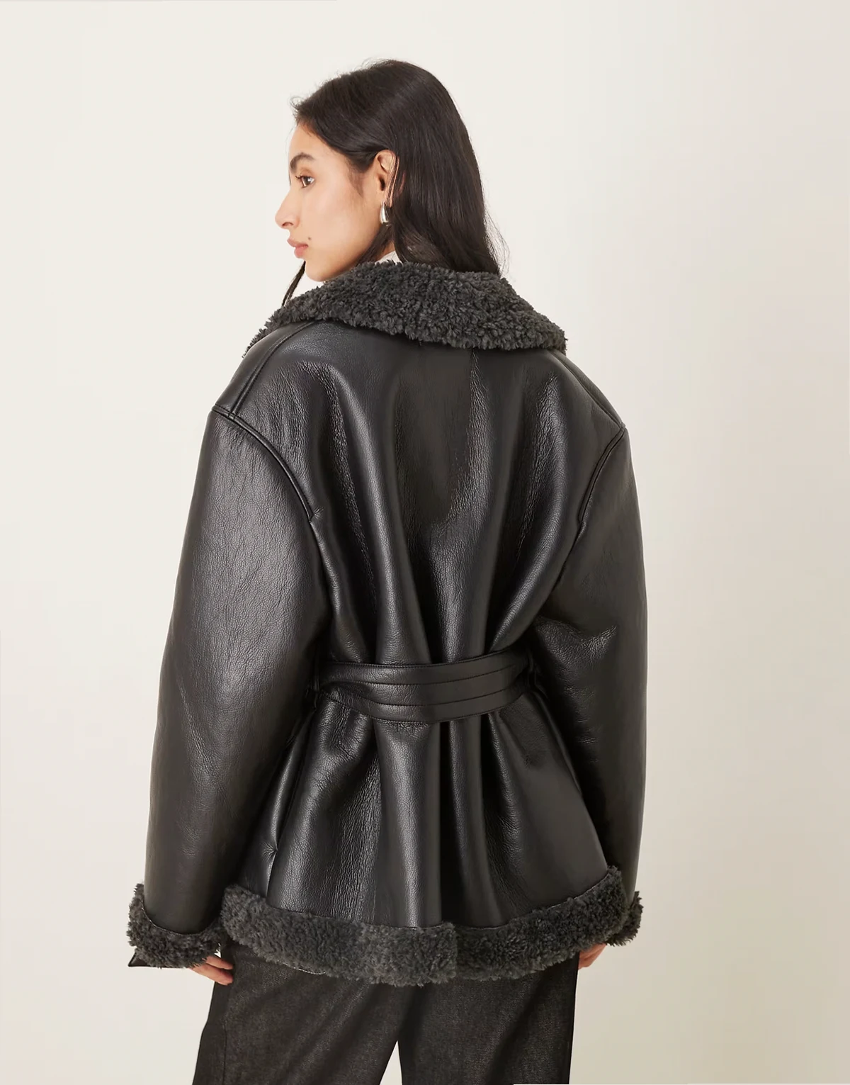 – Kurze Jacke aus Teddy-PU in Schwarz mit Gürtel und dunkelgrauen Kragenbesätzen