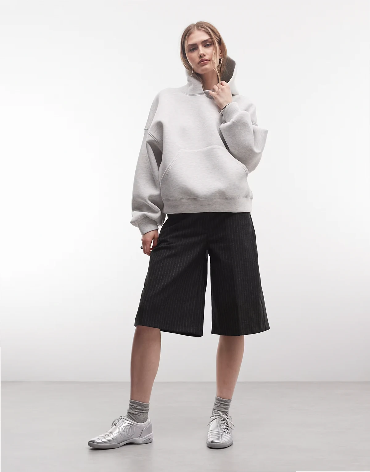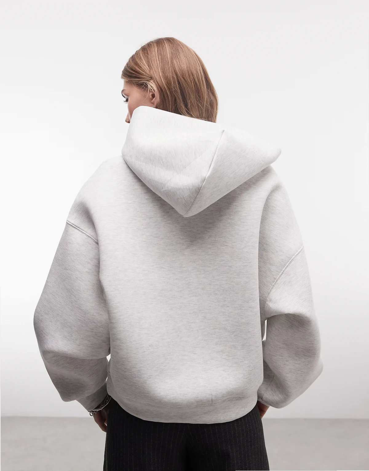– Petra – Oversize-Kapuzenpullover aus Stoff in Neopren-Optik in meliertem Hellgrau