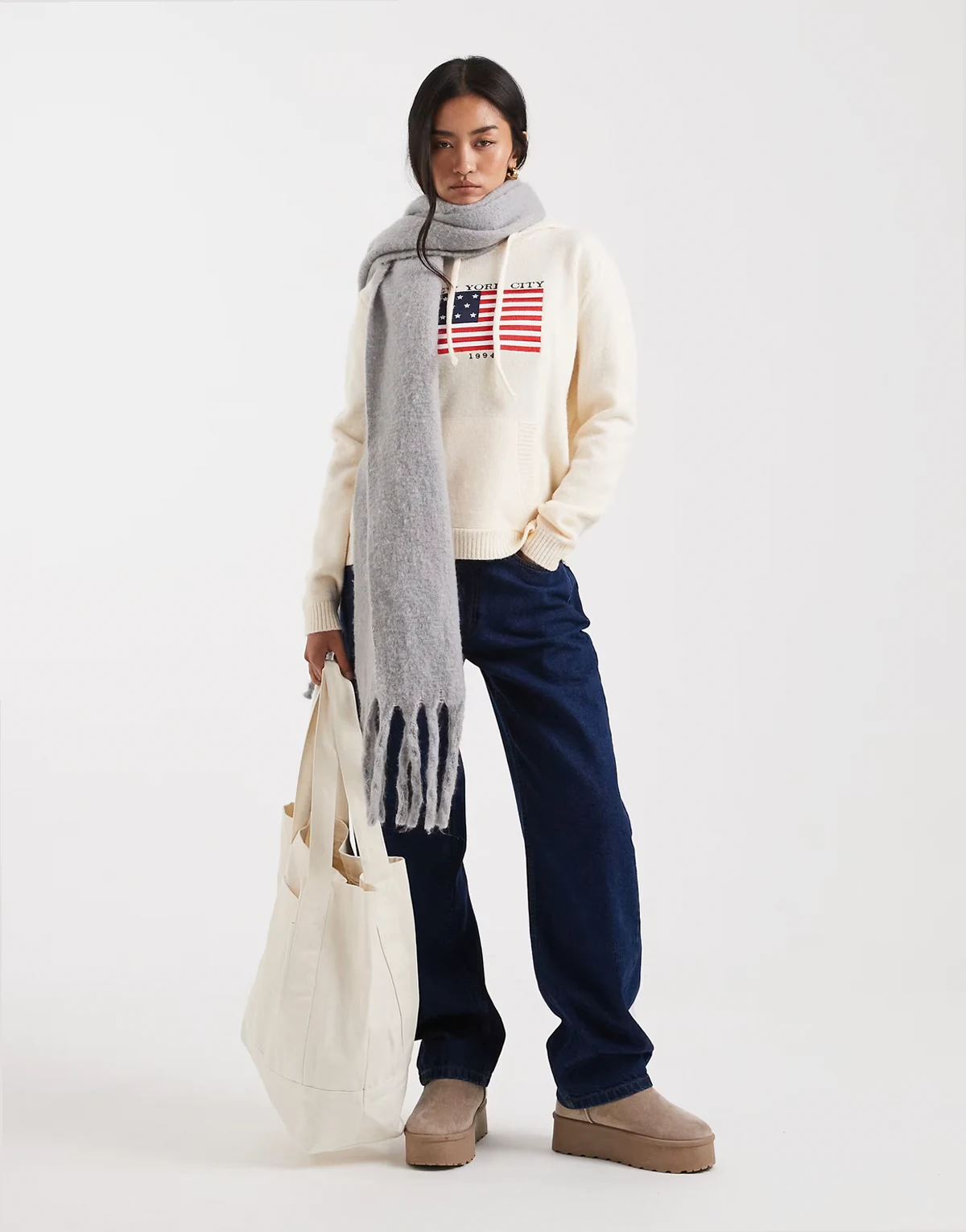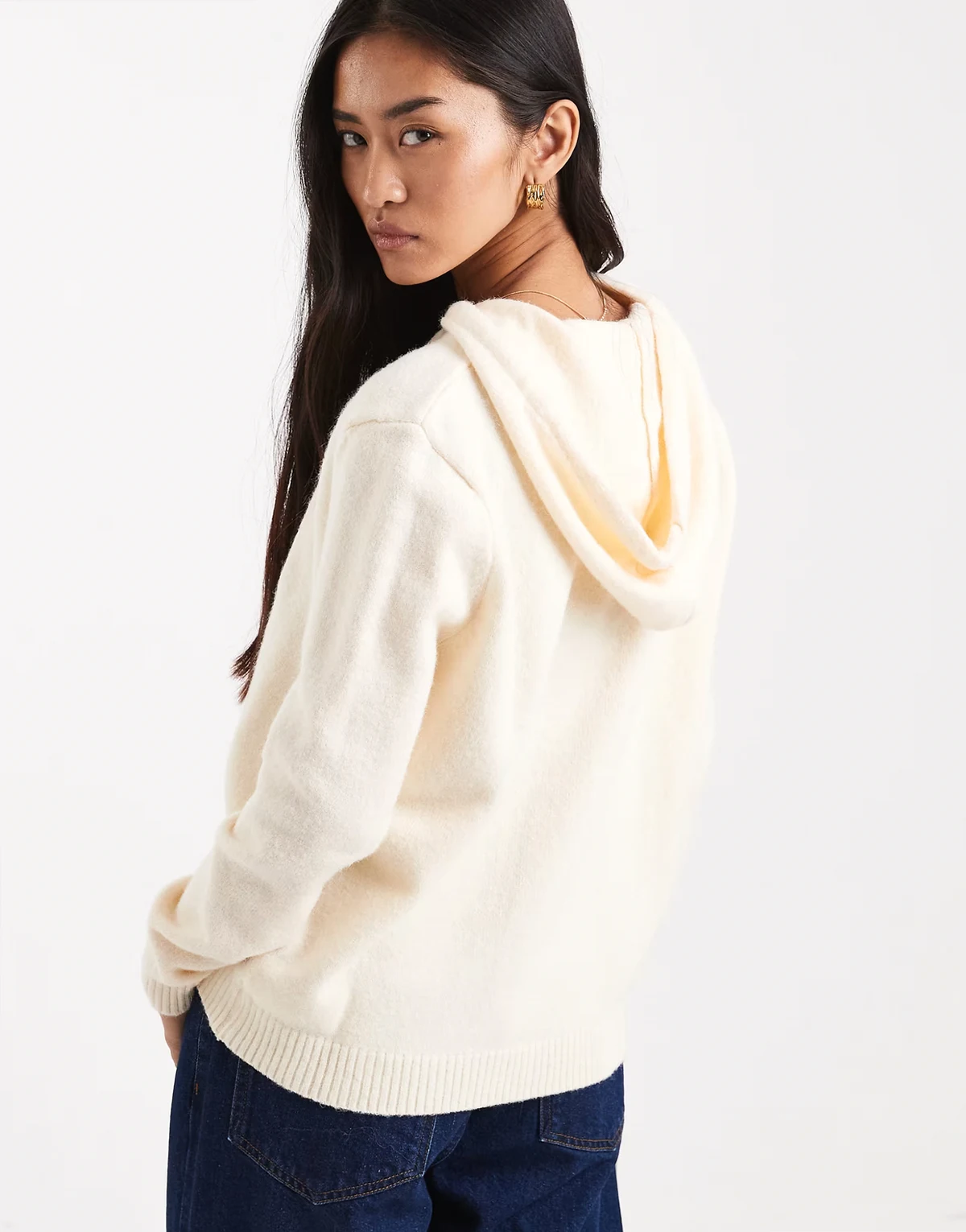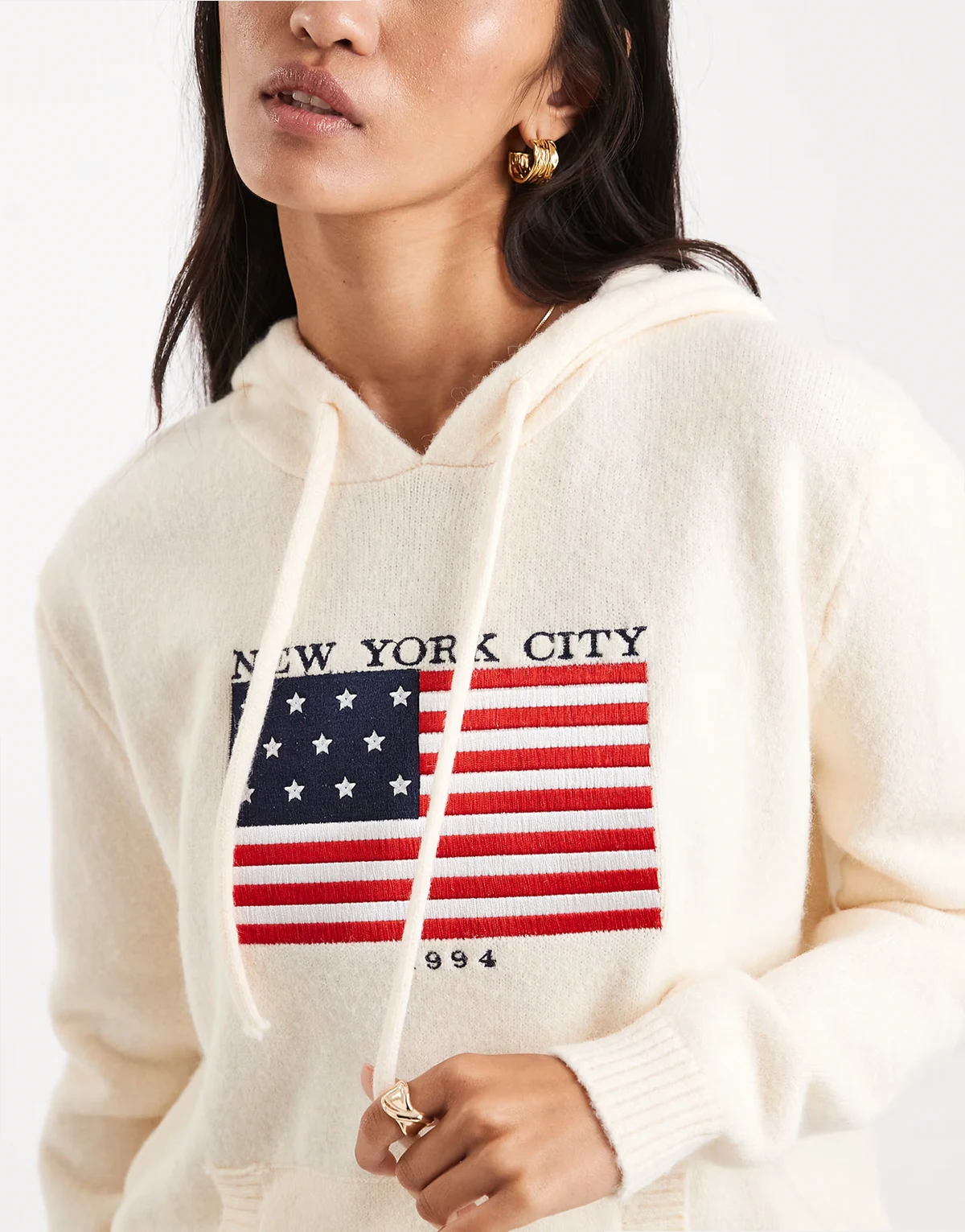 – Breit gerippter Kapuzenpullover in Creme mit Flaggen-Applikation und Stickerei