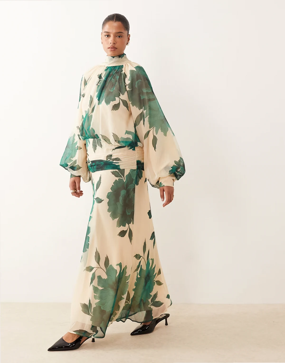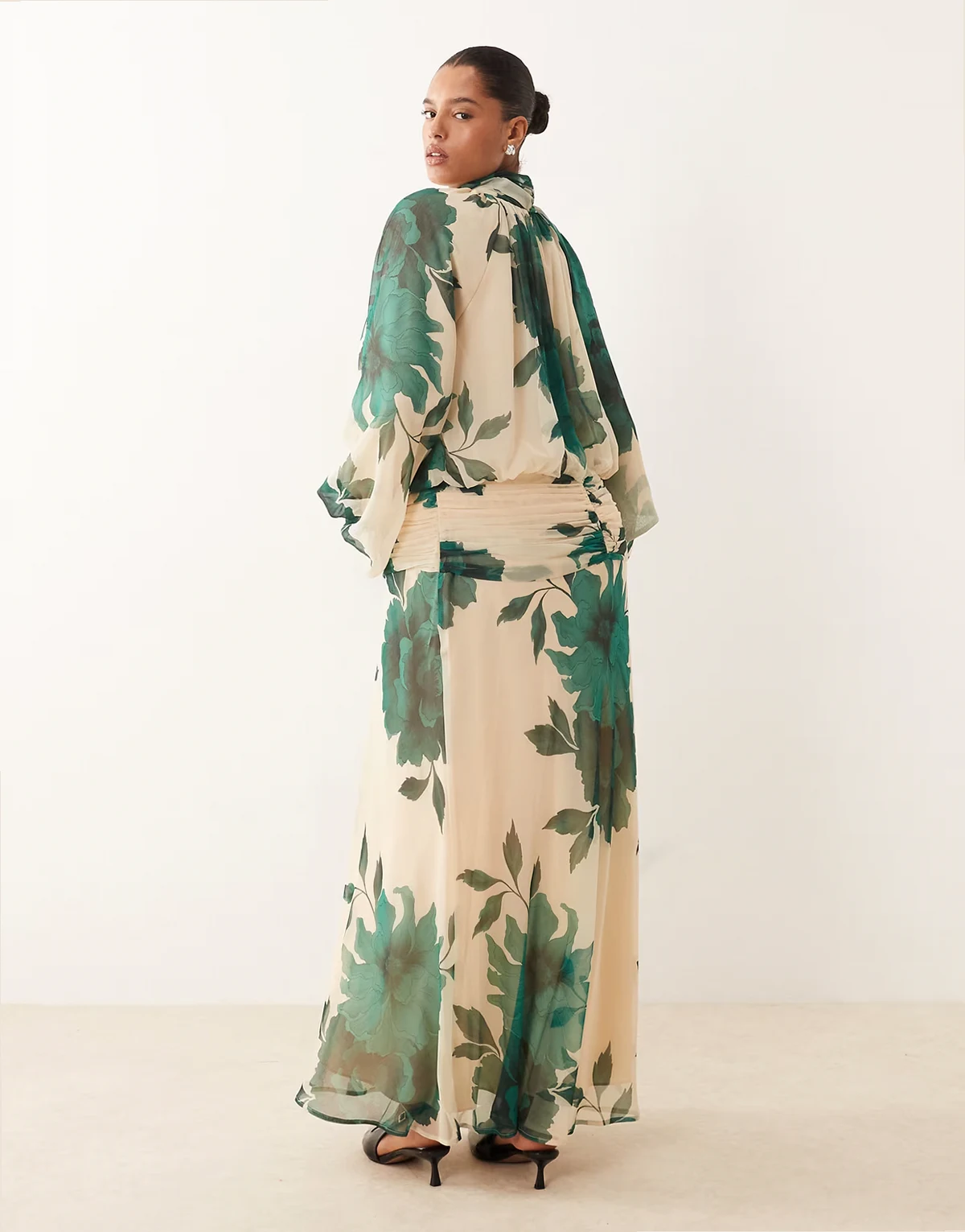 ASOS DESIGN Curve – Hochgeschlossenes, drapiertes Chiffon-Maxikleid mit grünem Blumenmuster und Bindeband am Hals